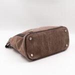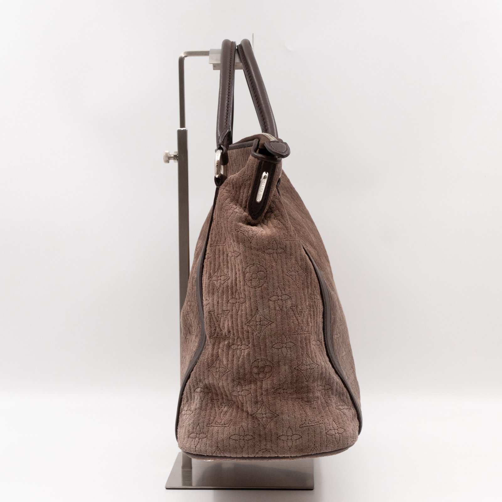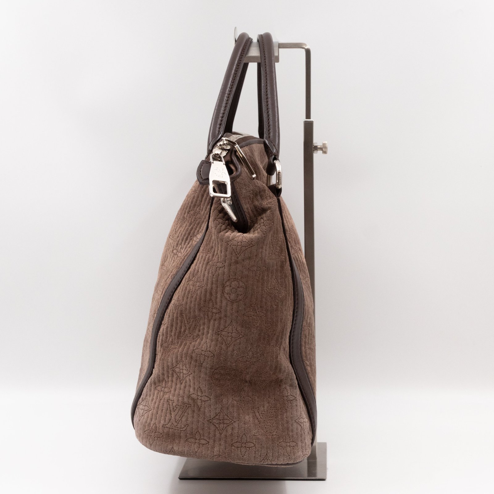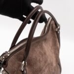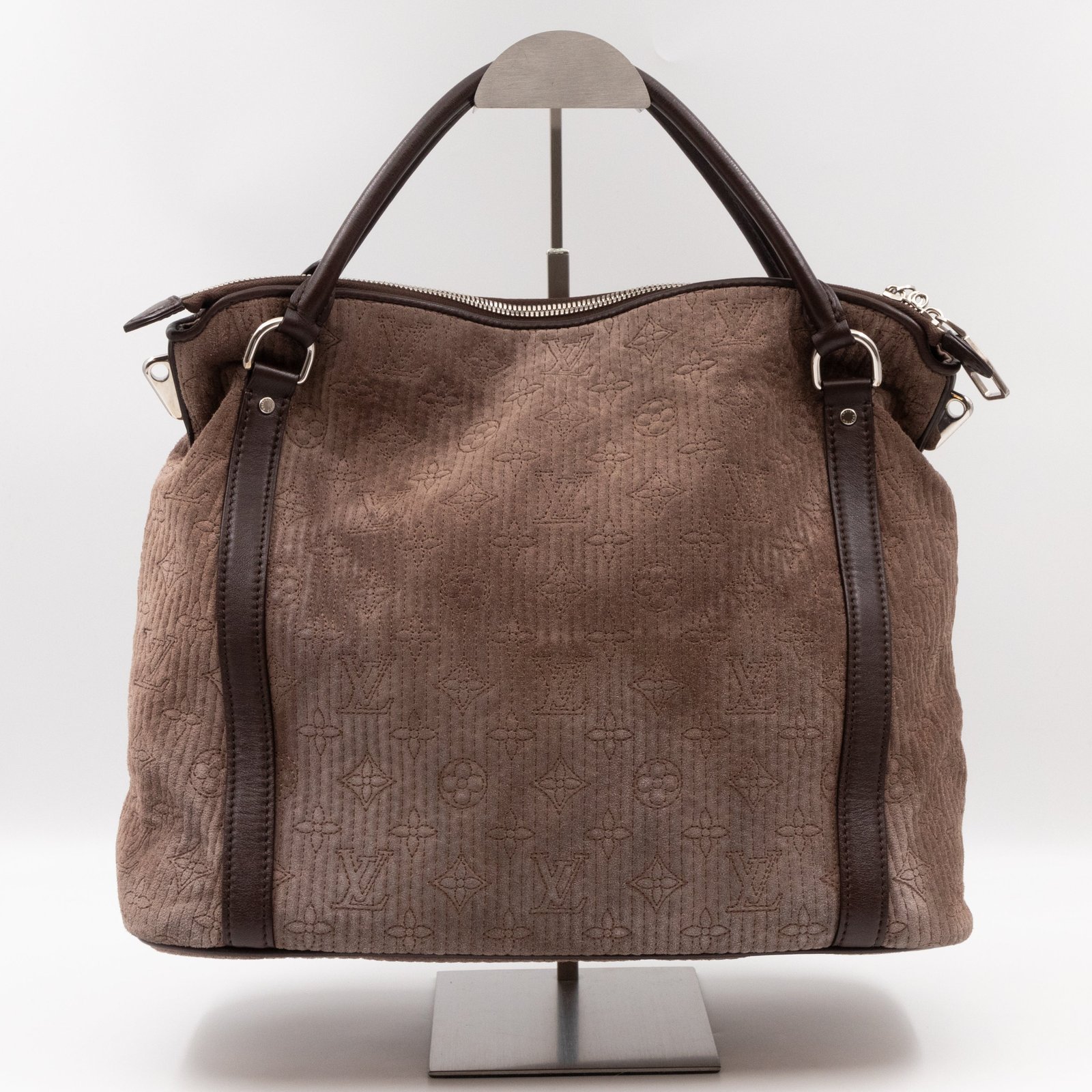 The Antheia Ixia PM is a medium sized two-way classic from Louis Vuitton. Made with brown suede monogram leather and silver-tone hardware. It features dark brown leather hand drops and a removable shoulder strap. Opens to matching smooth leather inside. Has enough space for work or daily use.