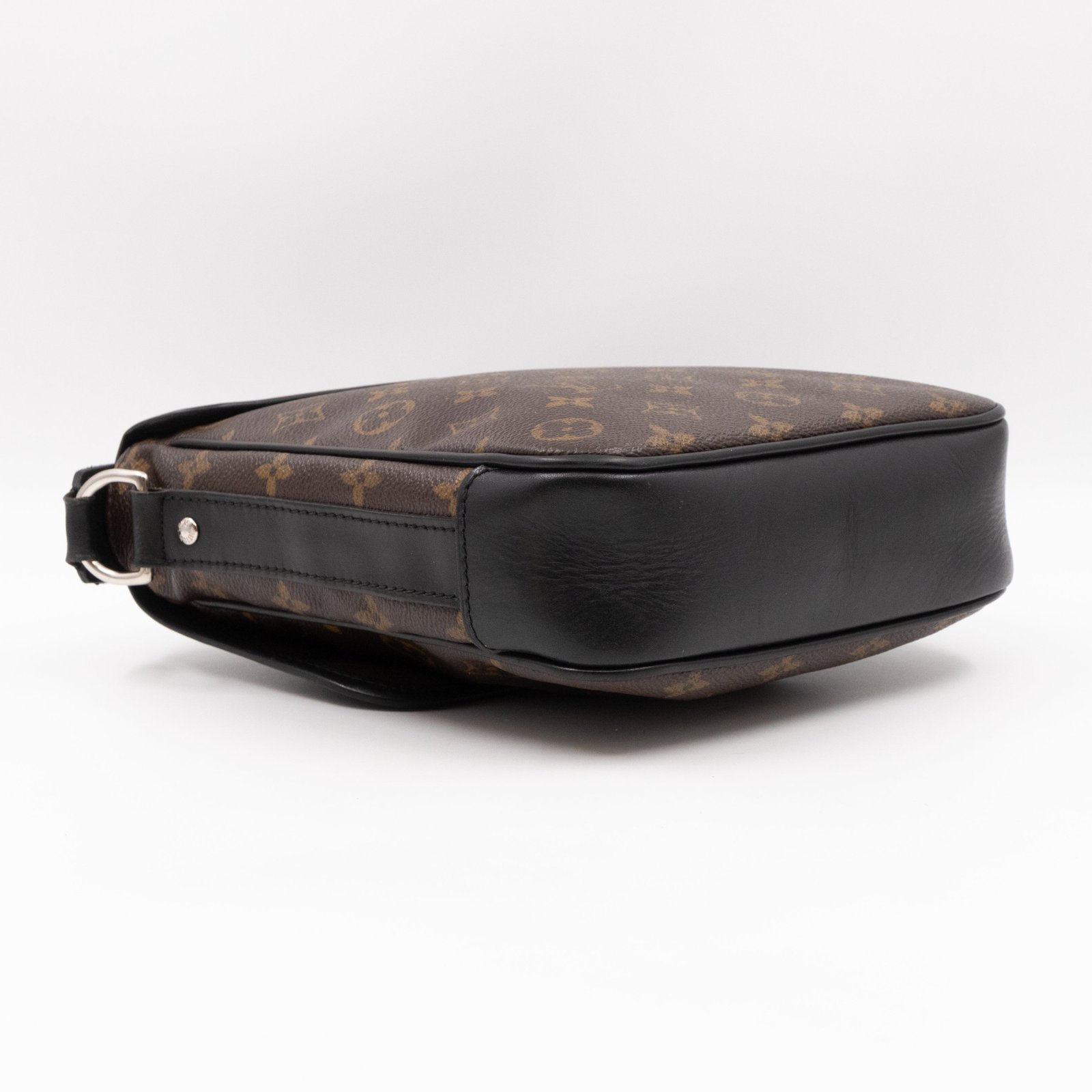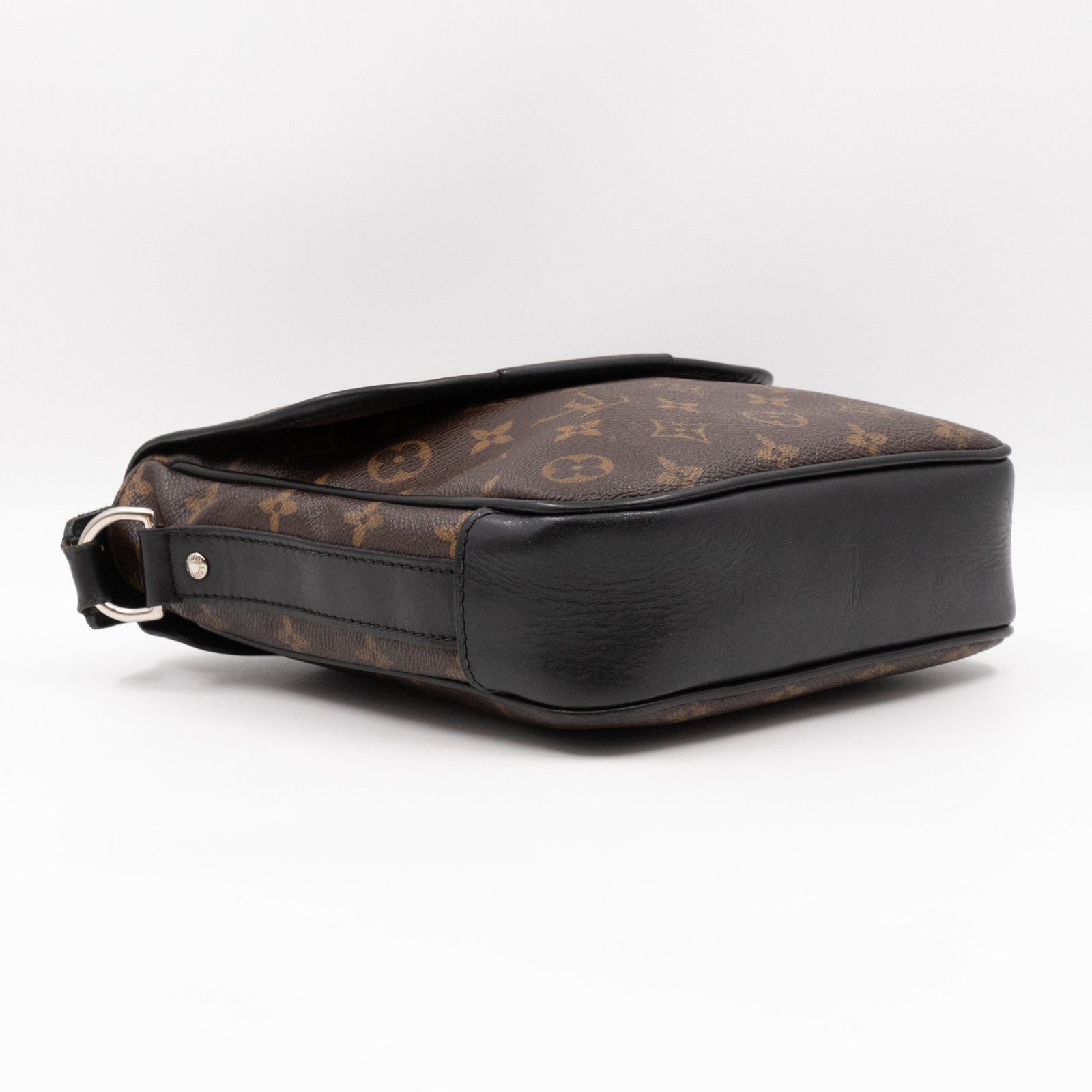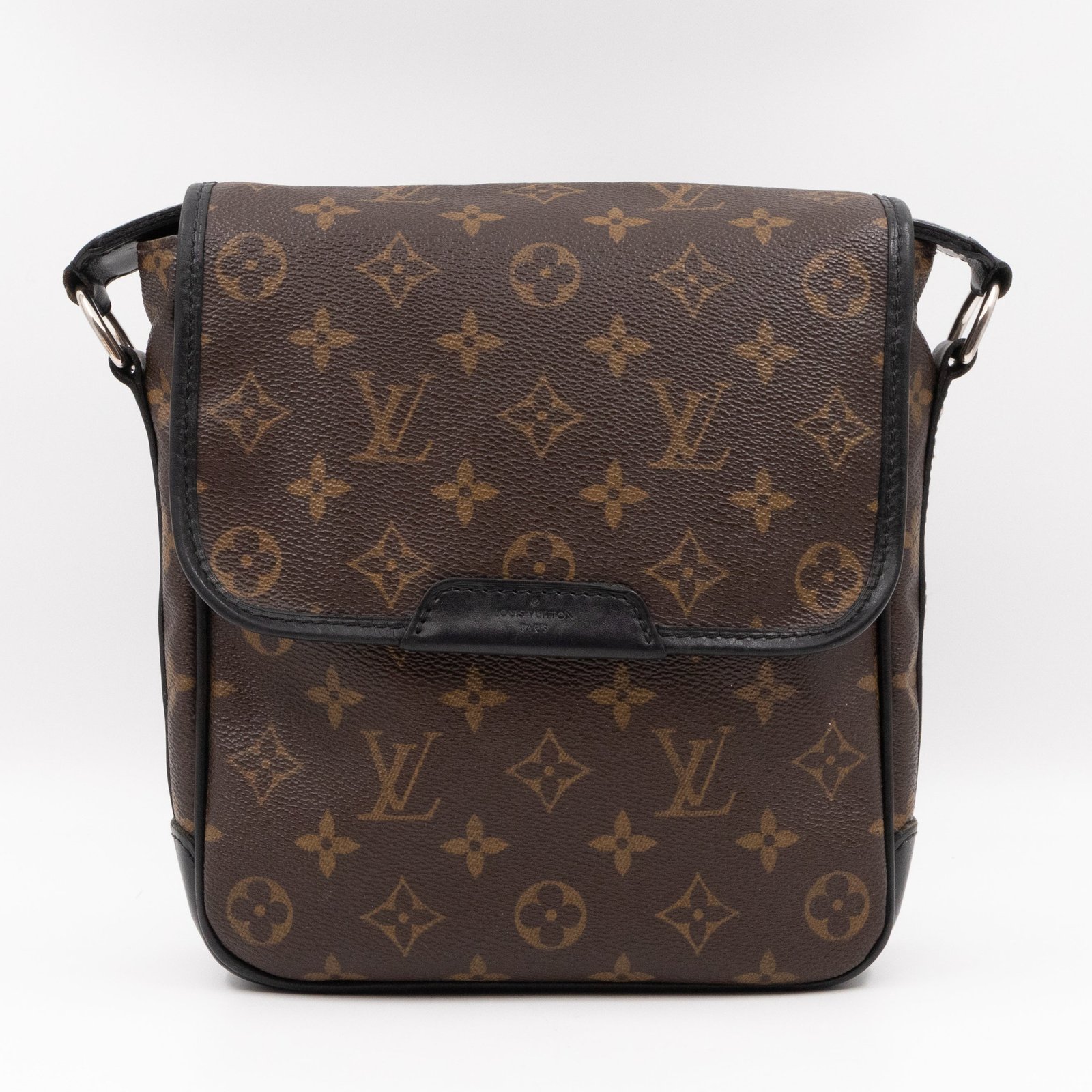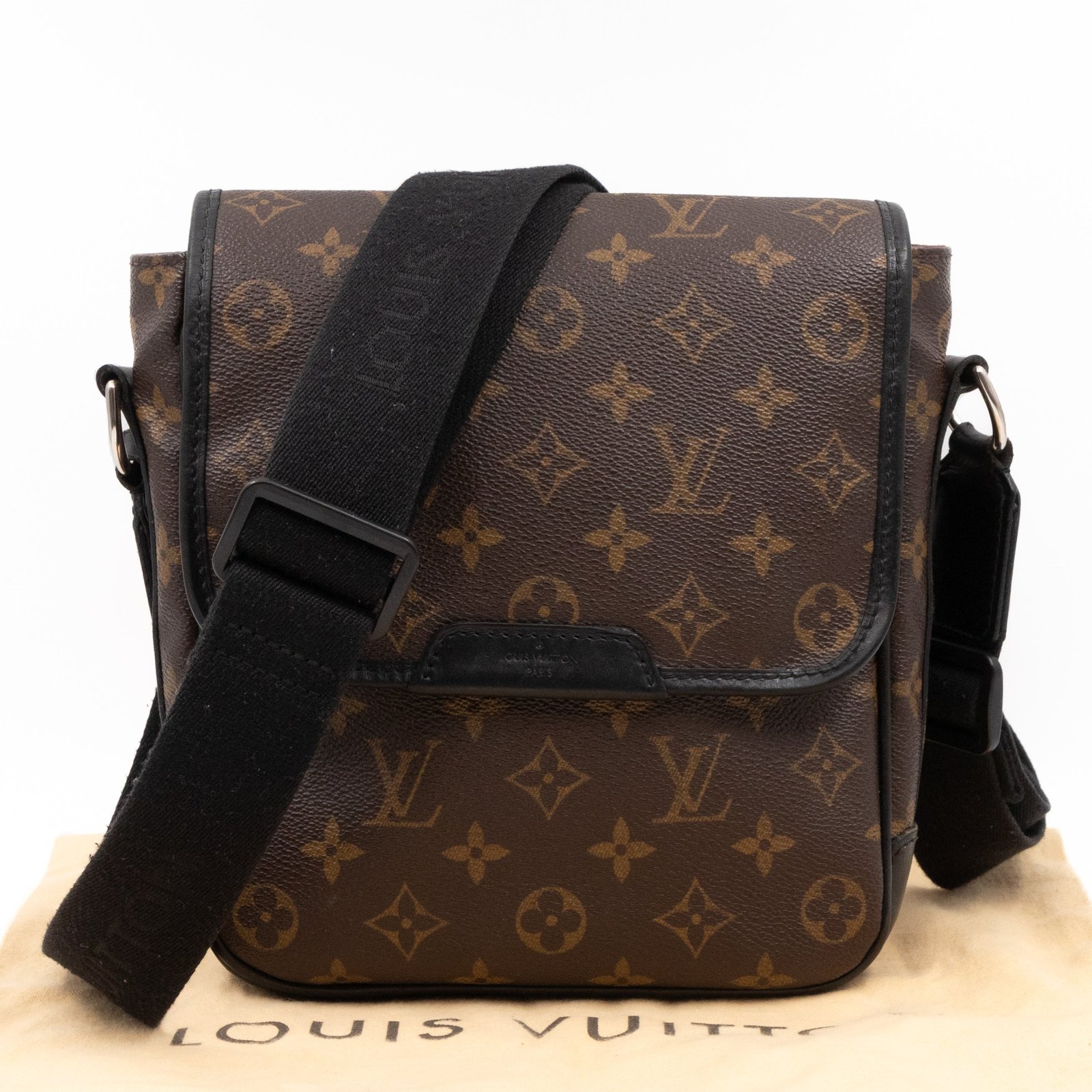 This is a Louis Vuitton Bass messenger bag in PM size. Made of monogram canvas, which combines with black accents. The bag features a black nylon adjustable shoulder strap with silver hardware and black leather trim. The frontal flap opens to a spacious burgundy fabric interior with patch pocket. Holds your daily essentials in style. Fabric shoulder strap for comfortable carrying.