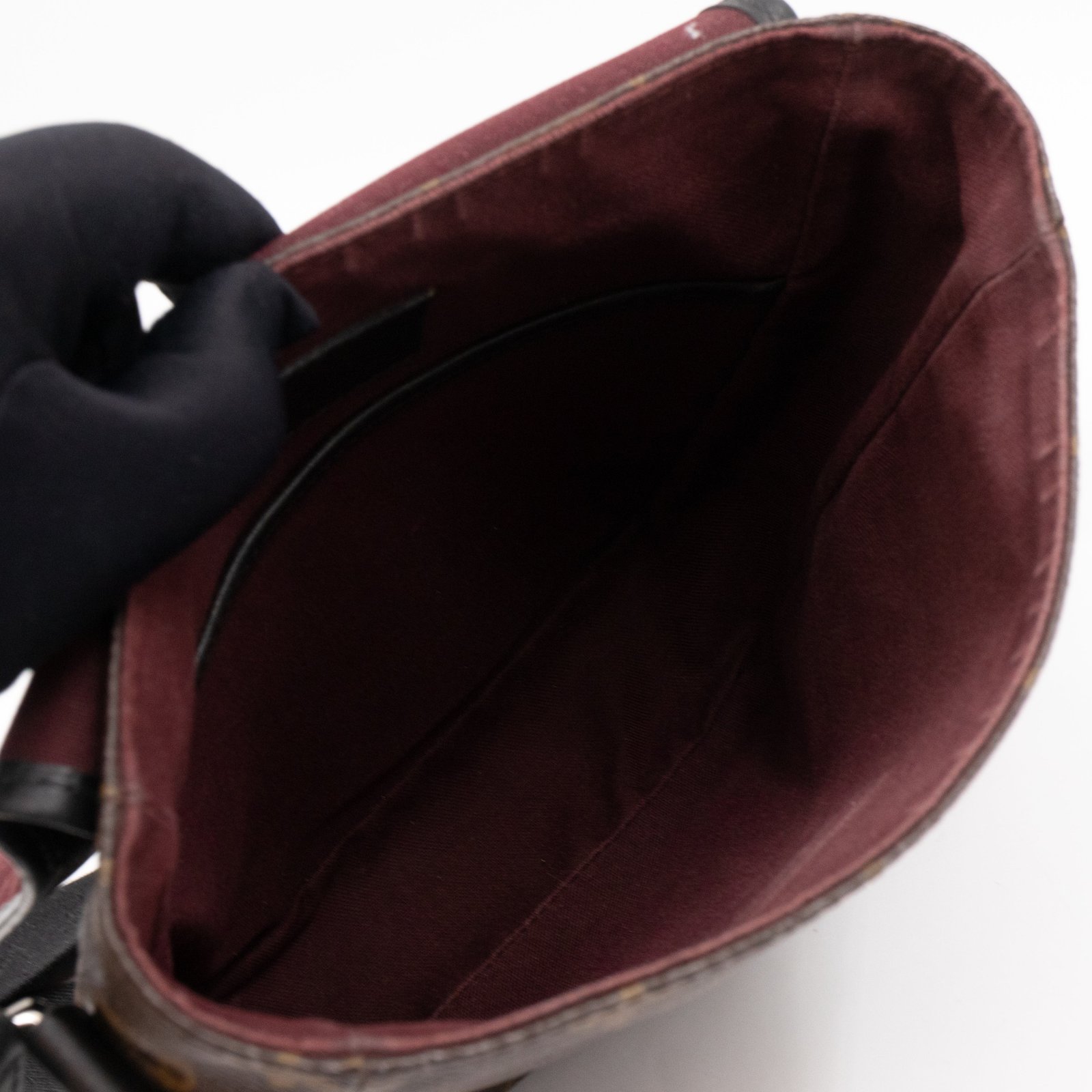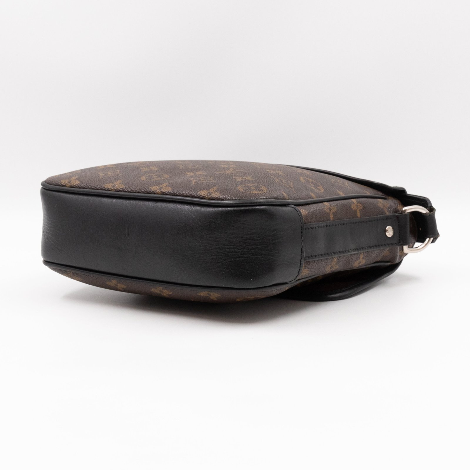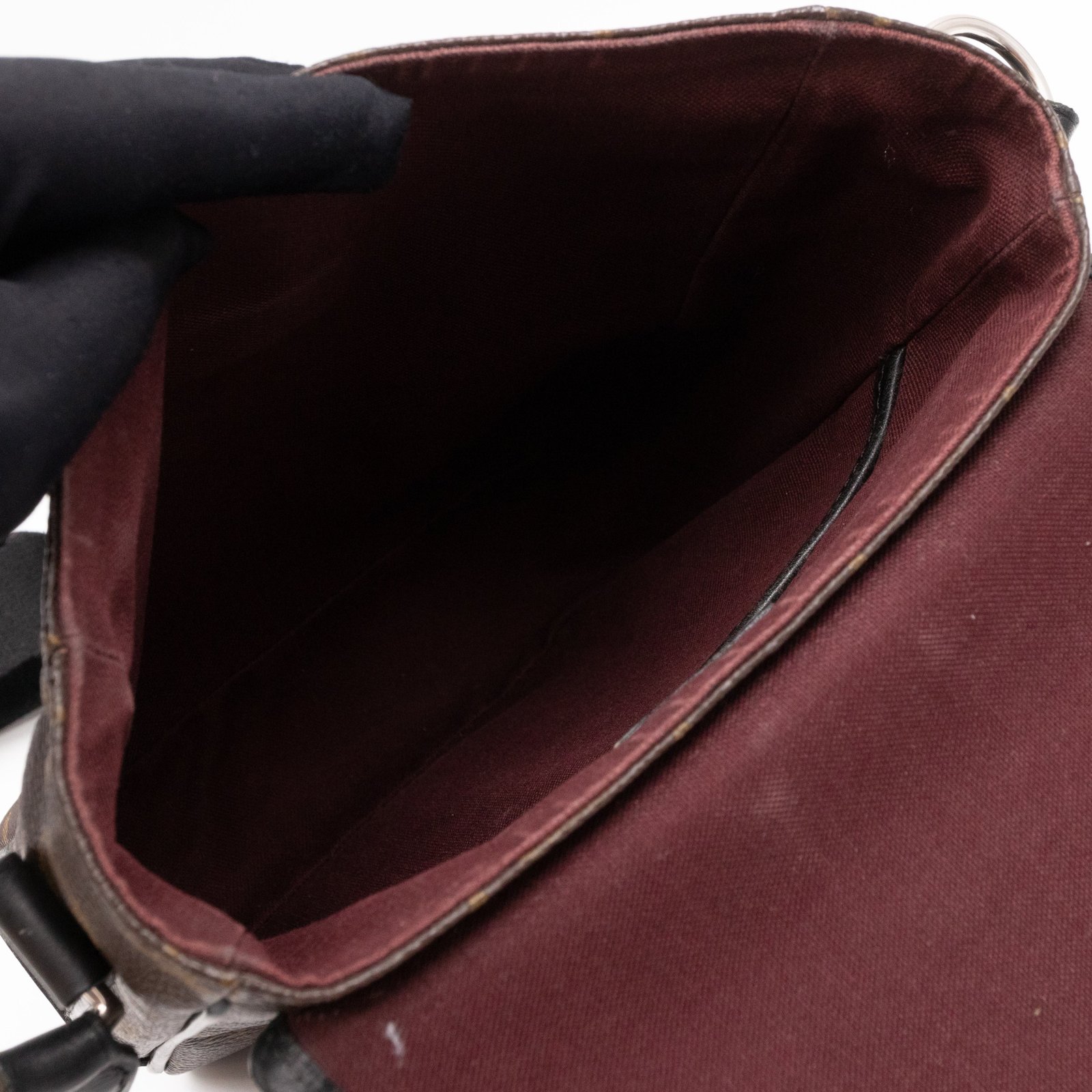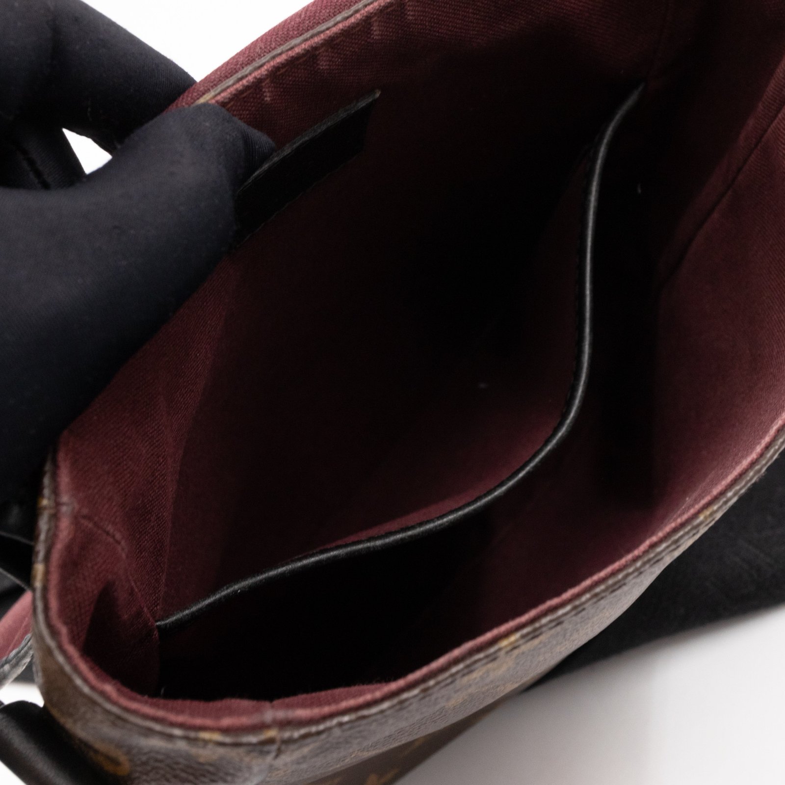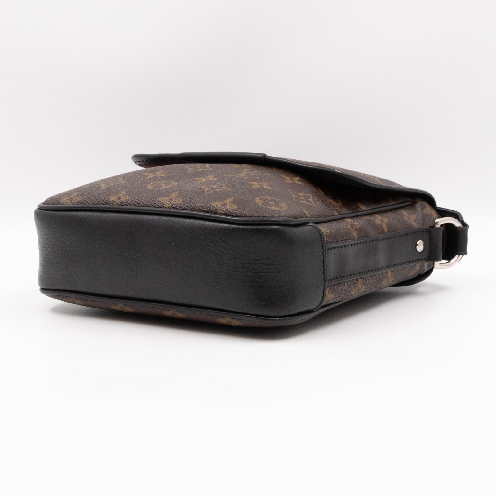 This is a Louis Vuitton Bass messenger bag in PM size. Made of monogram canvas, which combines with black accents. The bag features a black nylon adjustable shoulder strap with silver hardware and black leather trim. The frontal flap opens to a spacious burgundy fabric interior with patch pocket. Holds your daily essentials in style. Fabric shoulder strap for comfortable carrying.
