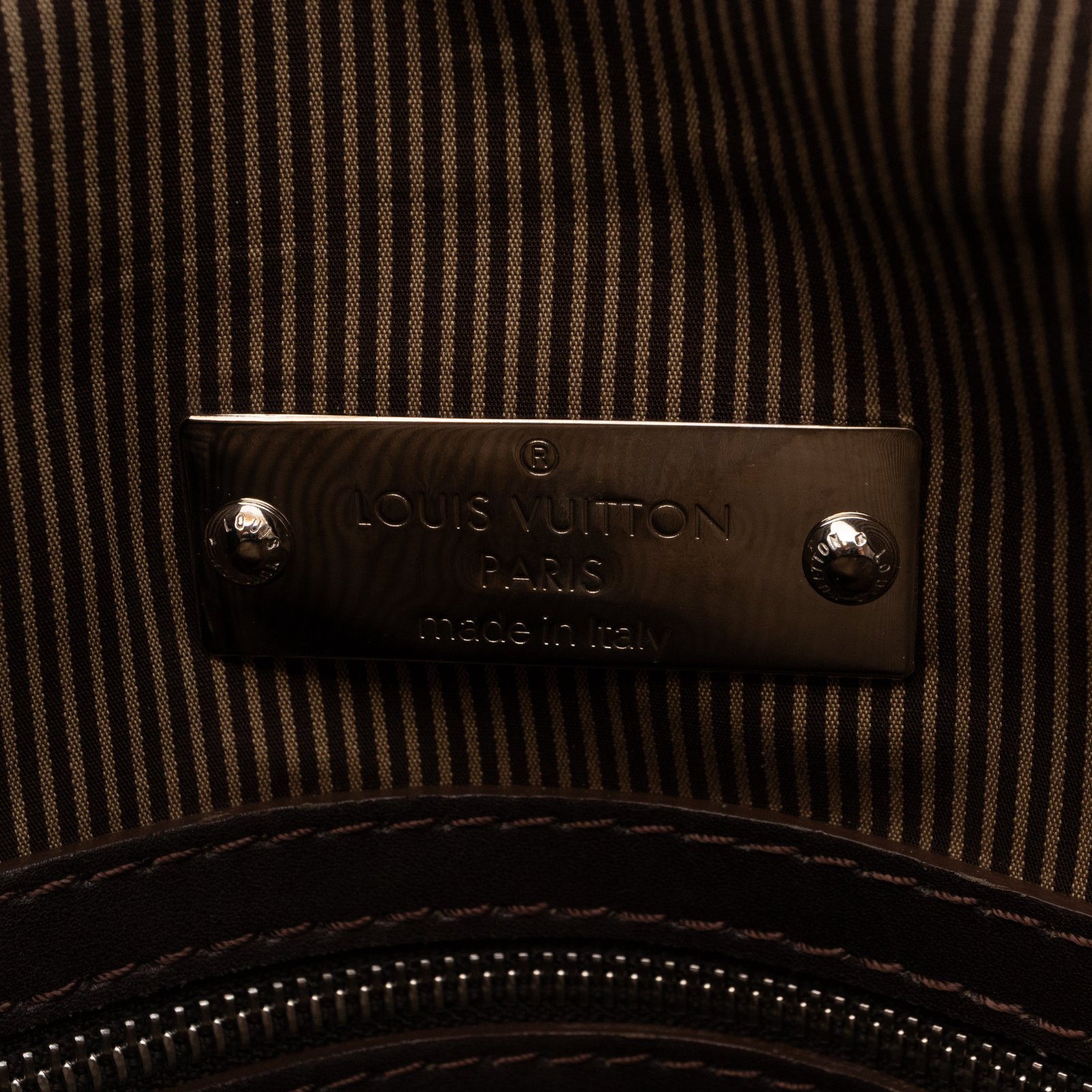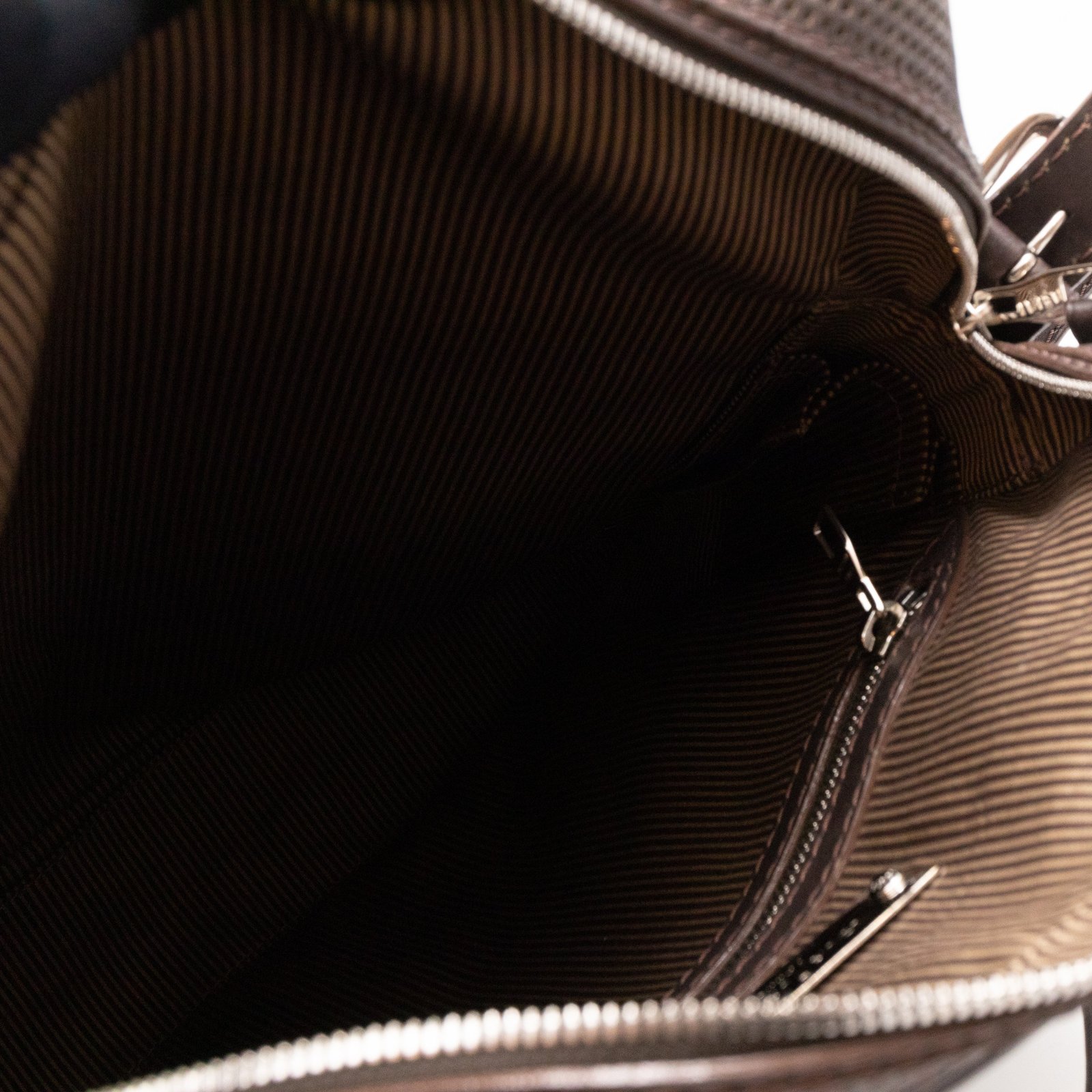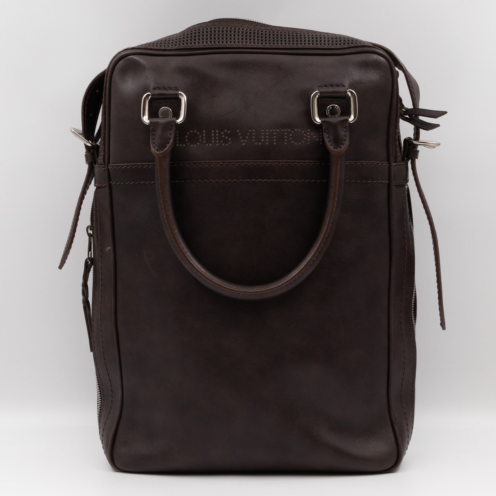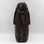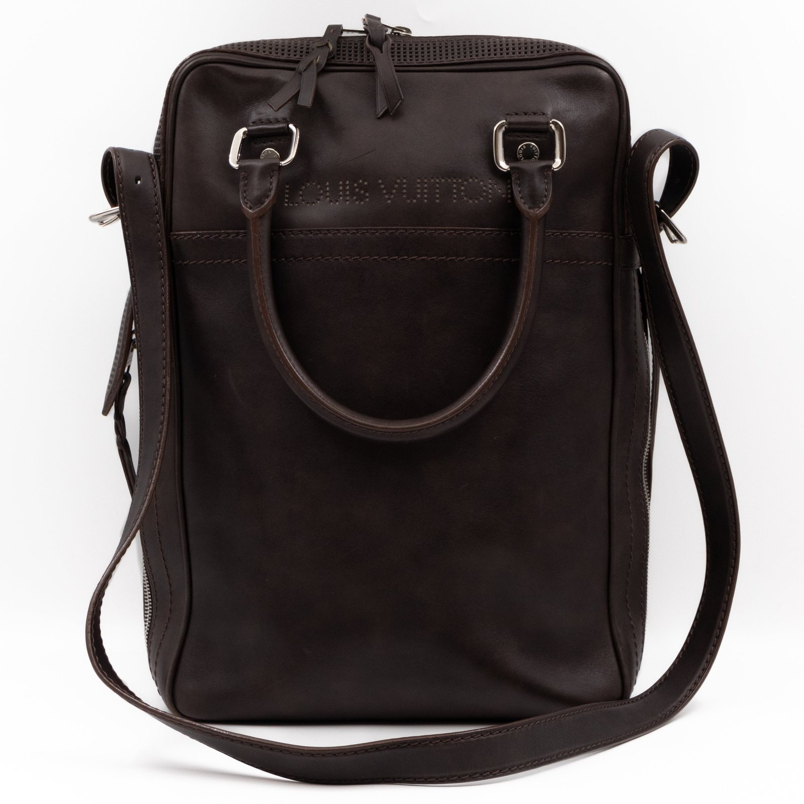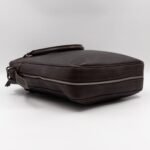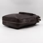 This is Louis Vuitton Bequia Porte Document Vertical messenger bag. Made in brown leather. The bag a frontal Louis Vuitton print logo with a large patch pocket on the back and a shoulder strap with silver hardware. On the side has zip around detail can open to expand the base of the bag. The top zipper opens to a striped fabric interior. Has a slim pocket on the back. Holds your daily items and even fits a large laptop in style.