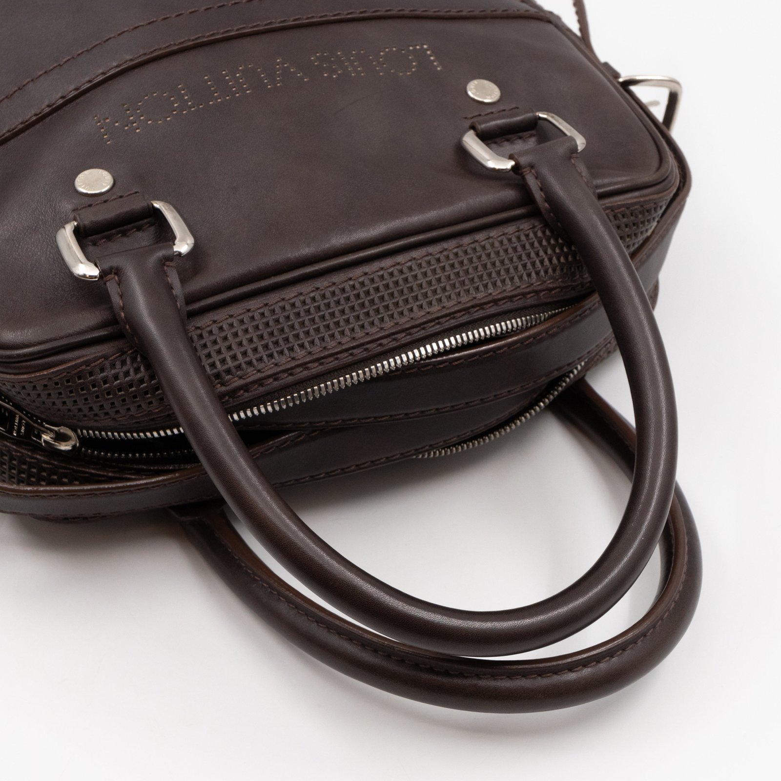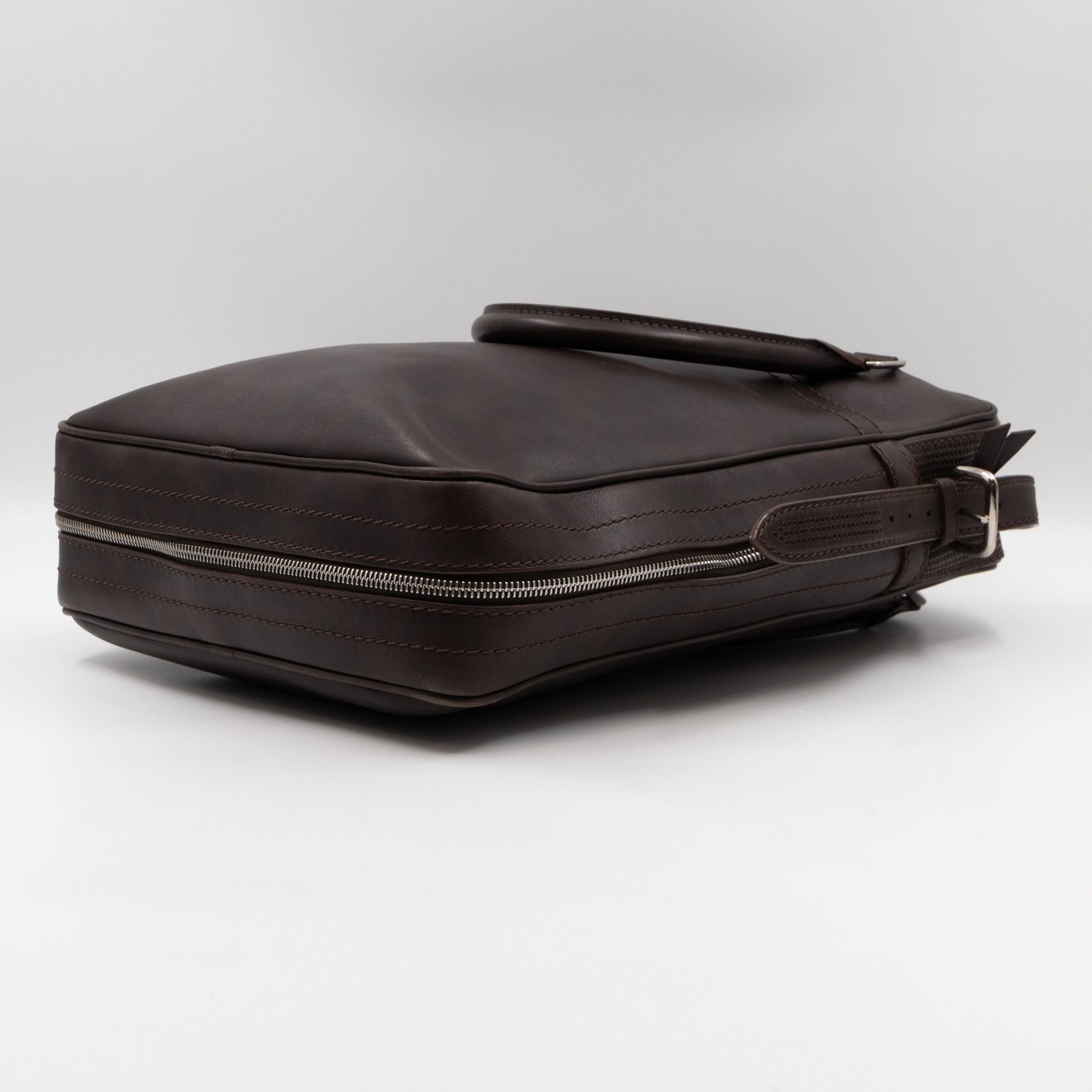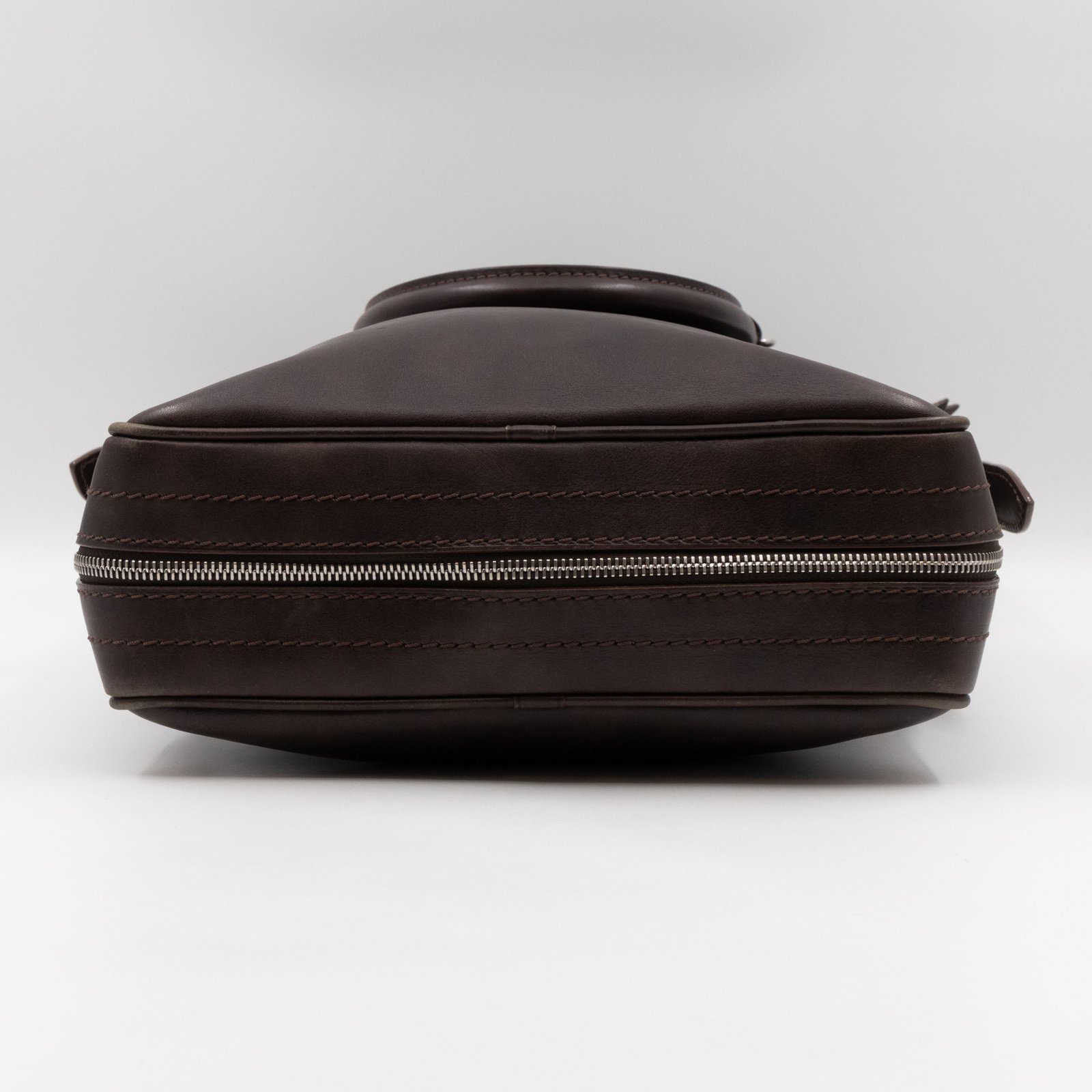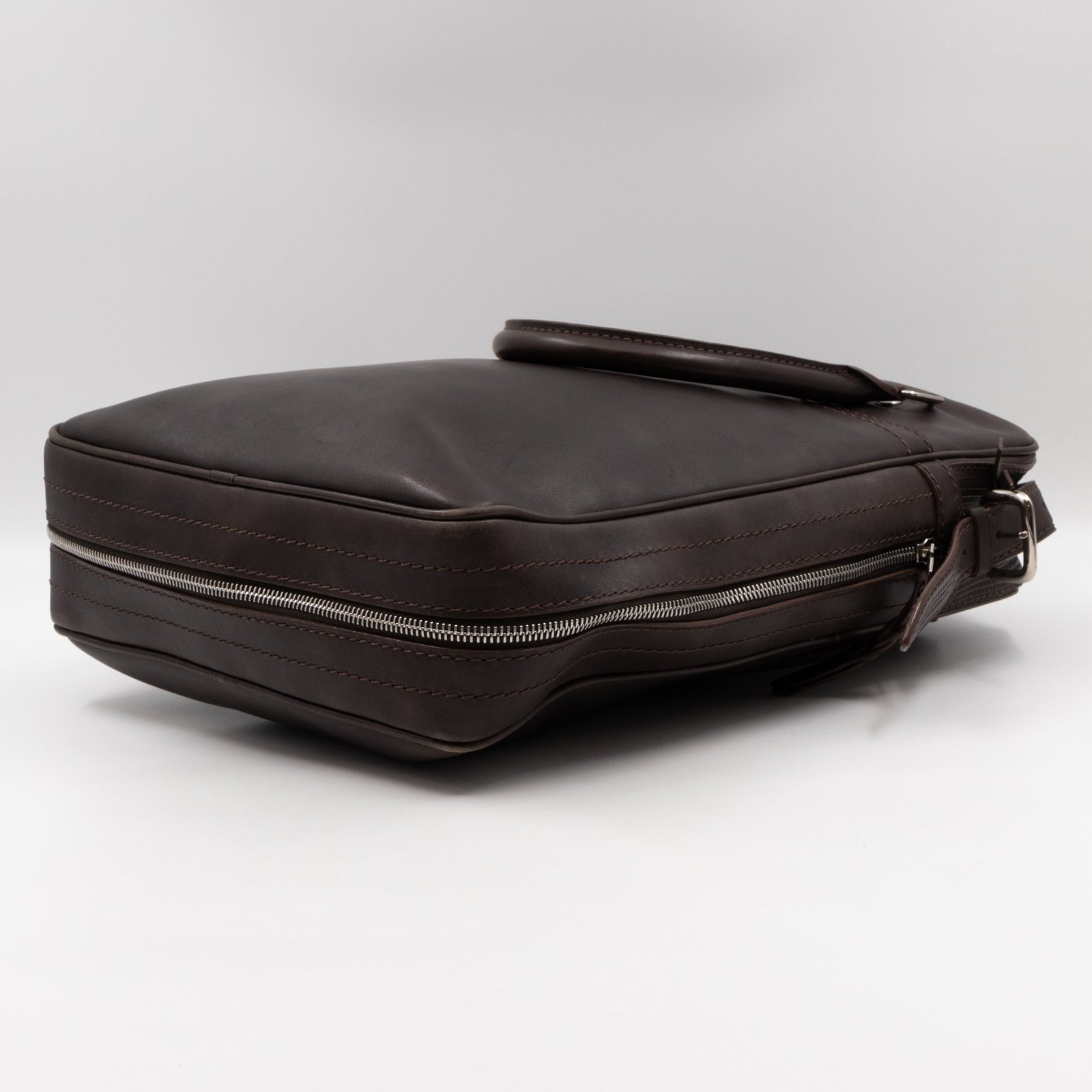 This is Louis Vuitton Bequia Porte Document Vertical messenger bag. Made in brown leather. The bag a frontal Louis Vuitton print logo with a large patch pocket on the back and a shoulder strap with silver hardware. On the side has zip around detail can open to expand the base of the bag. The top zipper opens to a striped fabric interior. Has a slim pocket on the back. Holds your daily items and even fits a large laptop in style.