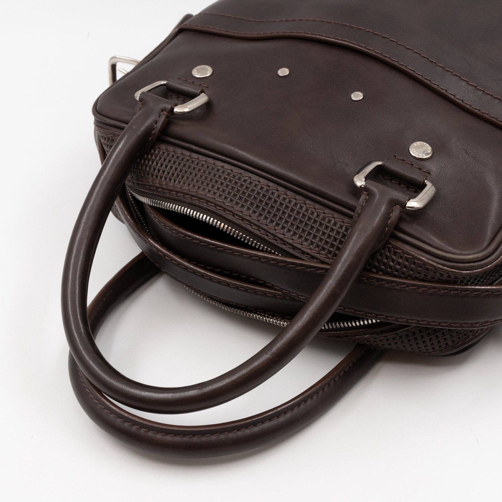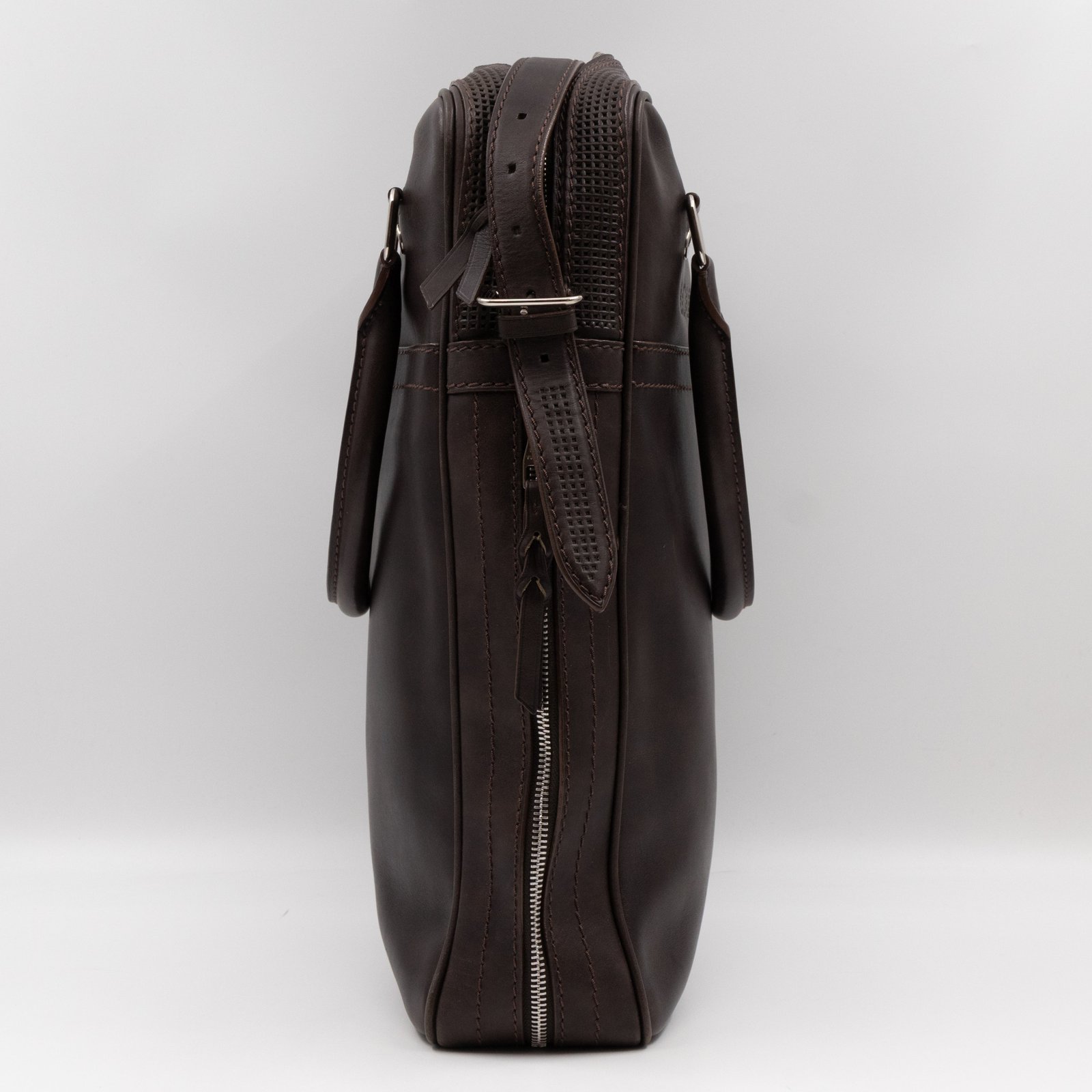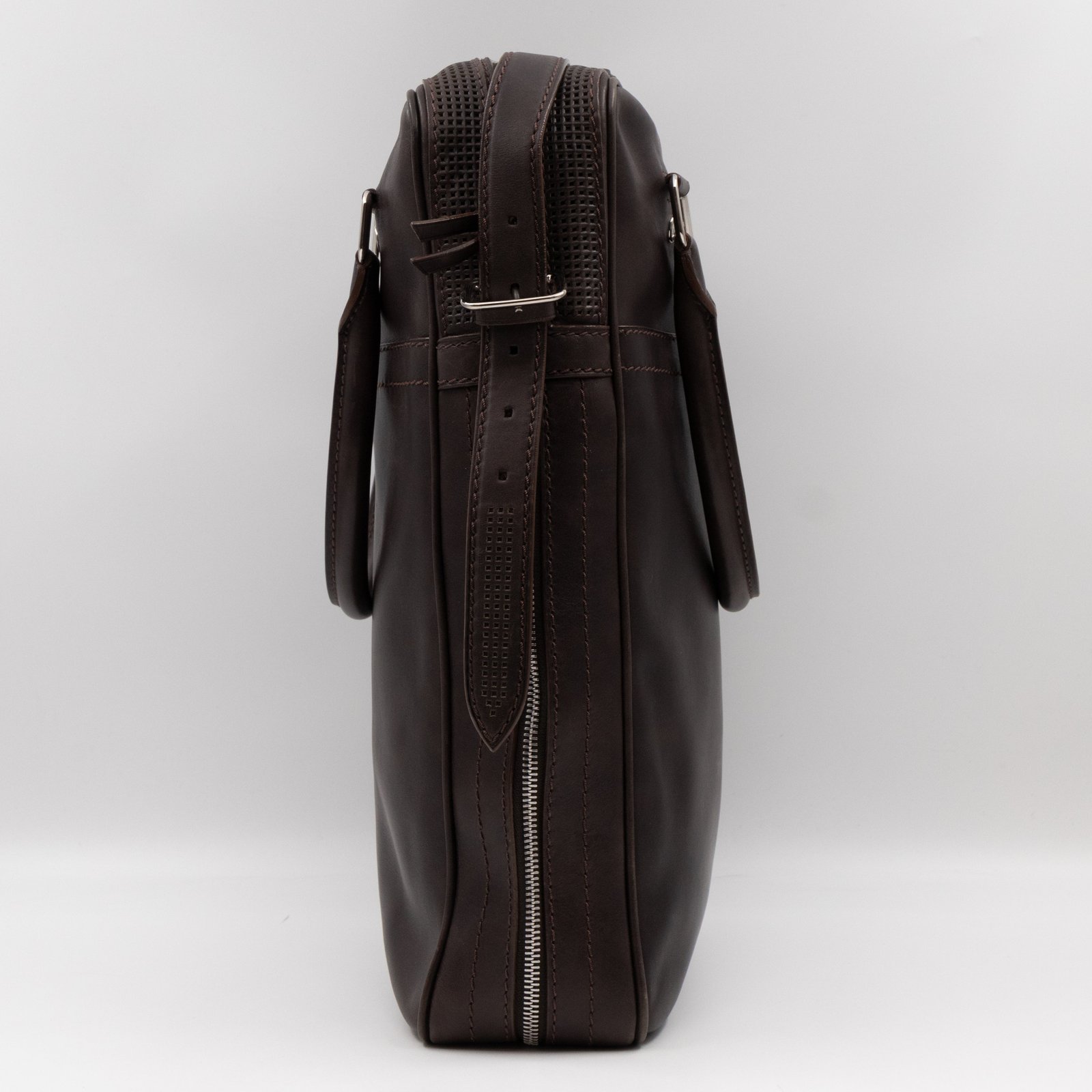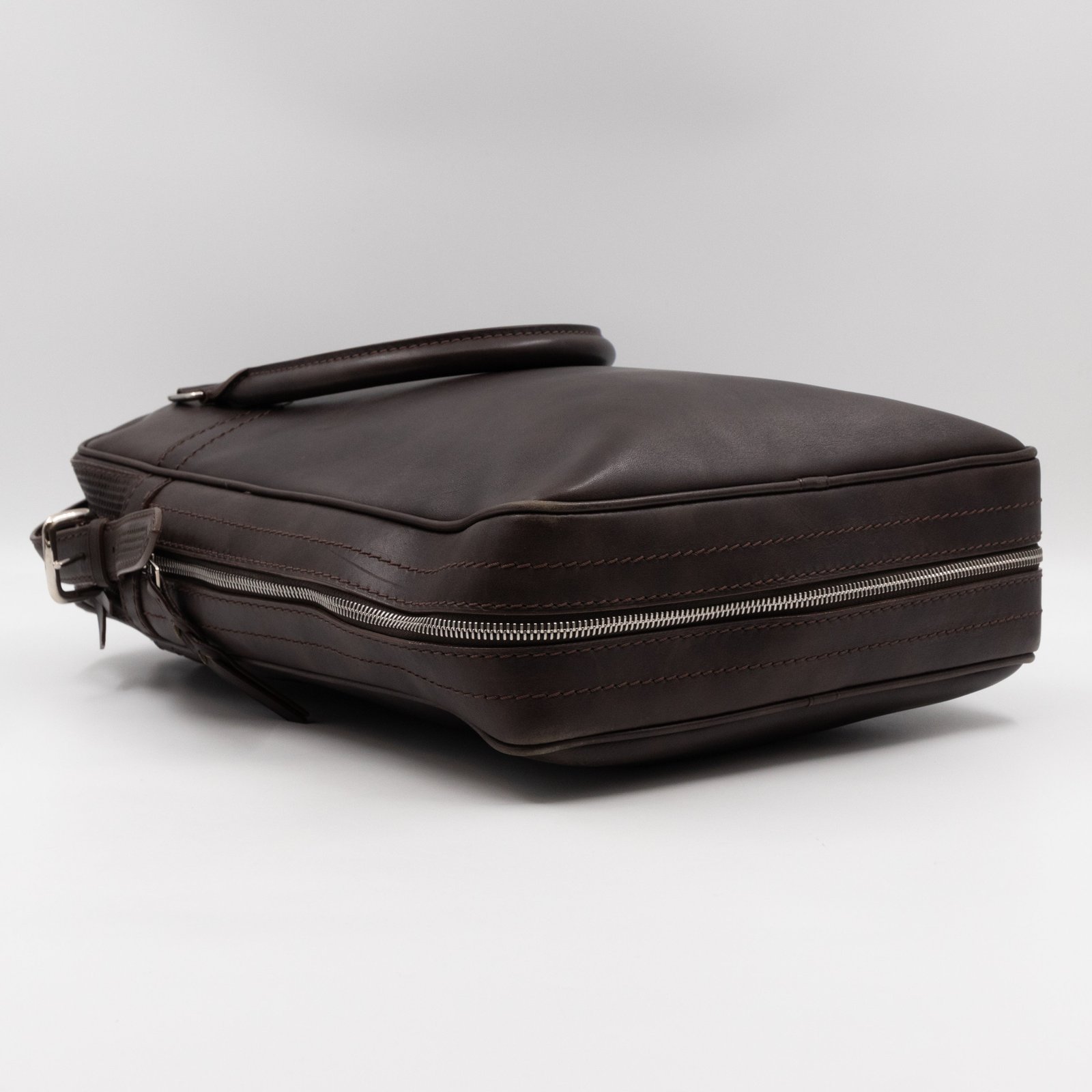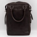 This is Louis Vuitton Bequia Porte Document Vertical messenger bag. Made in brown leather. The bag a frontal Louis Vuitton print logo with a large patch pocket on the back and a shoulder strap with silver hardware. On the side has zip around detail can open to expand the base of the bag. The top zipper opens to a striped fabric interior. Has a slim pocket on the back. Holds your daily items and even fits a large laptop in style.