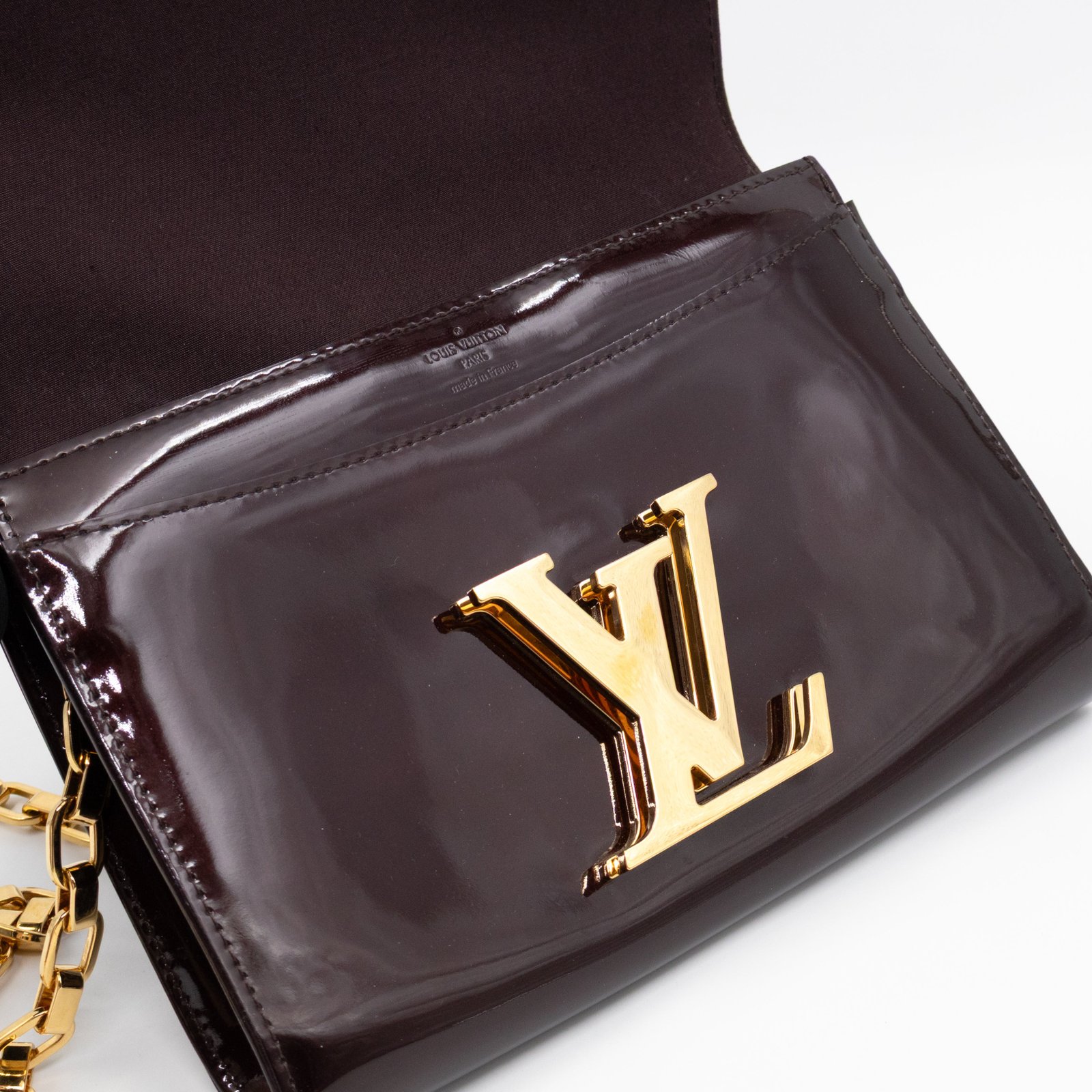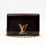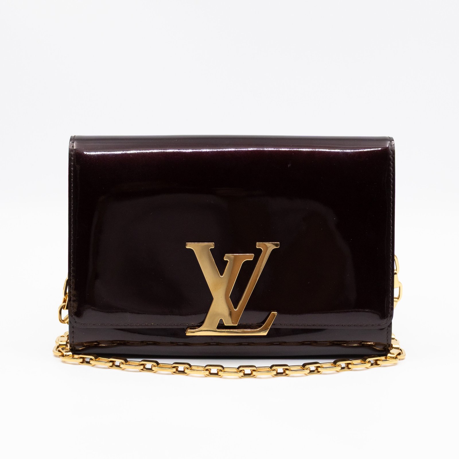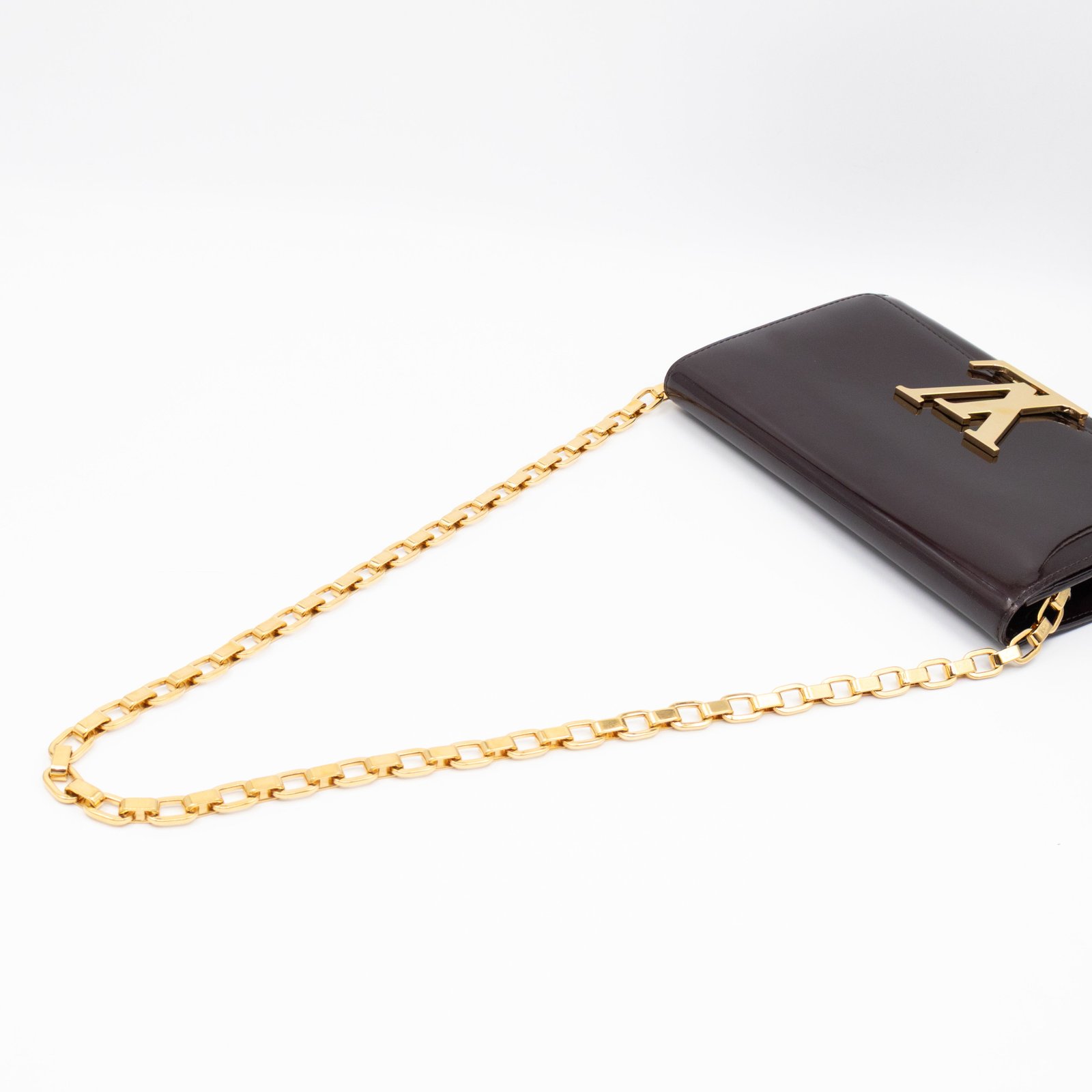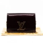 Alluring amarante Chain Louise GM by Louis Vuitton. This pochette on chain is made with beautiful amarante vernis leather and gold-tone hardware. Convertible to a clutch for evening use. Slim pockets under the flap and inside a zipper pocket.