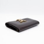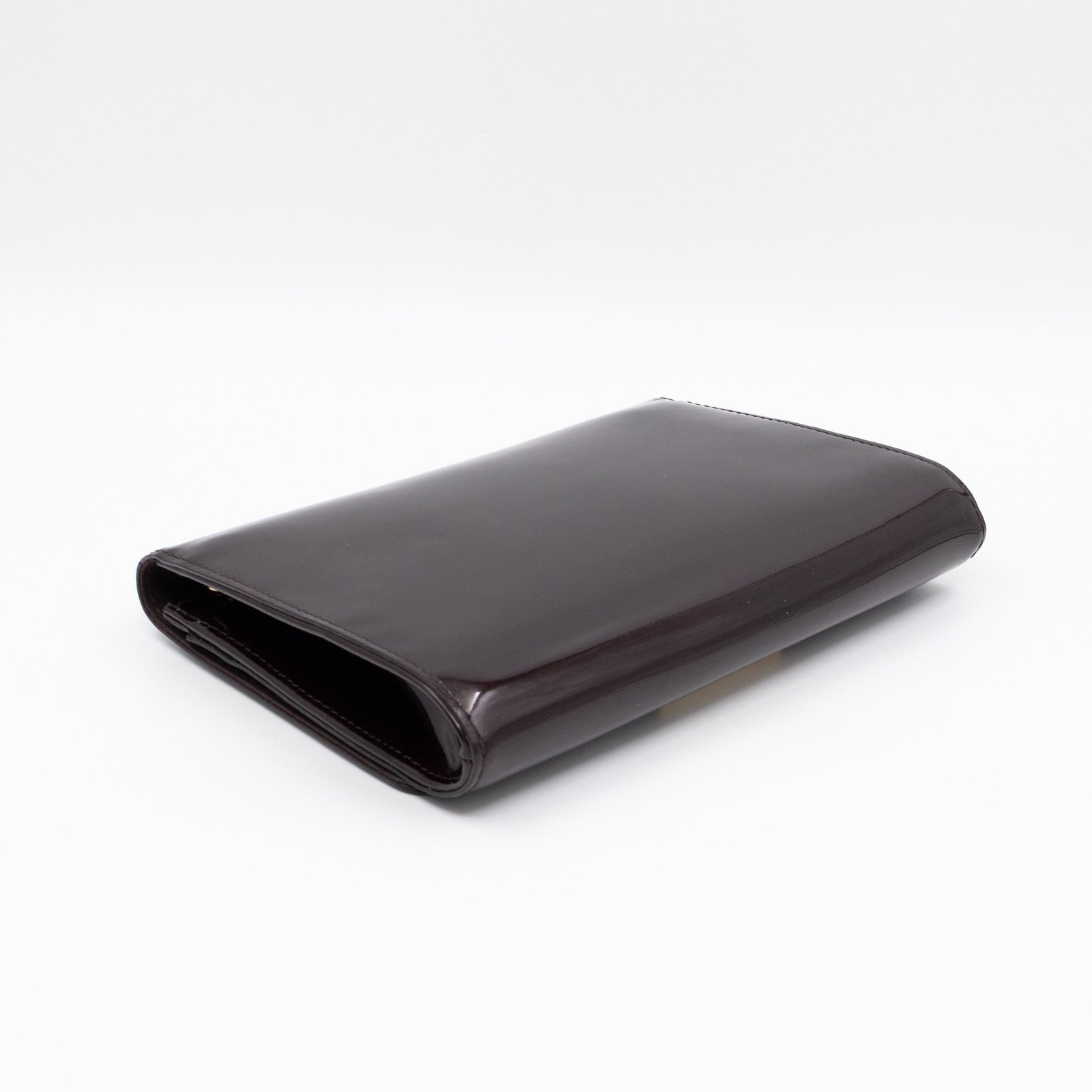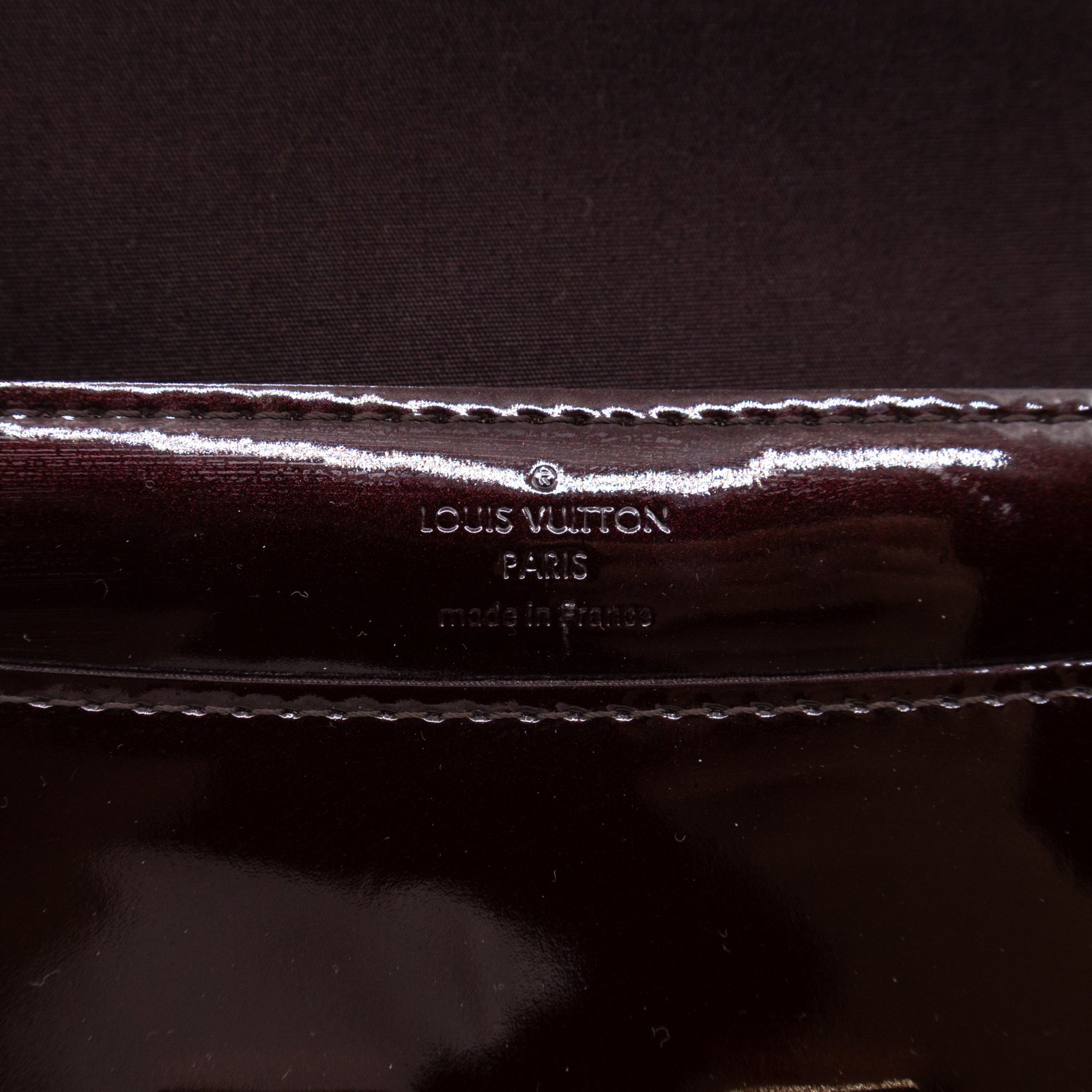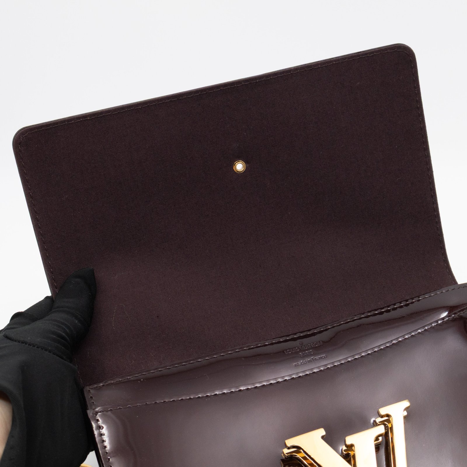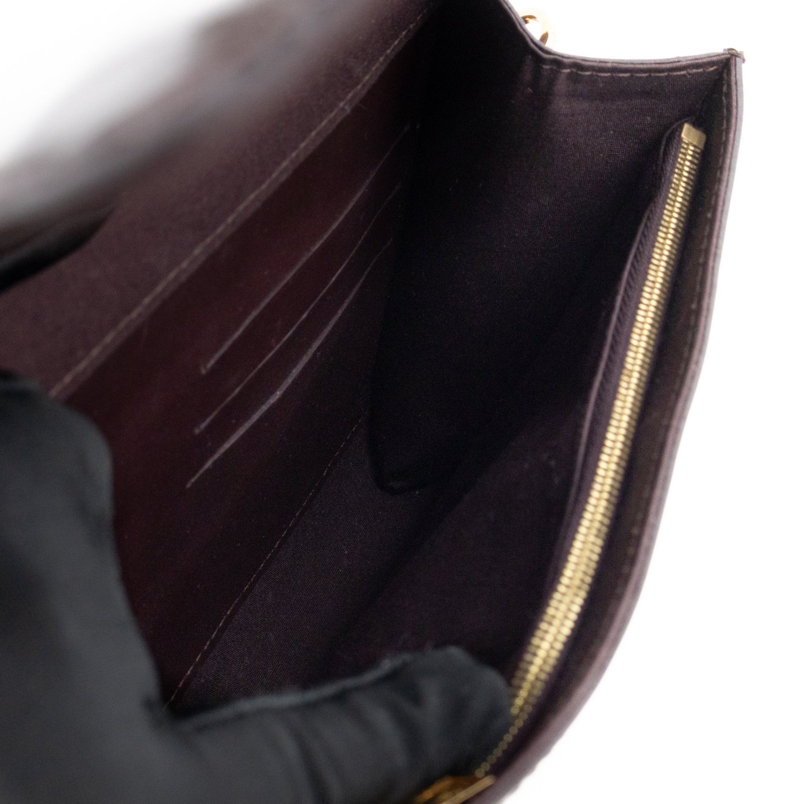 Alluring amarante Chain Louise GM by Louis Vuitton. This pochette on chain is made with beautiful amarante vernis leather and gold-tone hardware. Convertible to a clutch for evening use. Slim pockets under the flap and inside a zipper pocket.