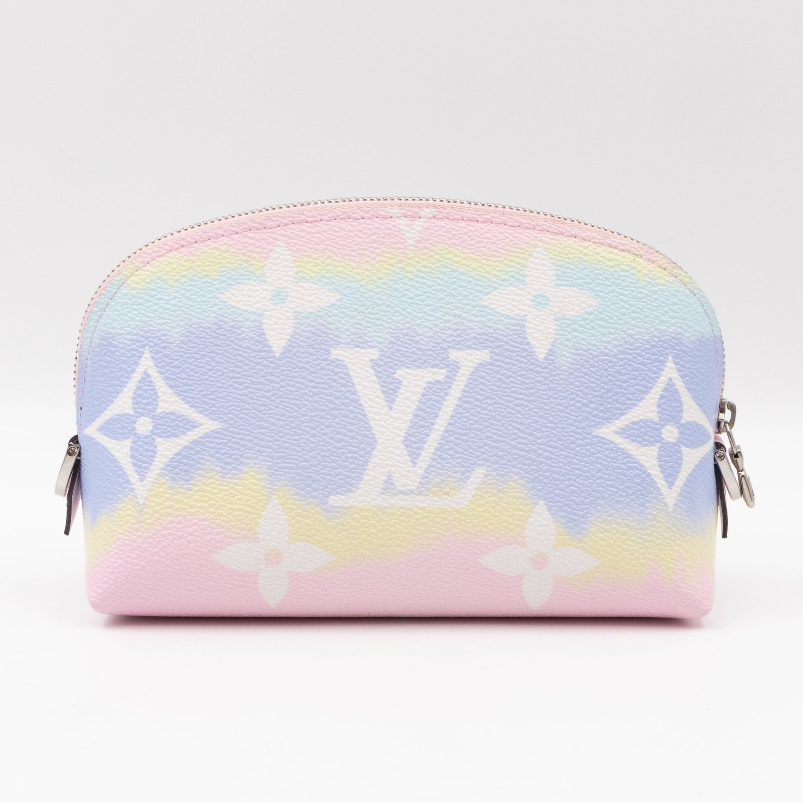 A practical Cosmetic Pouch PM from Louis Vuitton. This limited edition from the LV Escale Collection is made with a special tie-dye pastel color canvas and inside lining is pink. D-rings added to each side. Small and useful accessory for travels or everyday use.