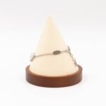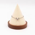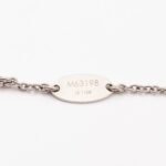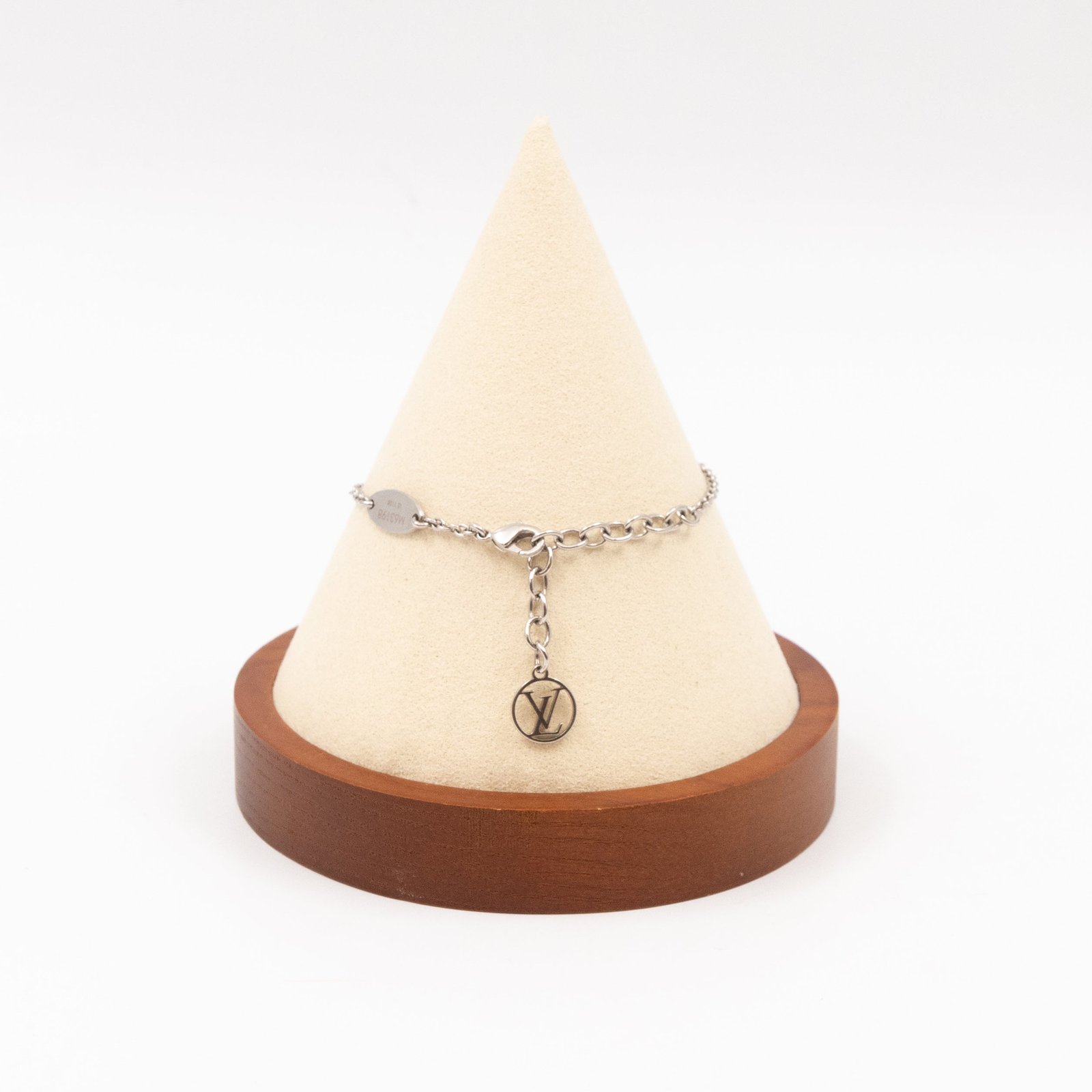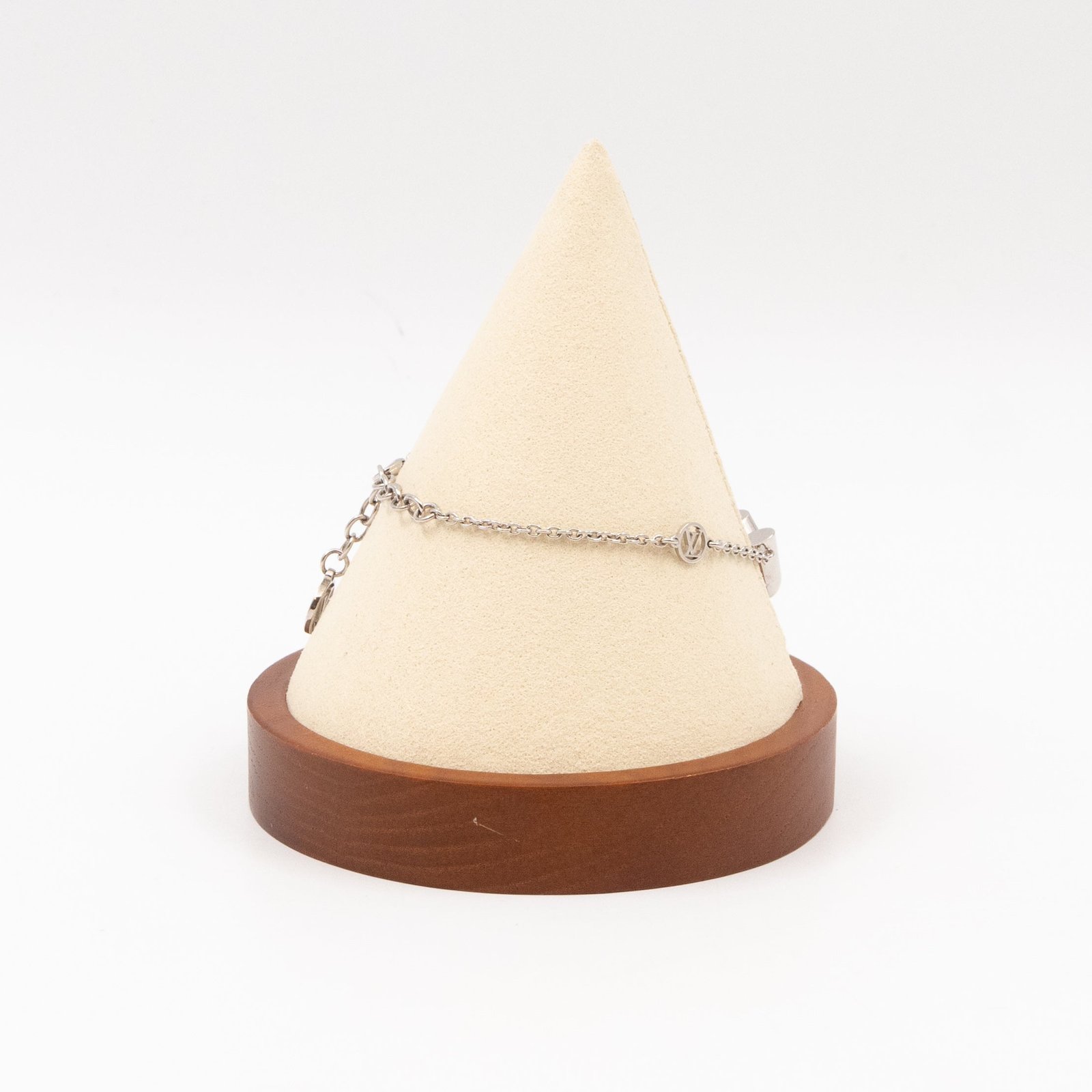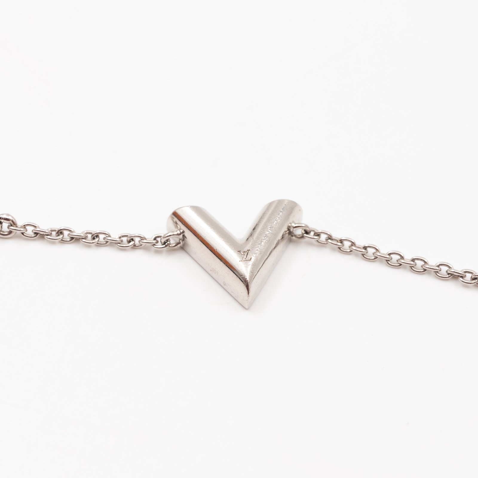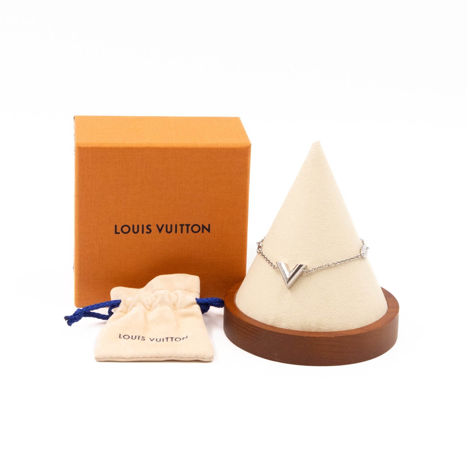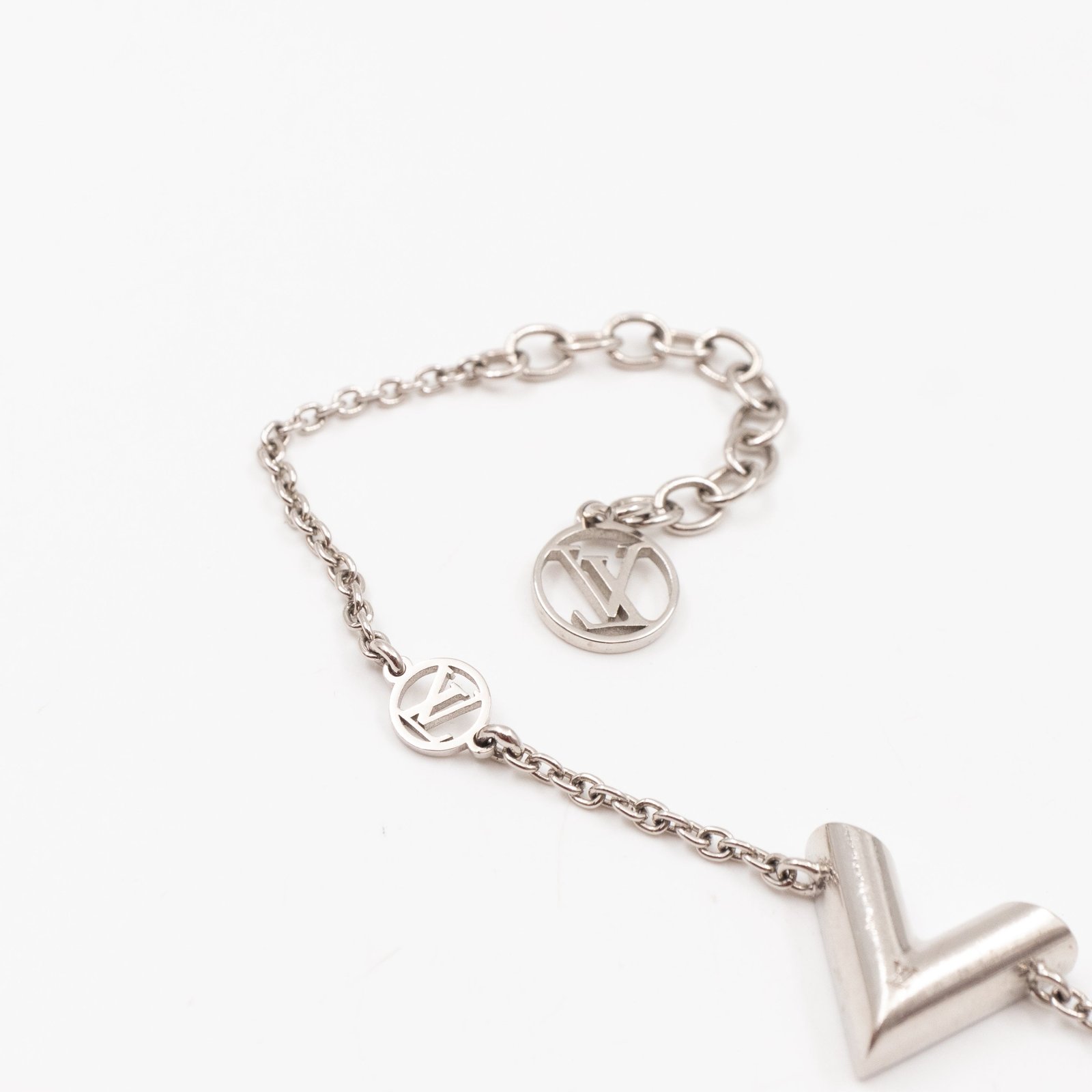 This is a Louis Vuitton Essential V supple bracelet. This supple bracelet combines Louis Vuitton’s graphic V motif with the LV Circle signature on the chain and clasp. Total wearable length is 15-19 cm. Retail price €360.