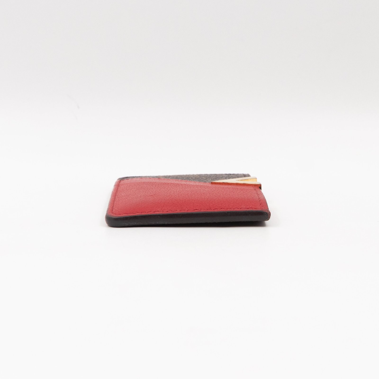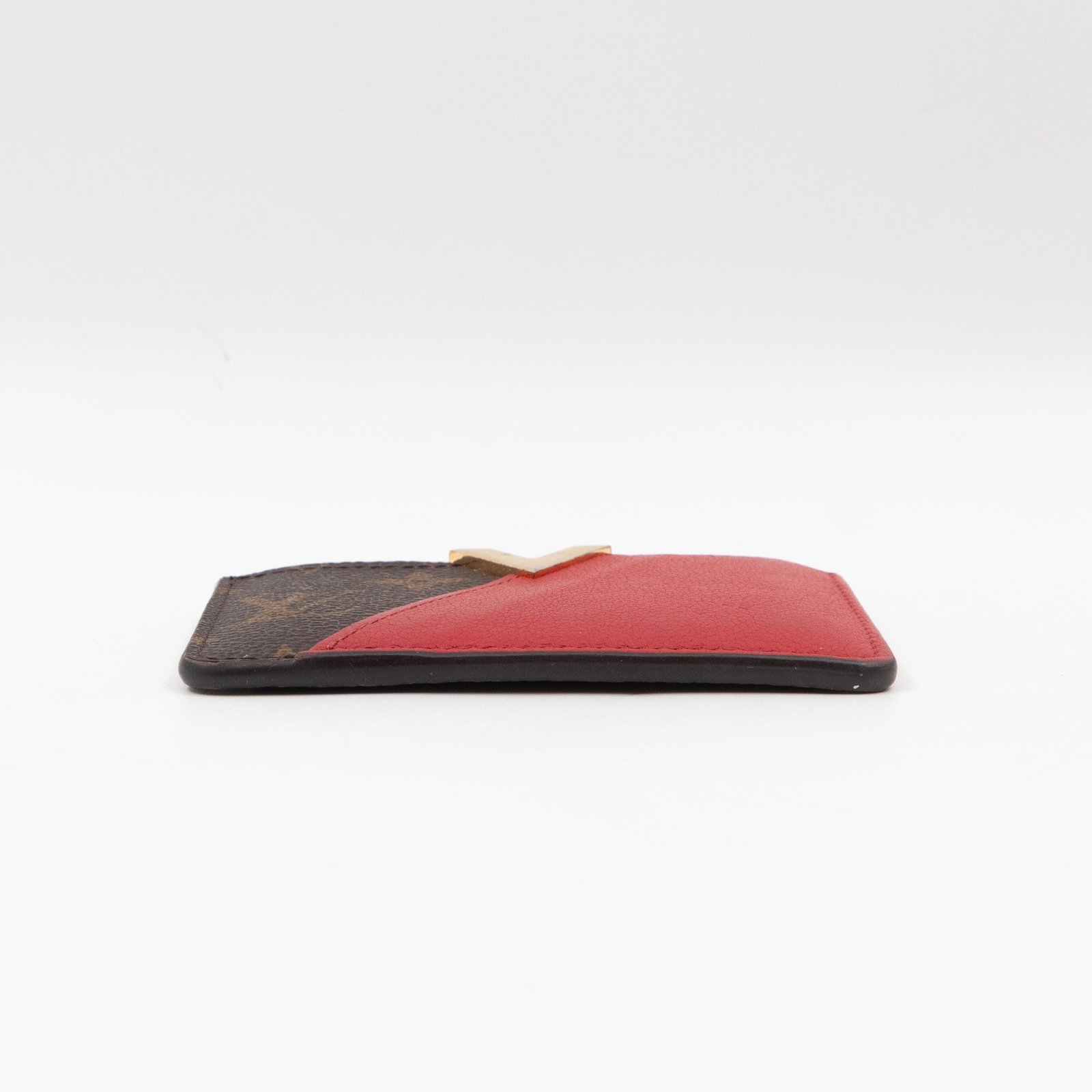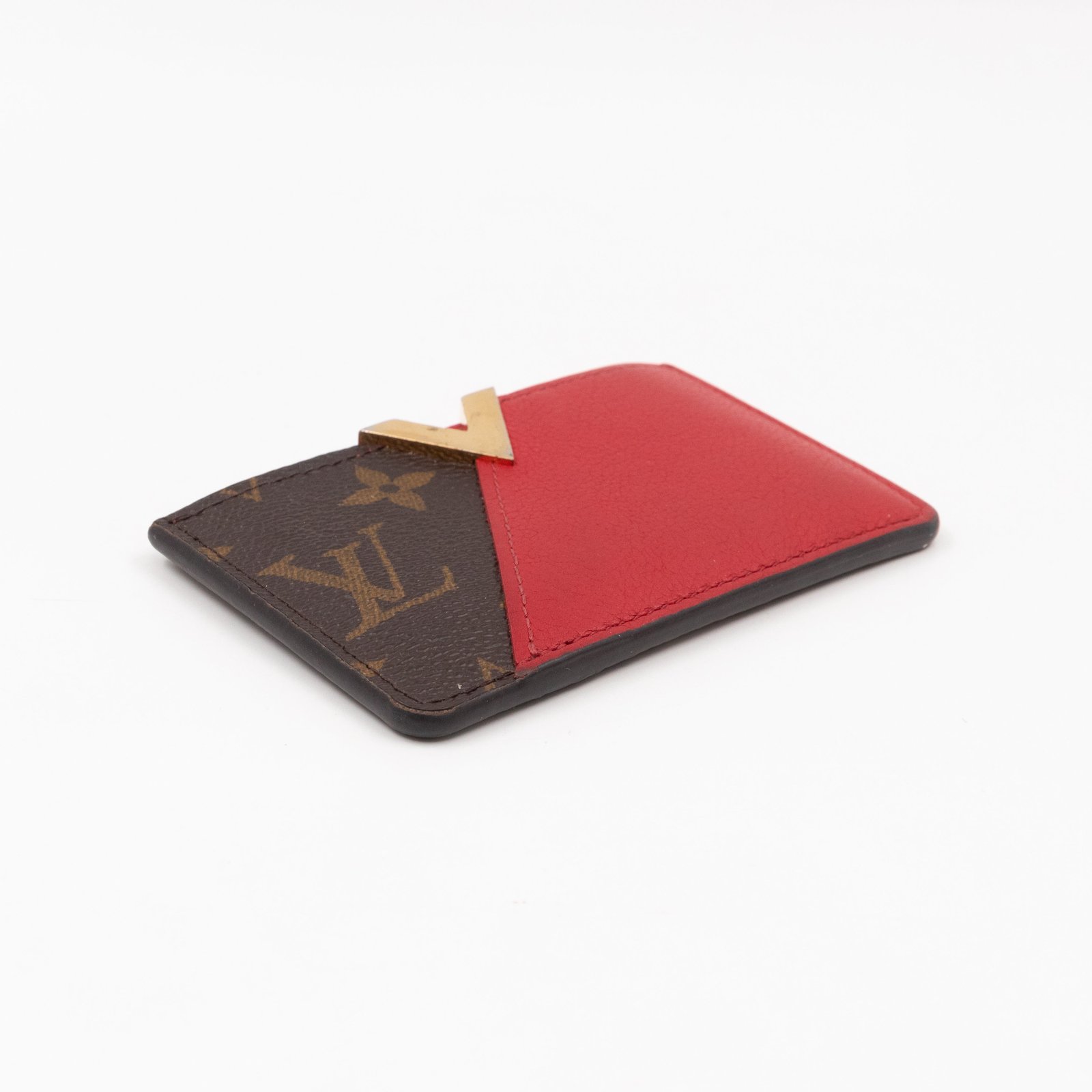 This is a Kimono card holder from Louis Vuitton. This one is made in monogram canvas and red leather with gold-tone hardware. This card holder features a gold V and opens to a red leather interior. Two slots for credit cards or business cards.