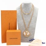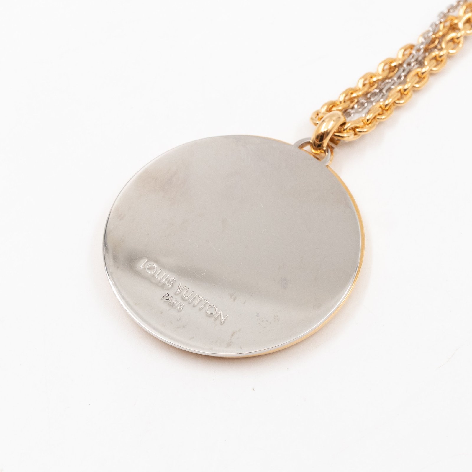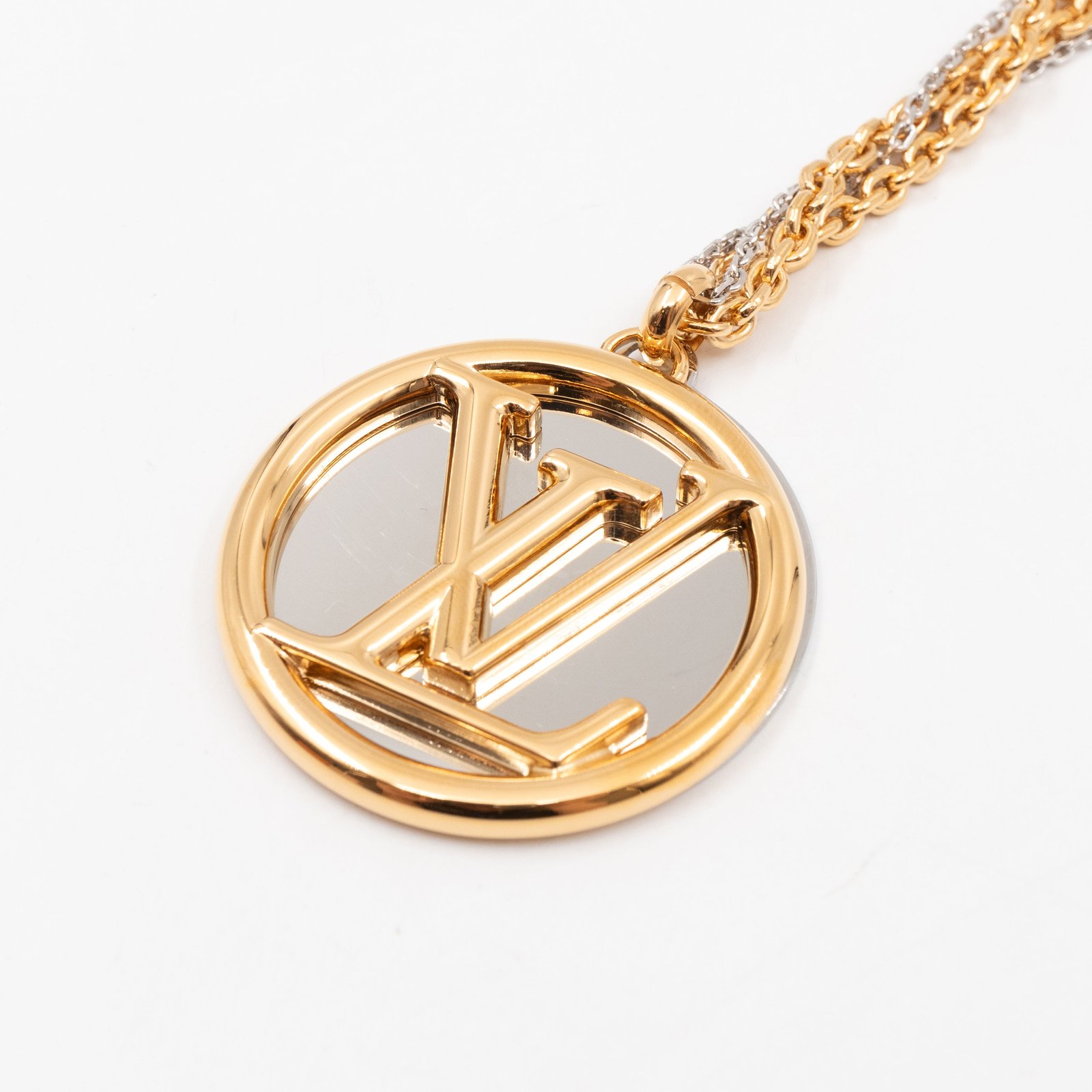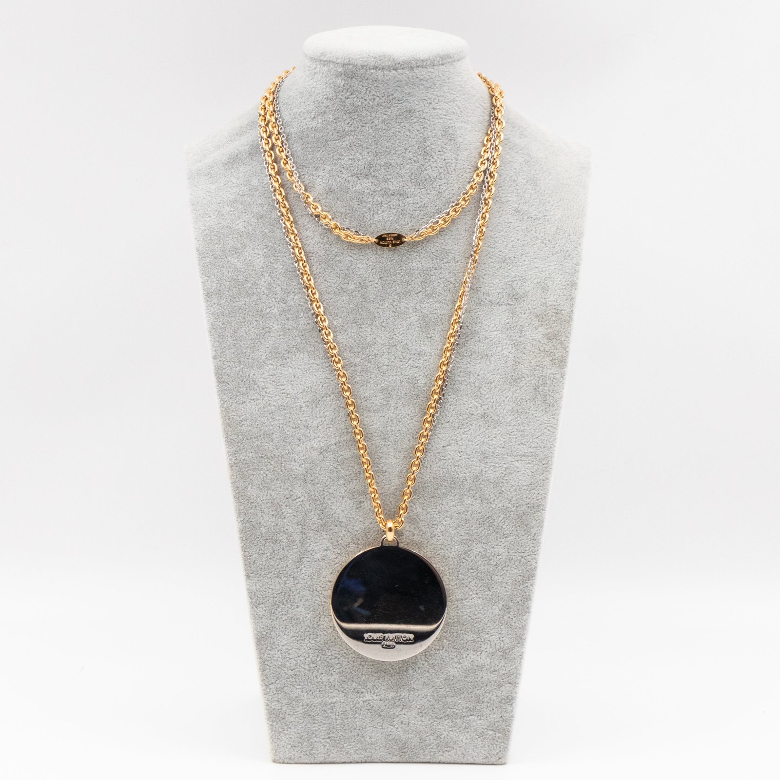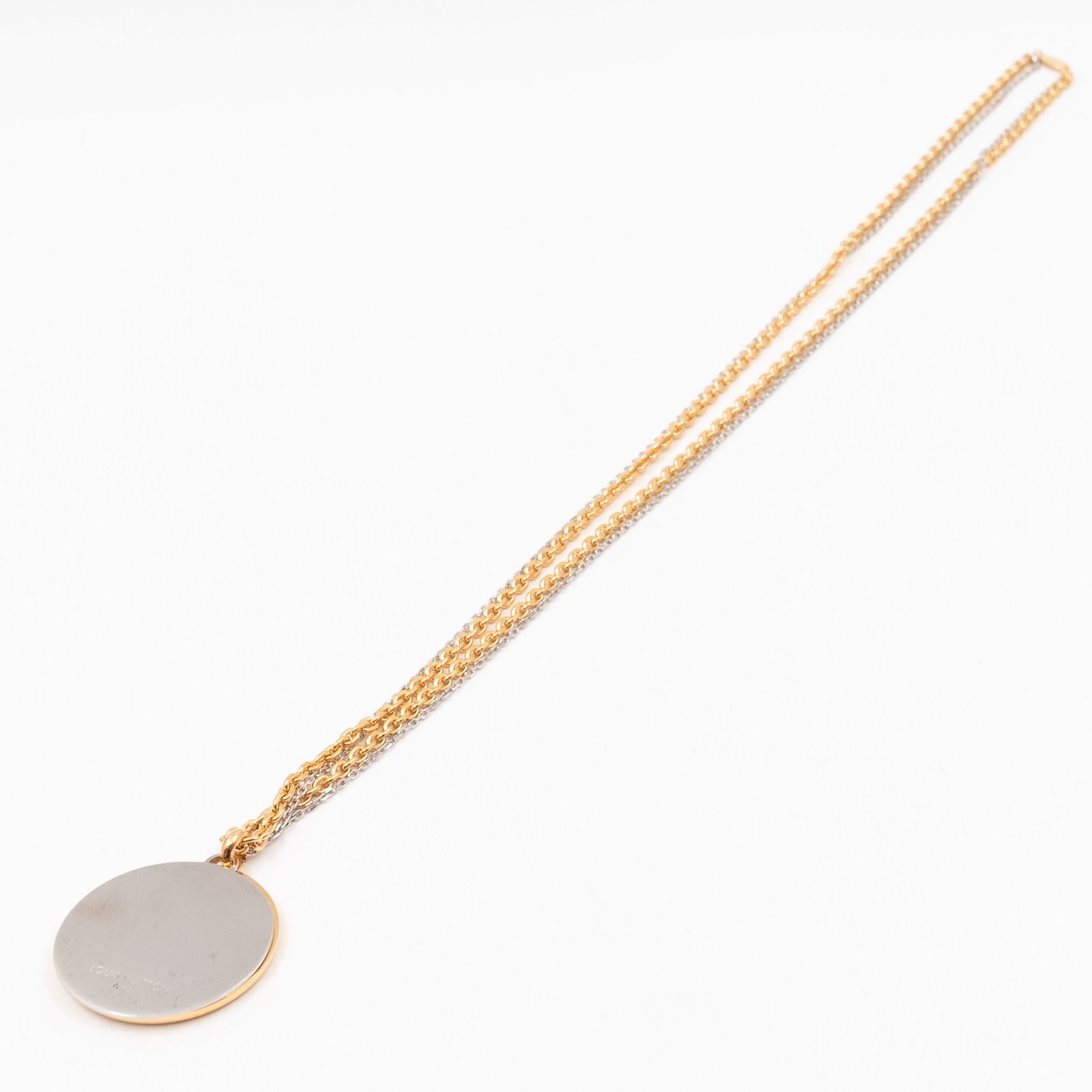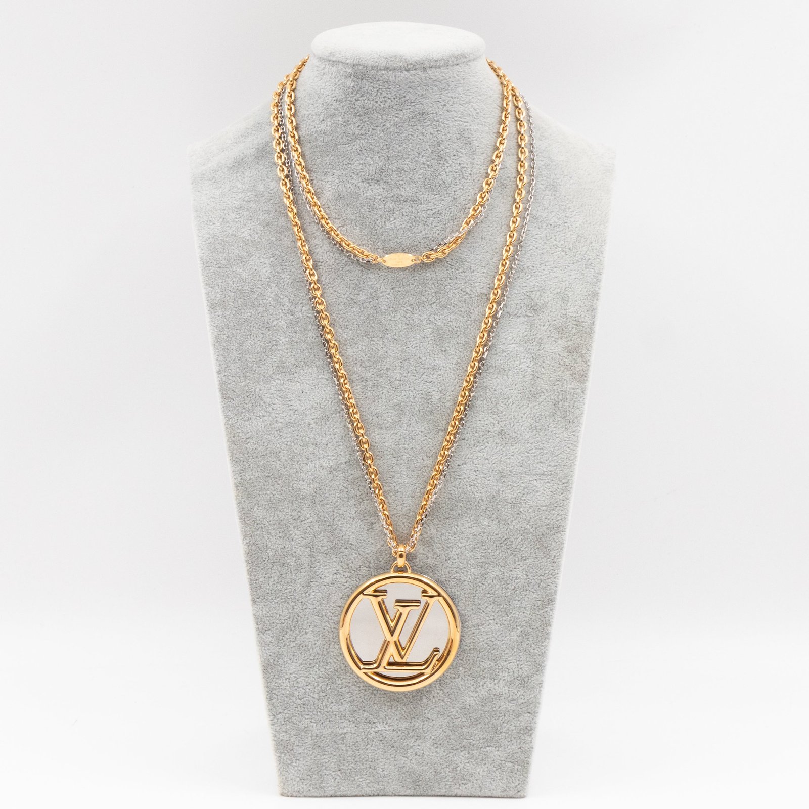 This is a Louise Long Necklace in Gold from Louis Vuitton. This iconic necklace features a gold and silver tone chain with a gold and silver LV logo pendant. Suitable for casual or evening looks.