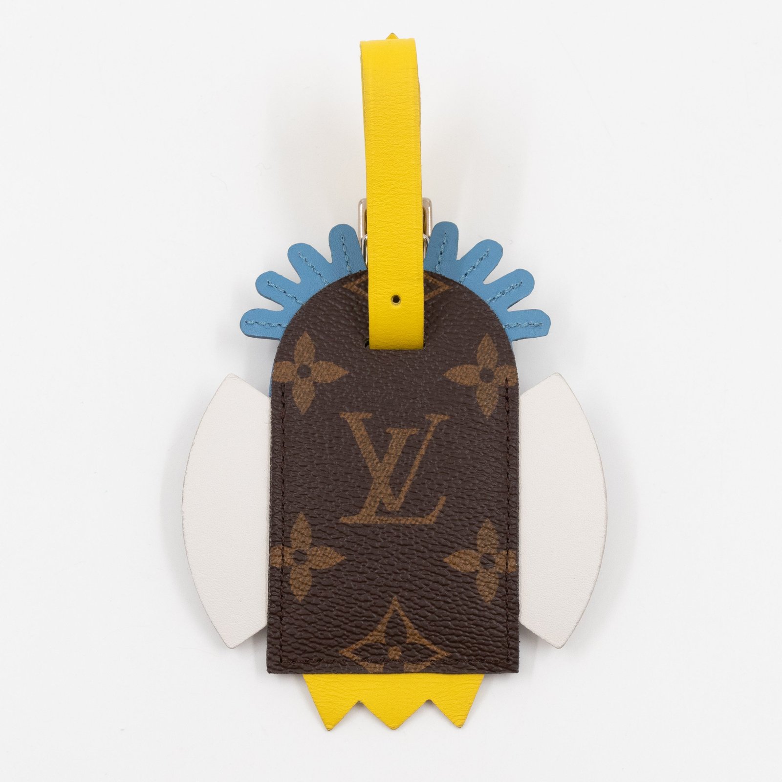 This is an limited edition Louis Vuitton Monogram Tribal Mask Luggage Tag. This colorful luggage tag is crafted of Louis Vuitton monogram coated canvas in the guise of an African tribal mask. The tag features a leather interior with a leather strap and a silver buckle. This is a whimsical luggage tag for travel.