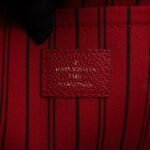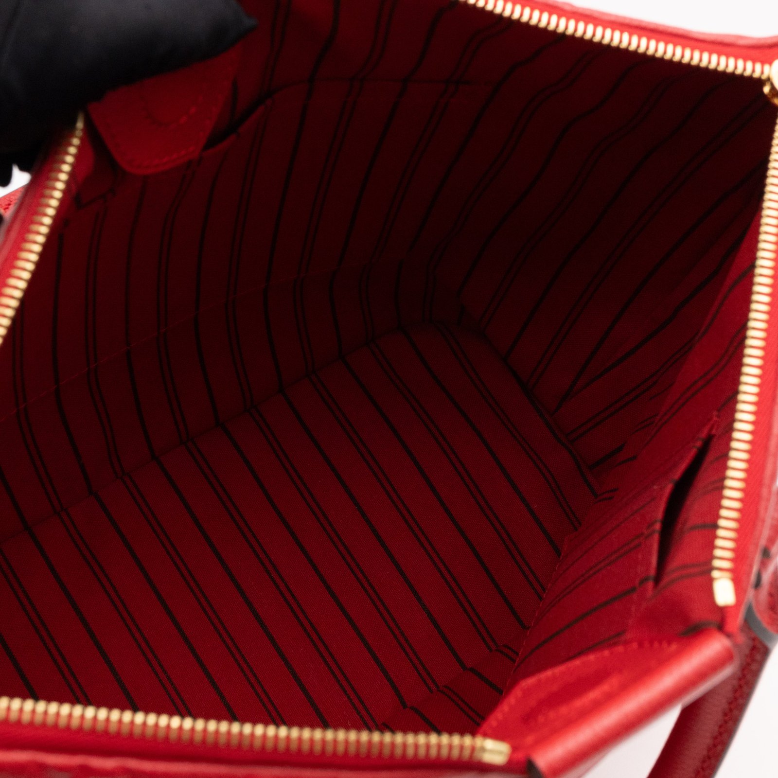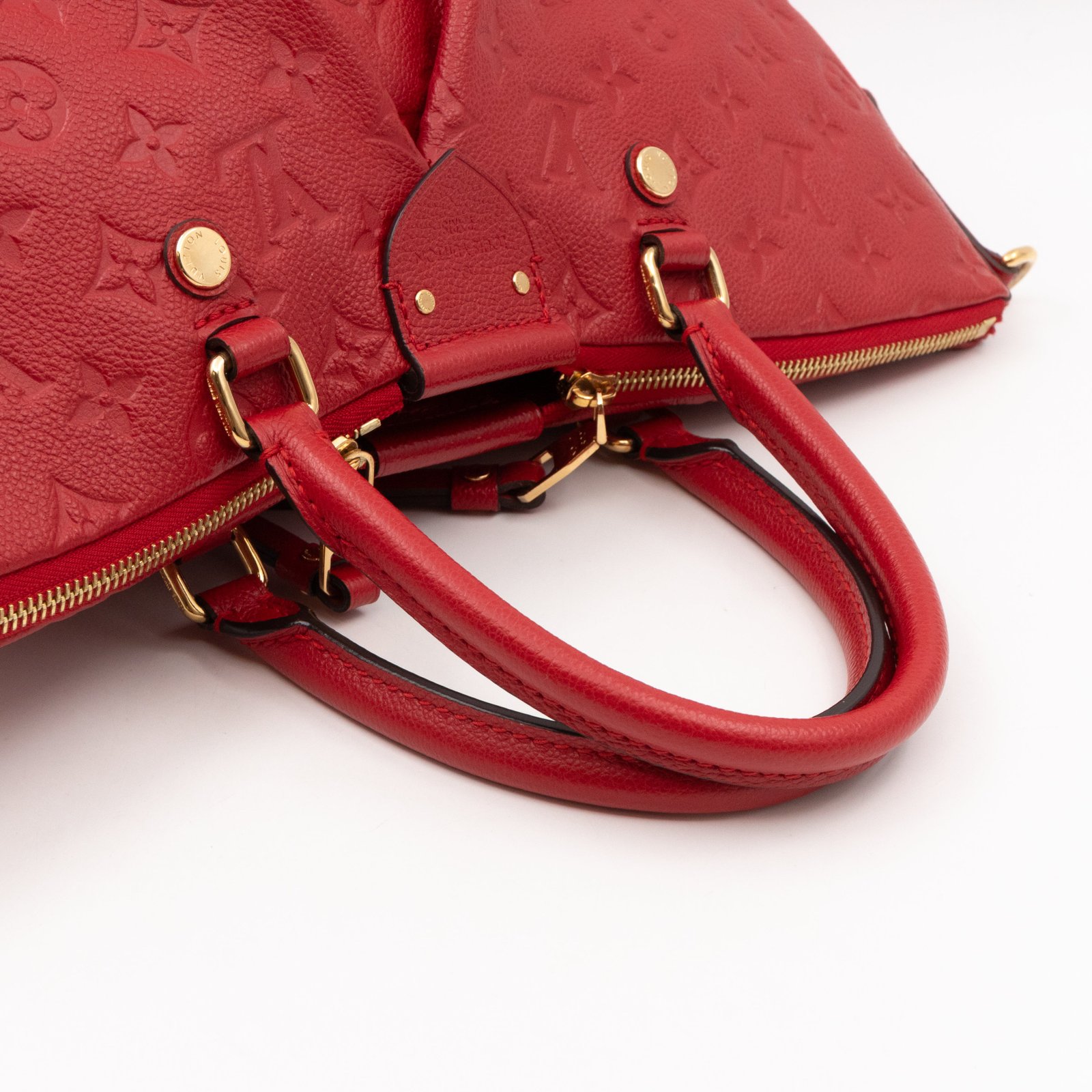 This Louis Vuitton Mazarine MM is in an elegant combination of red monogram empreinte leather, and bright gold-tone hardware. Removable shoulder strap for easy carrying. The top zipper opens to a stripe taupe fabric interior with patch pockets, with a wide base for all your daily items. Retail price €1980.