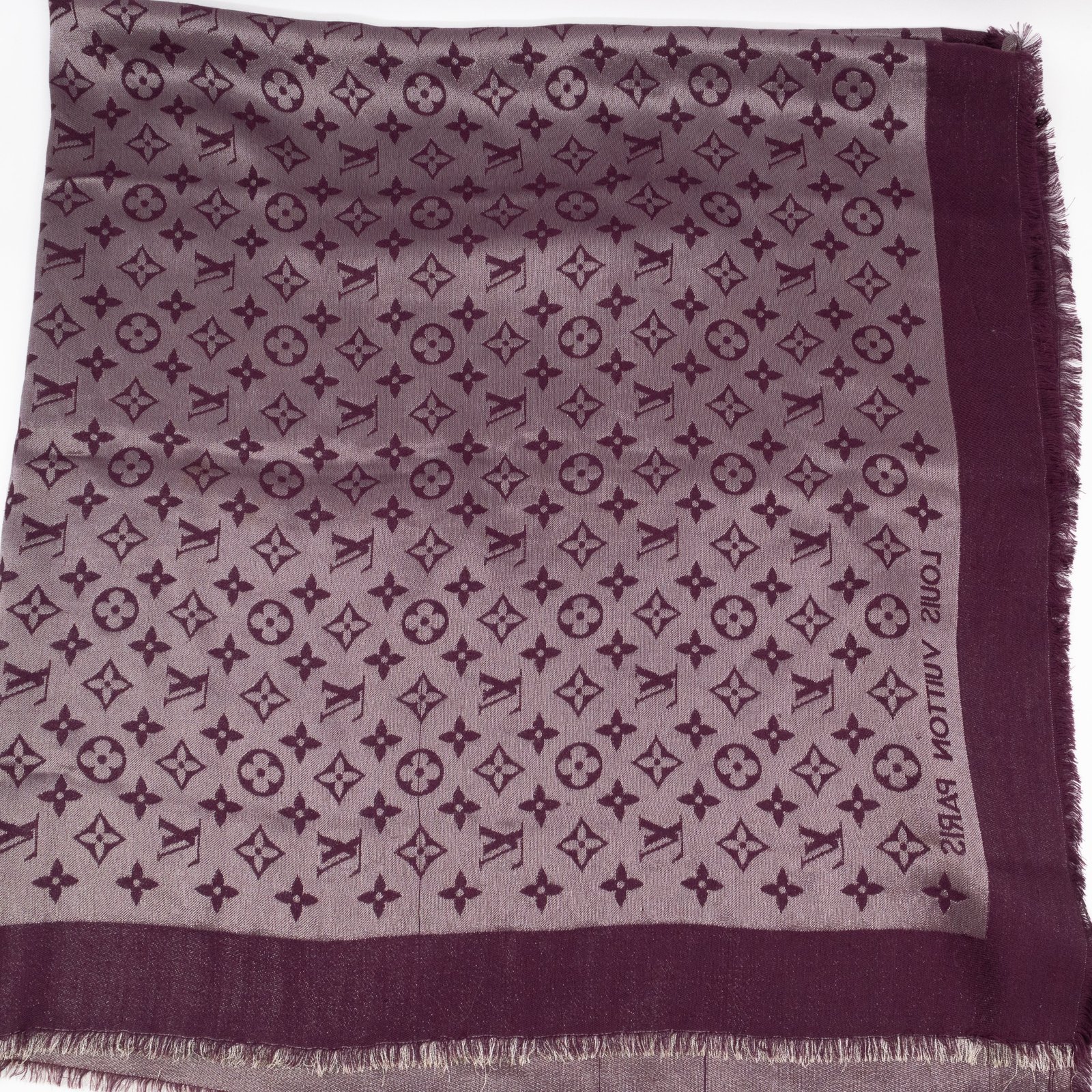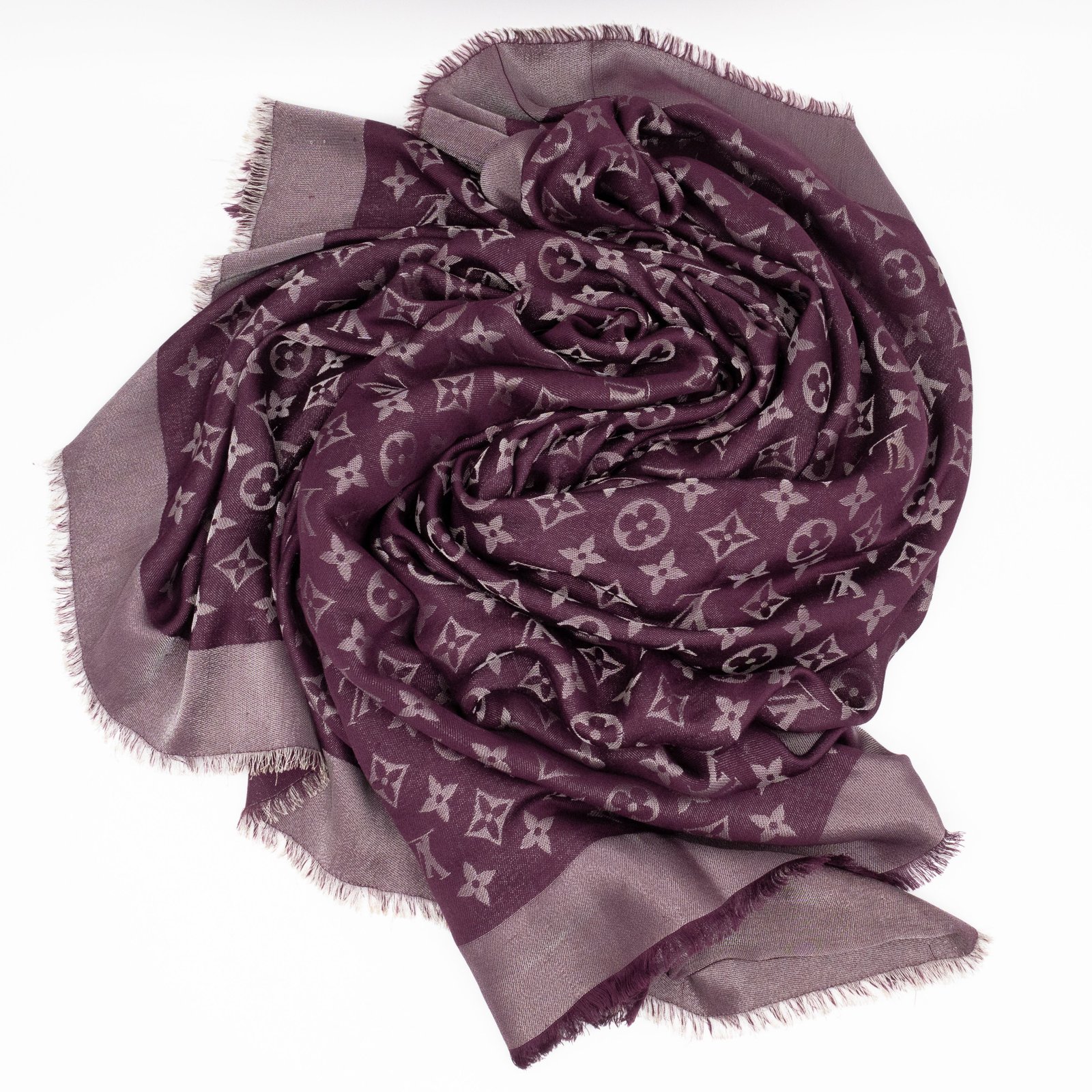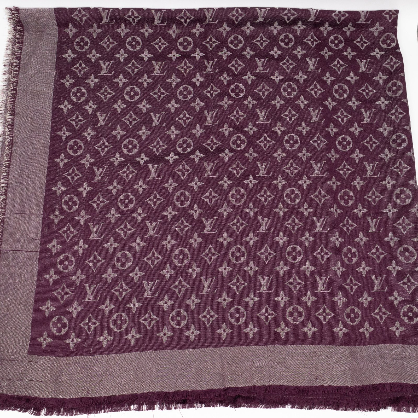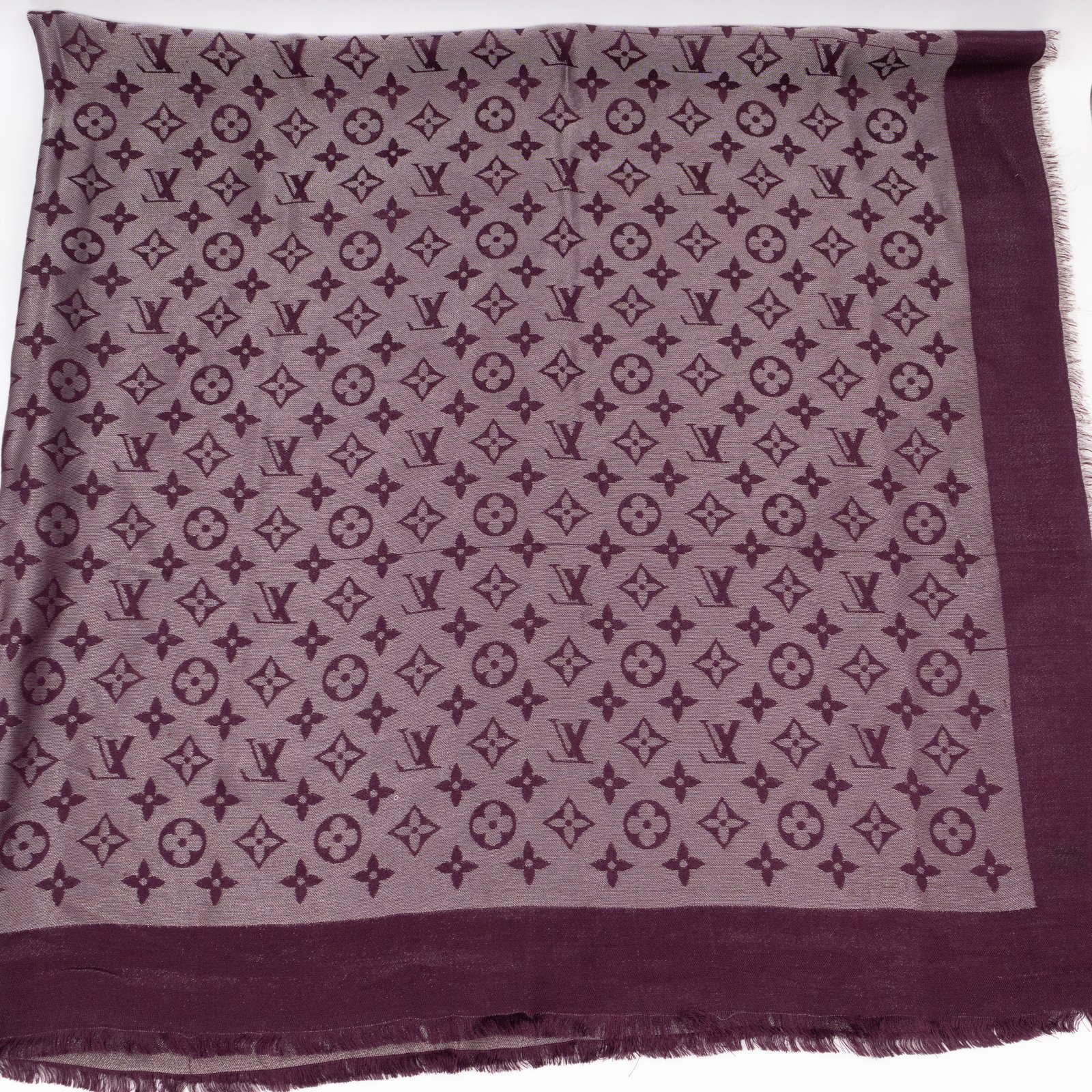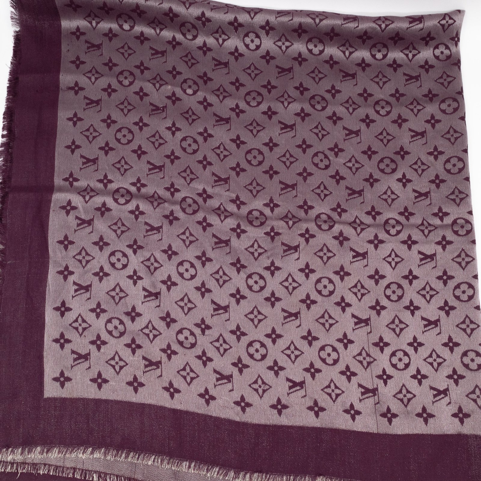 A beautiful Louis Vuitton shawl is a must have accessory. Made in two-tone amarante and gray colors, in a monogram pattern with a subtle shine. This color is not available anymore. Bought at London 4/2013. Current retail price €570.