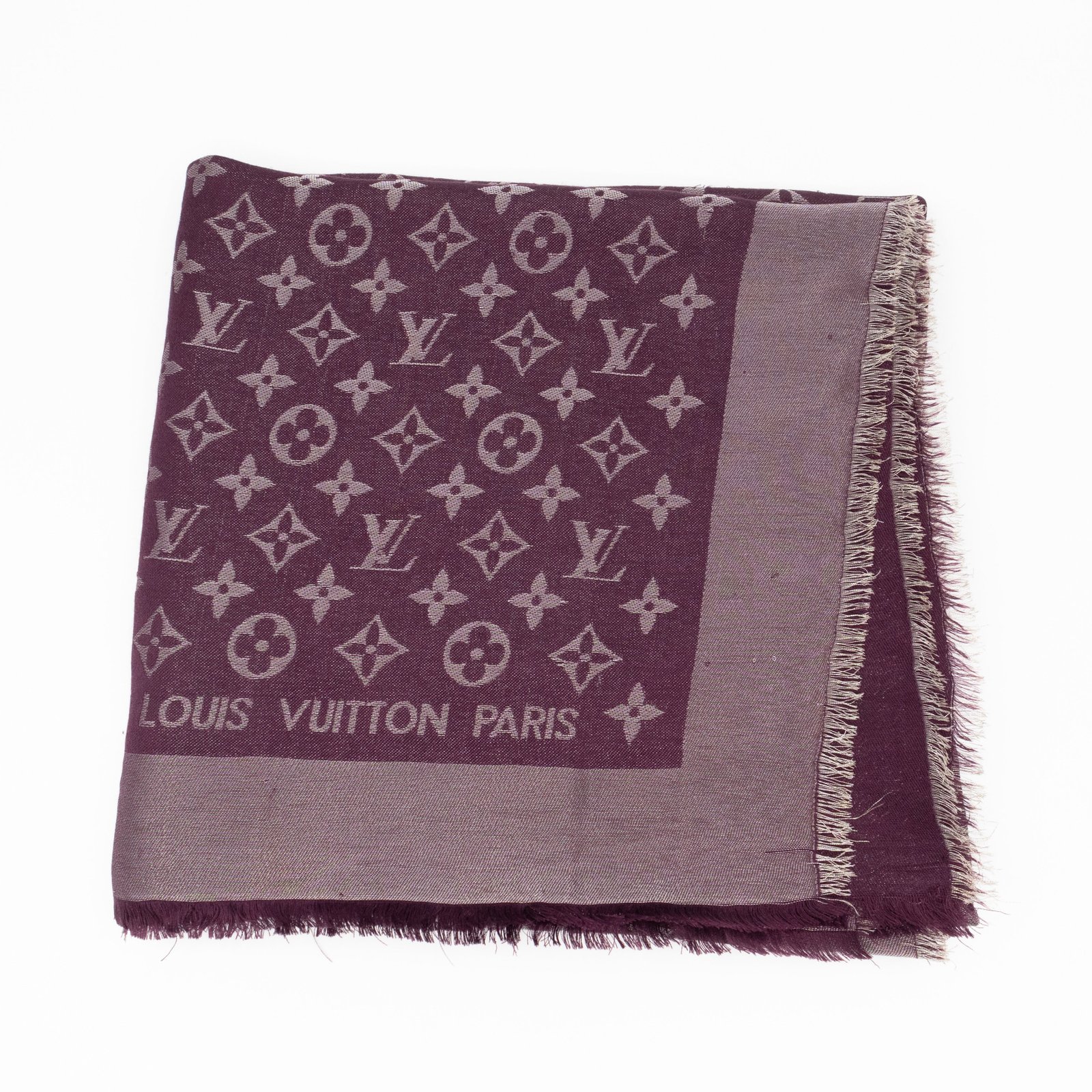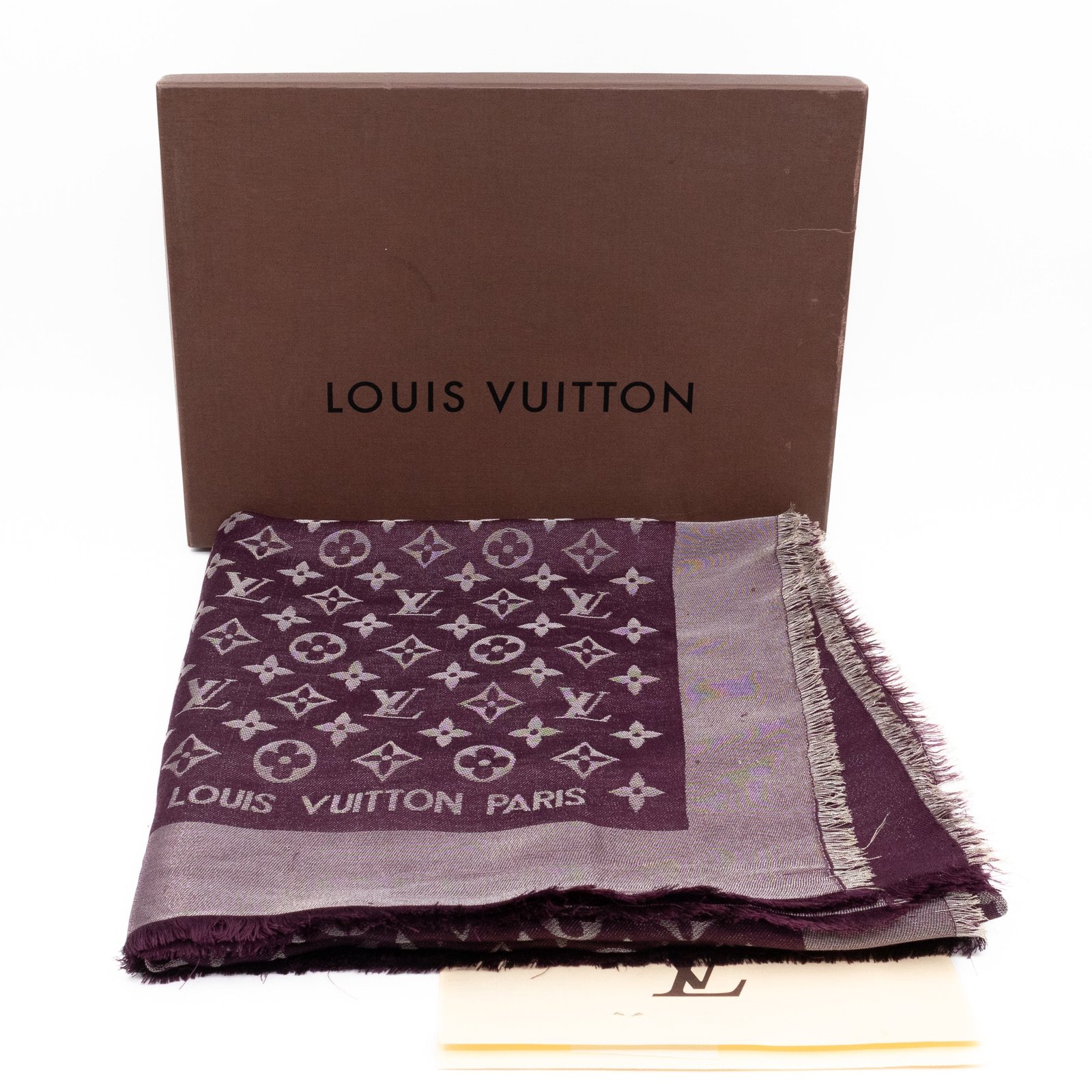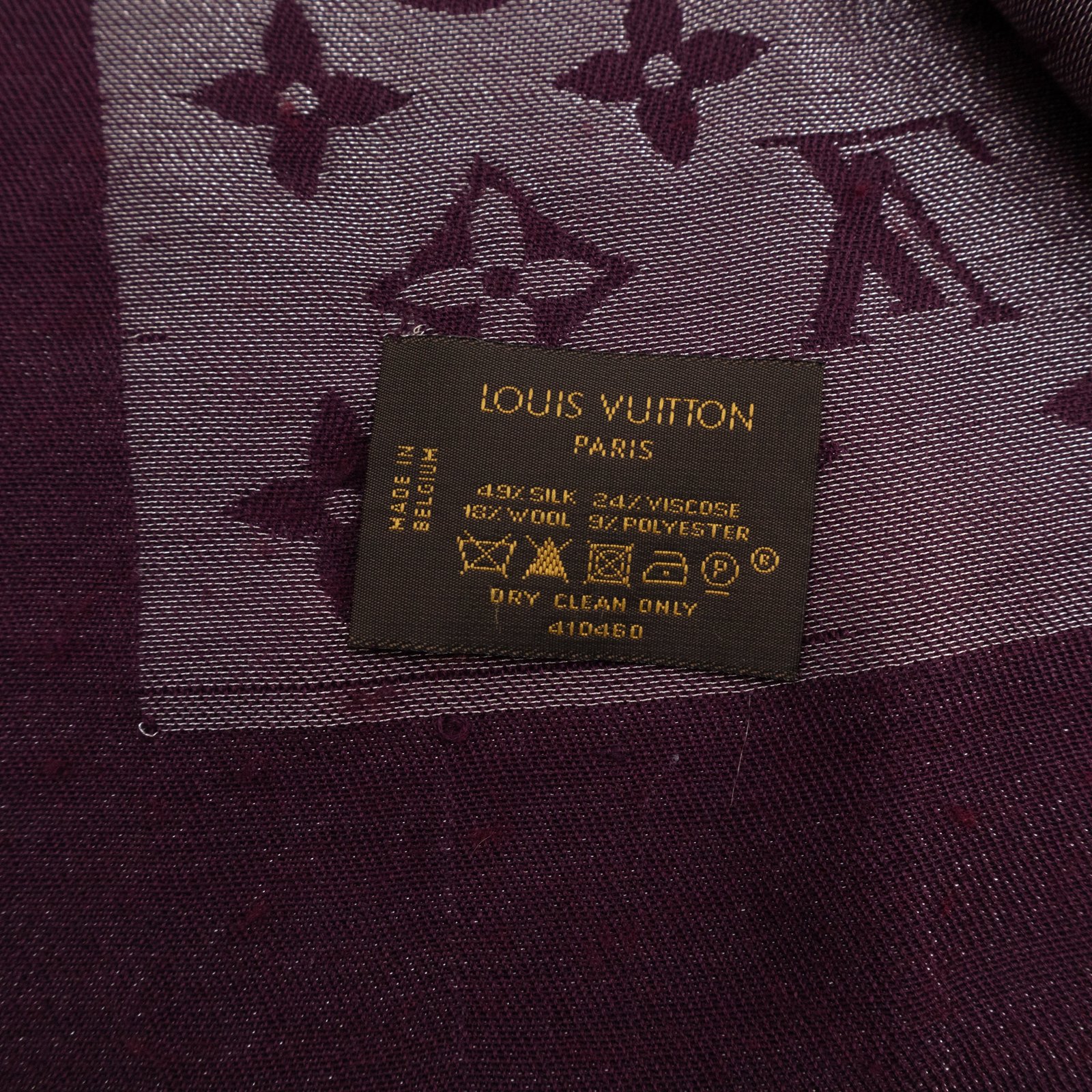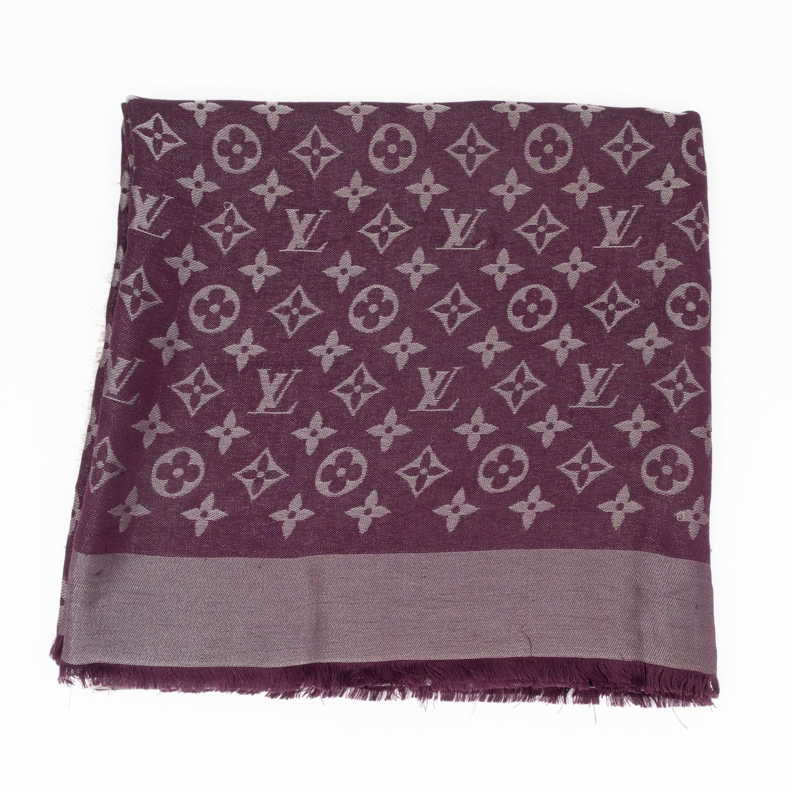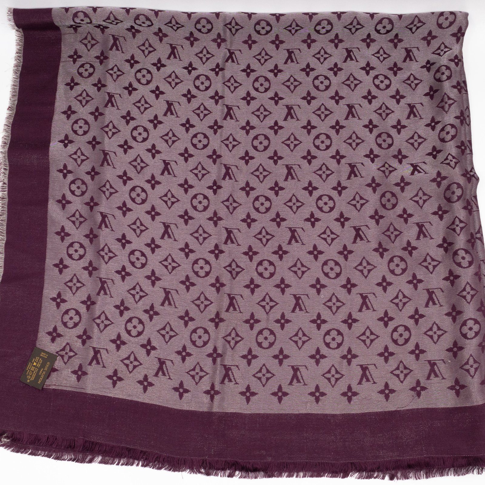 A beautiful Louis Vuitton shawl is a must have accessory. Made in two-tone amarante and gray colors, in a monogram pattern with a subtle shine. This color is not available anymore. Bought at London 4/2013. Current retail price €570.