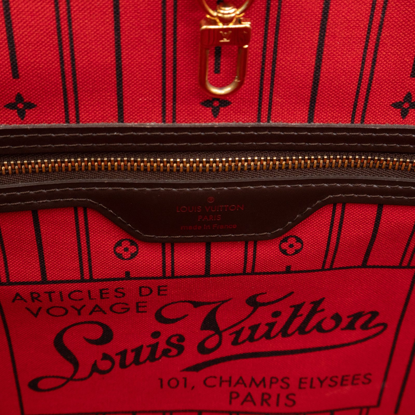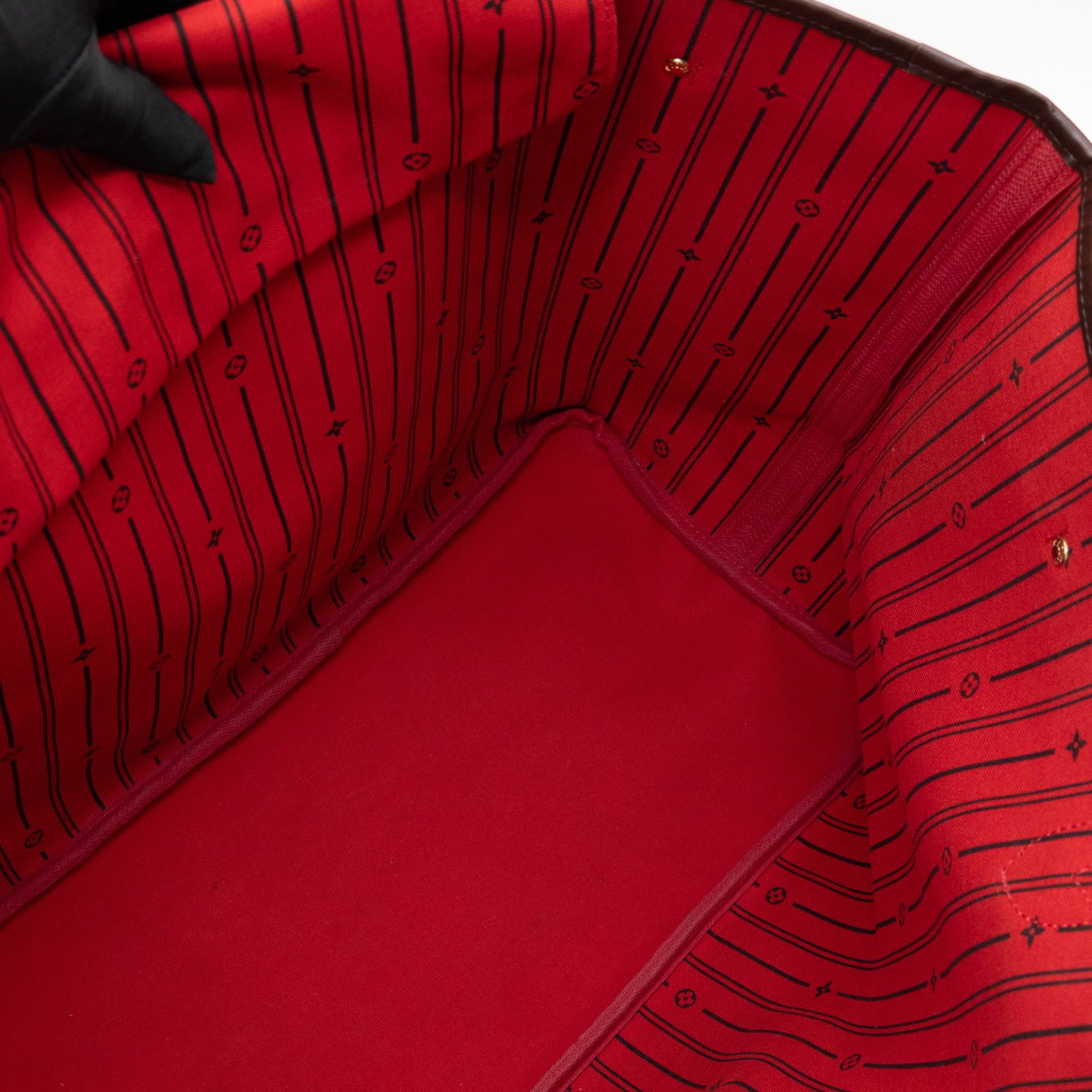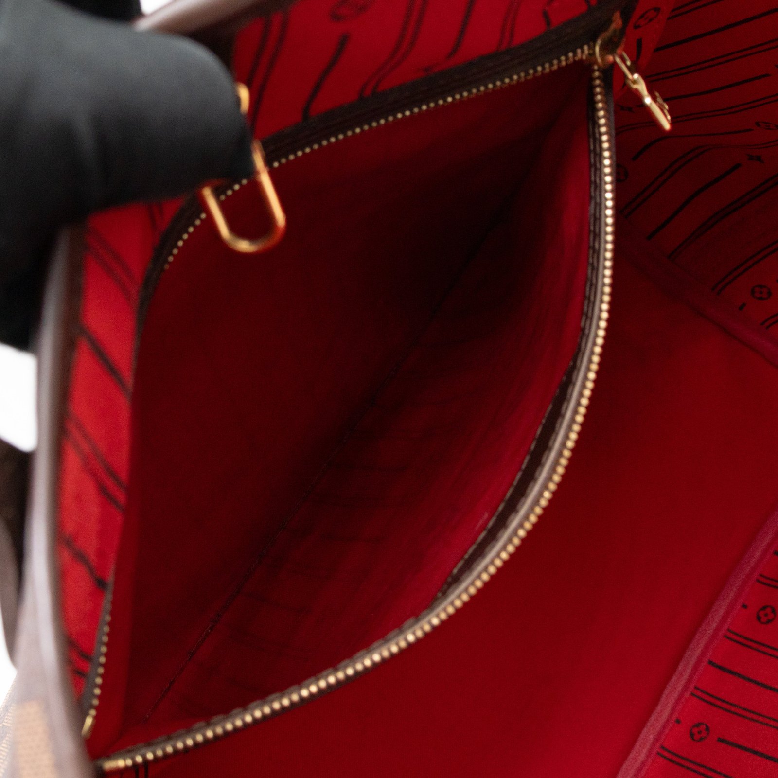 Always popular Louis Vuitton Neverfull in GM size. Made with beautiful Damier Ebene canvas with cherry red color inside lining. The GM is the largest of the series, a size that easily fits everything and then some. Great choice for everyday use, the bag is light and large. Current retail price is €1550.