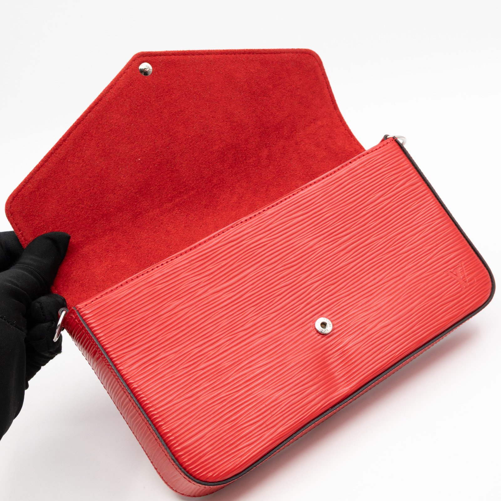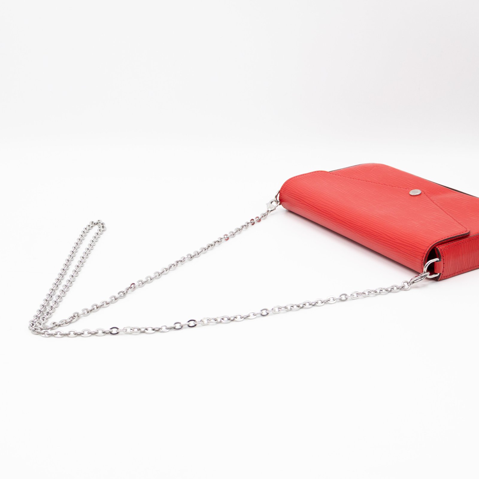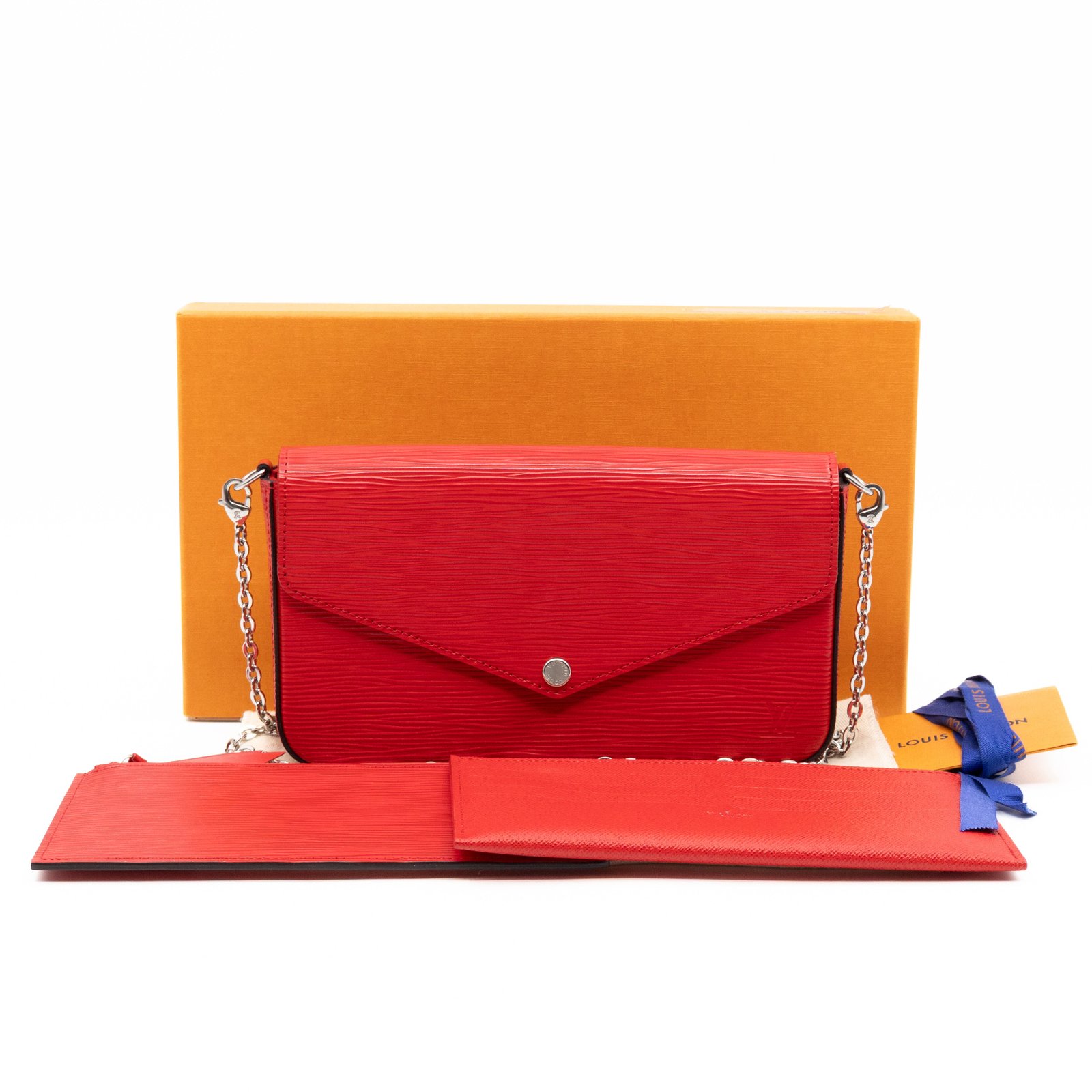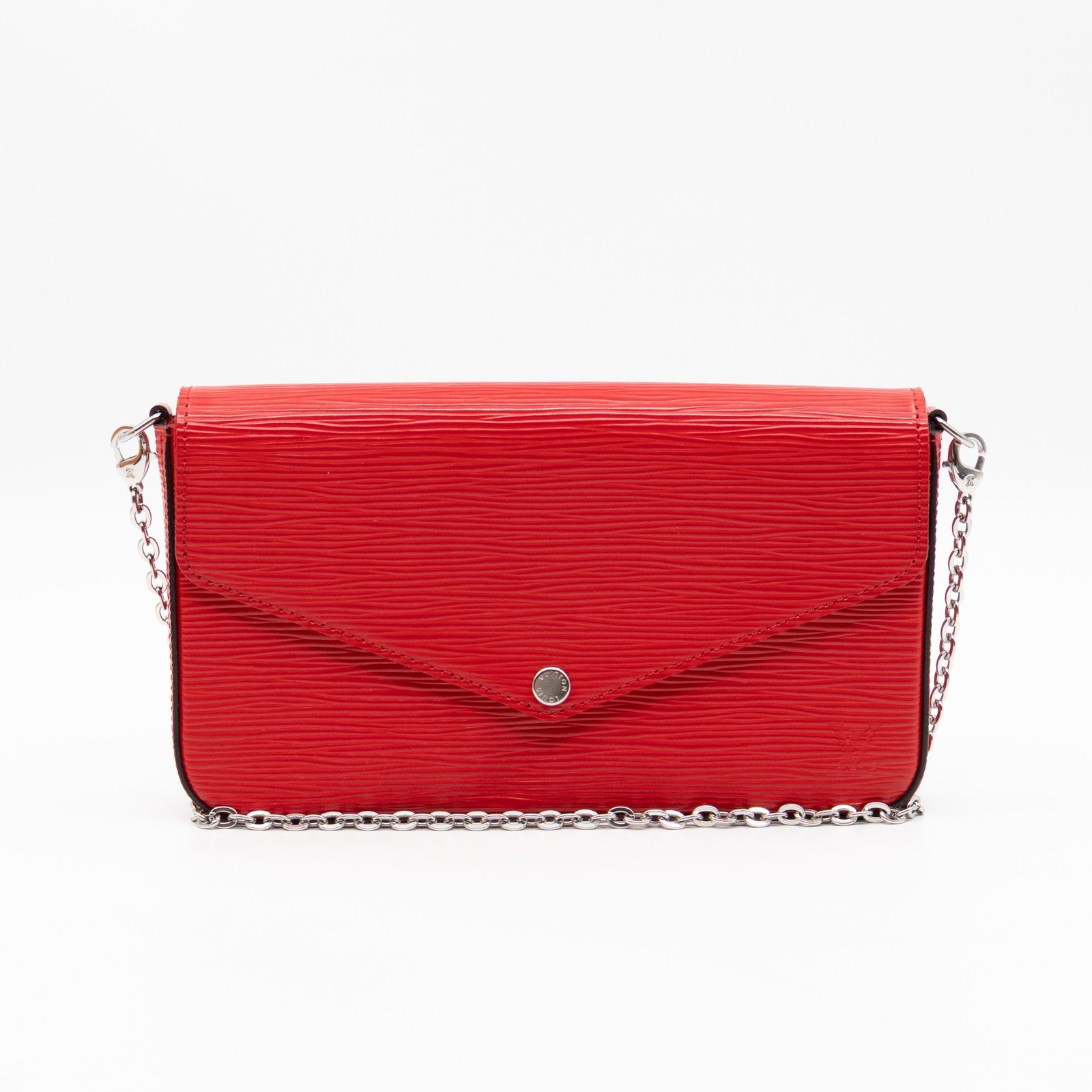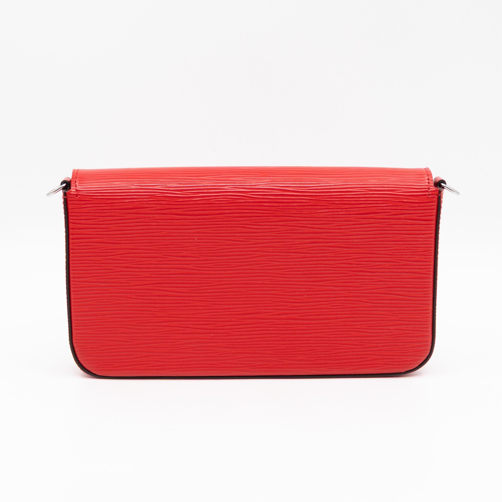 A great daily and evening bag from Louis Vuitton, the Pochette Felicie. Made with Epi leather in red coquelicot with matching inside lining, and silver-tone hardware. Felicie is a versatile crossbody bag, use it crossbody over the shoulder, or remove the chain and it turns into a clutch. It comes with two removable pockets, one zipper pocket for coins and one pocket for cards.