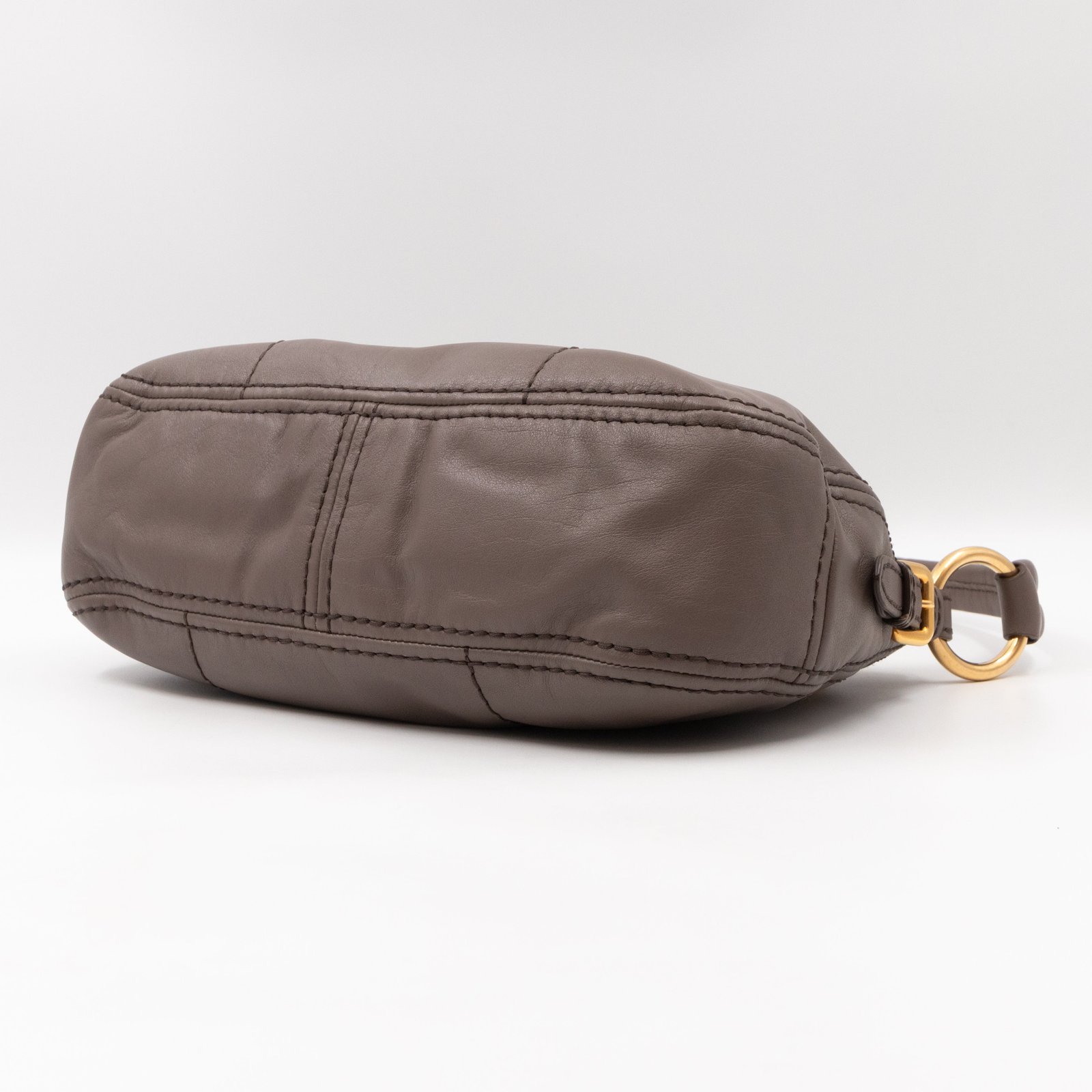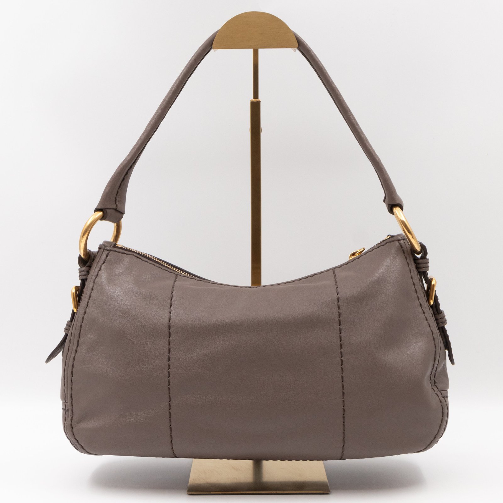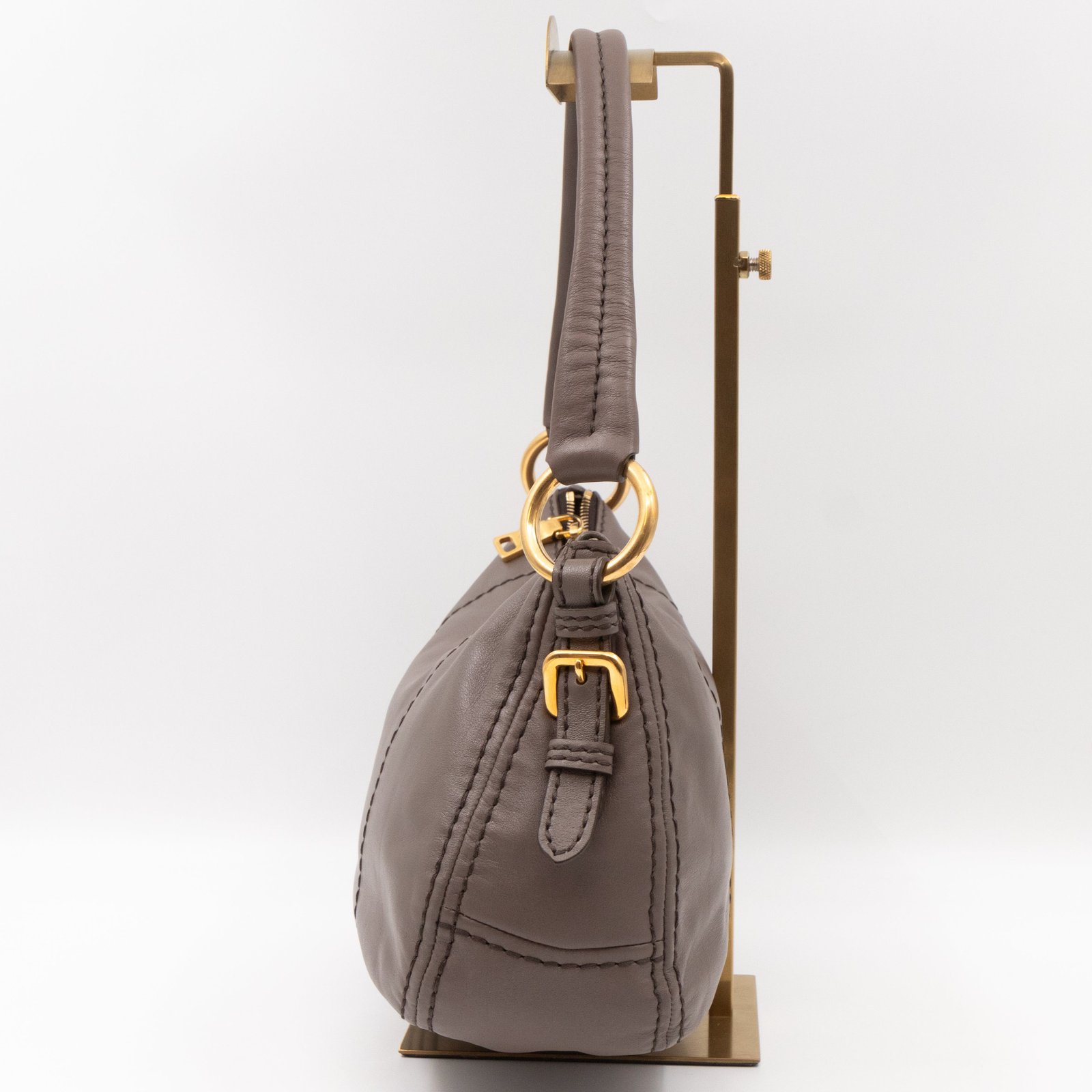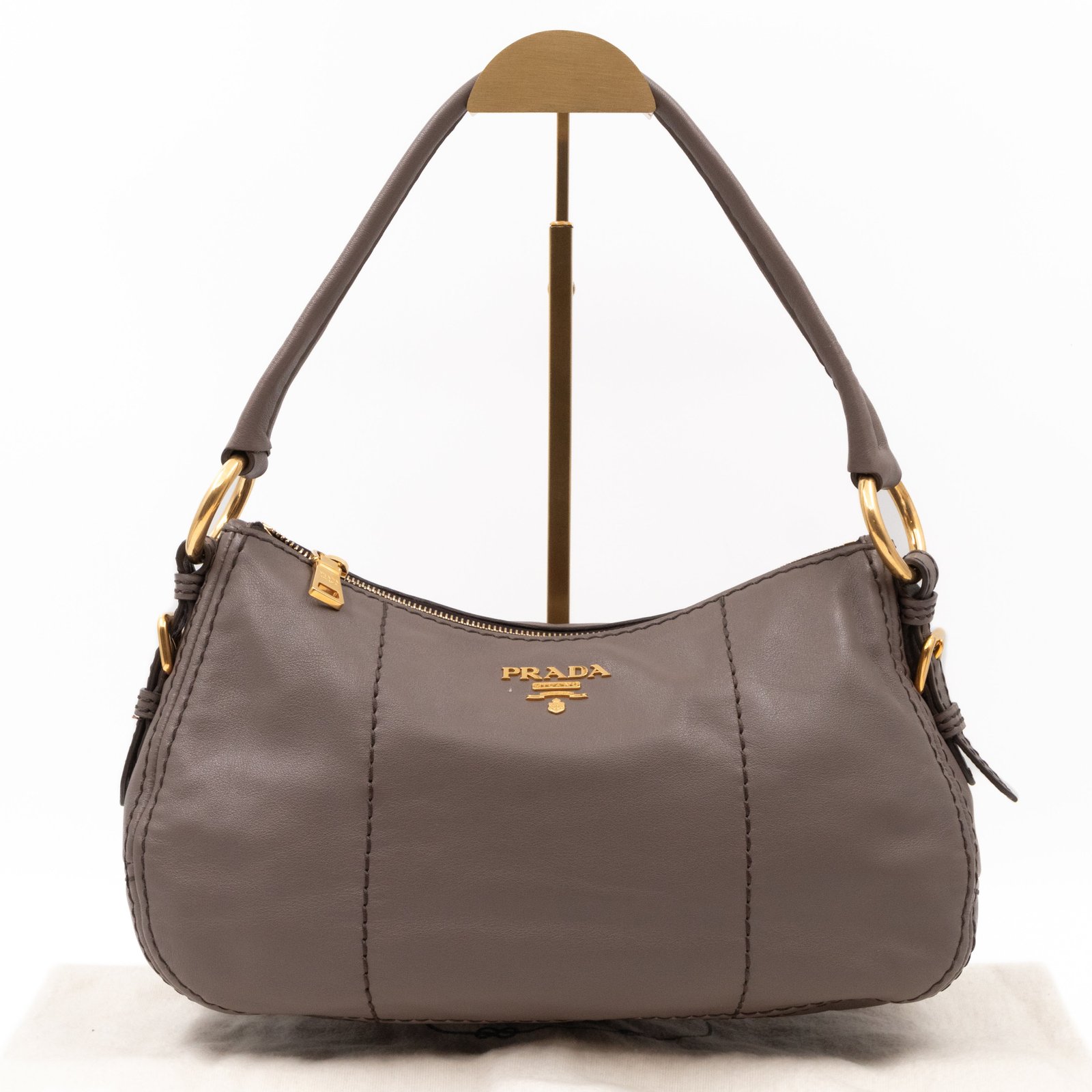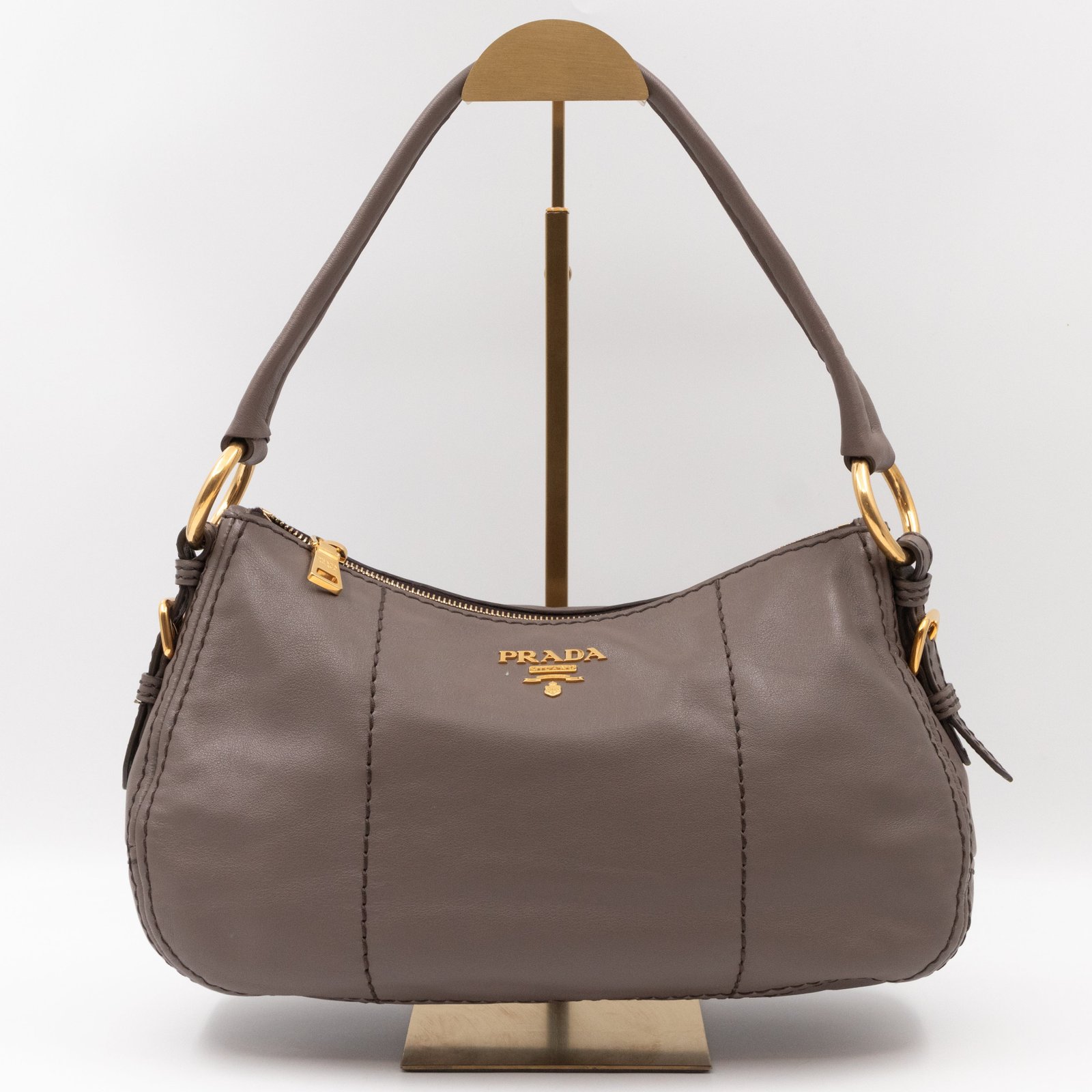 This is a elegant Prada shoulder bag. Very convenient shoulder bag in a grey soft calfskin leather, combined with gold-tone hardware. Top zipper open to a slim pocket and a zipper pocket. Great choice for daily use.