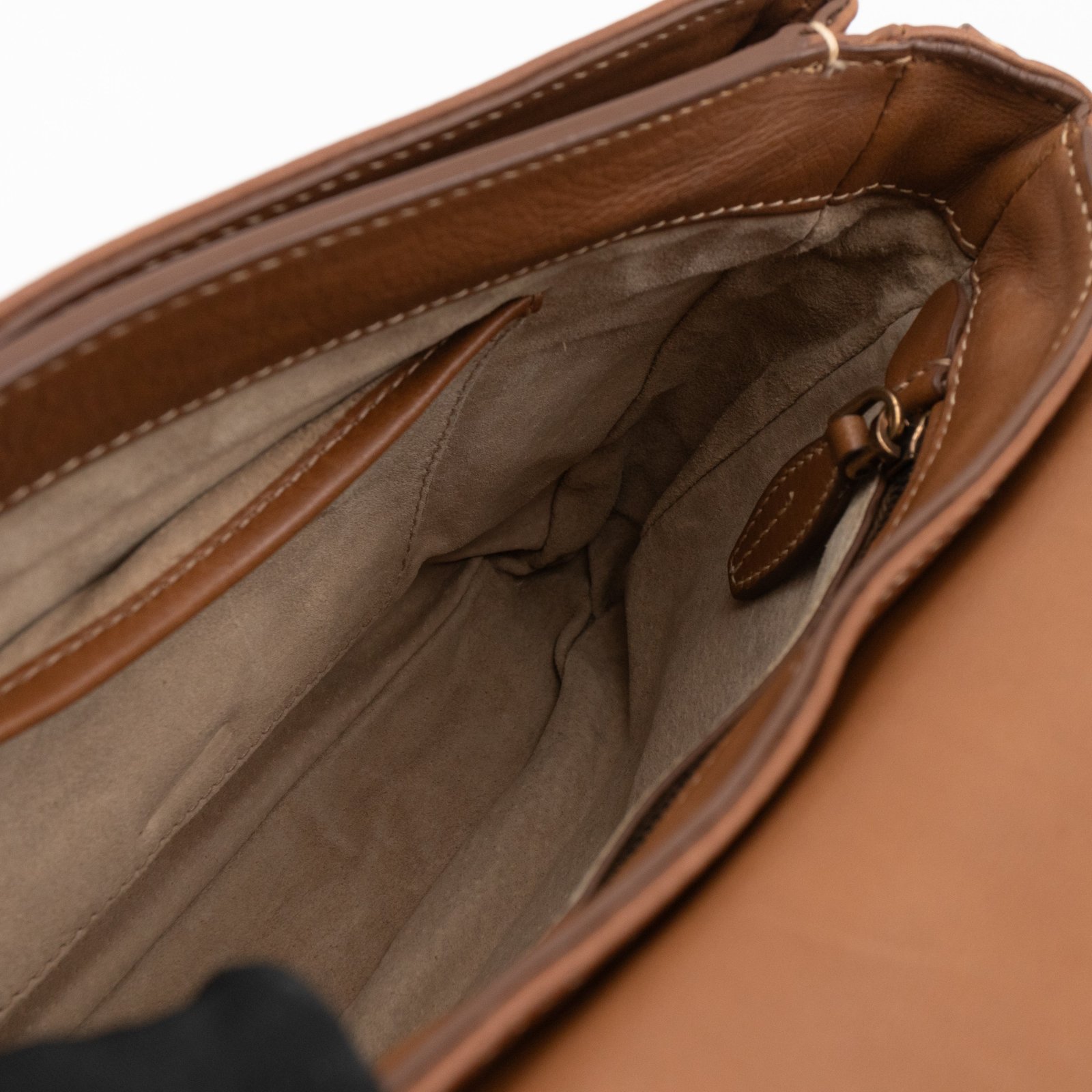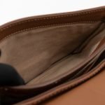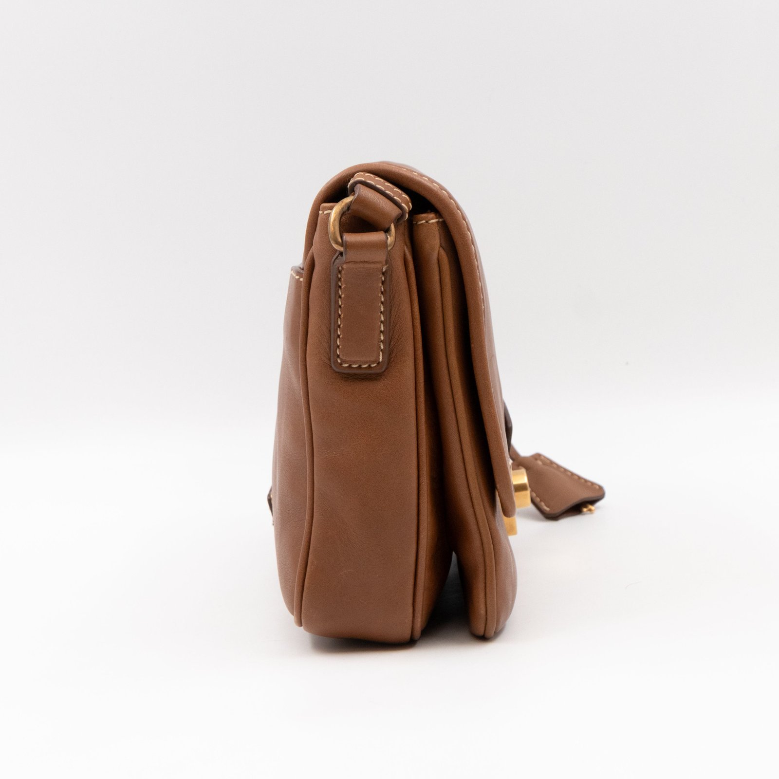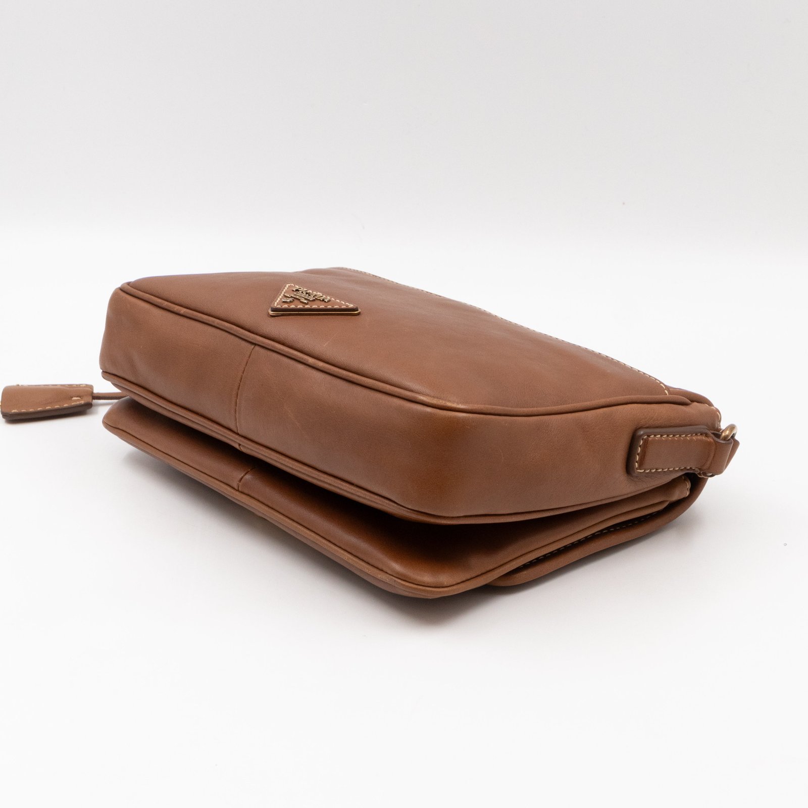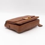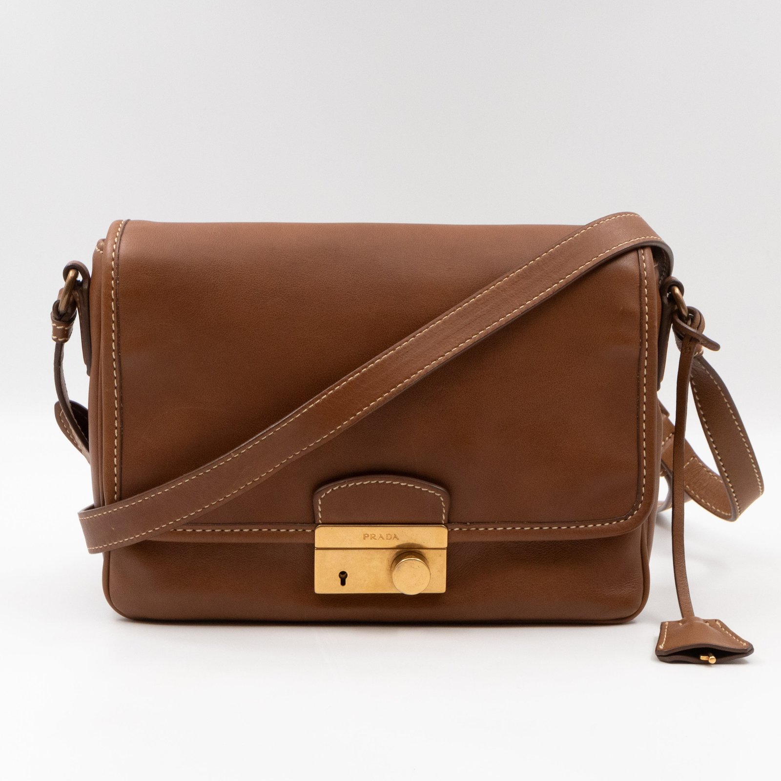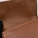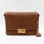 This is a Prada Sound flap crossbody bag. Made in brown leather. The bag features a gold-tone metal press lock and a leather shoulder strap. The flap opens to two compartments and all of which are natural canvas. Shoulder strap can be carried on the shoulder or crossbody.