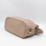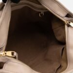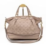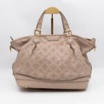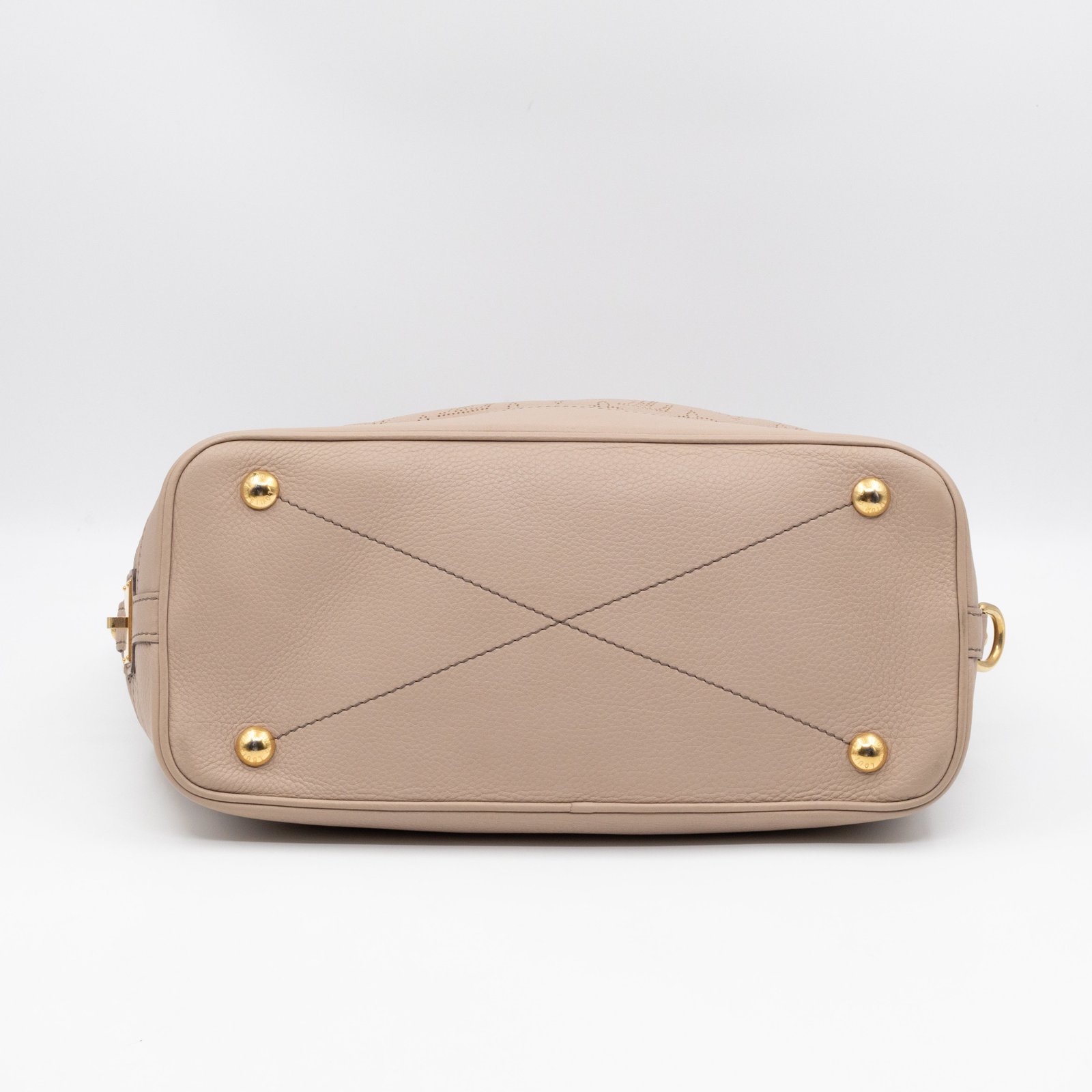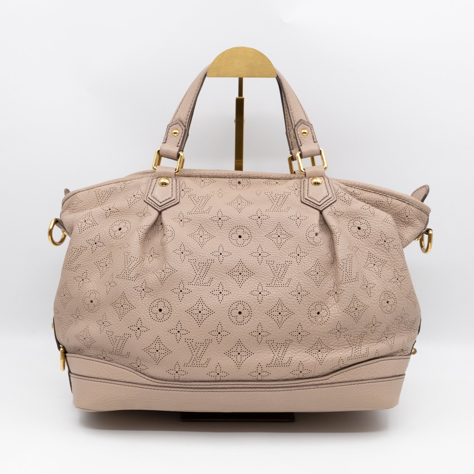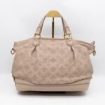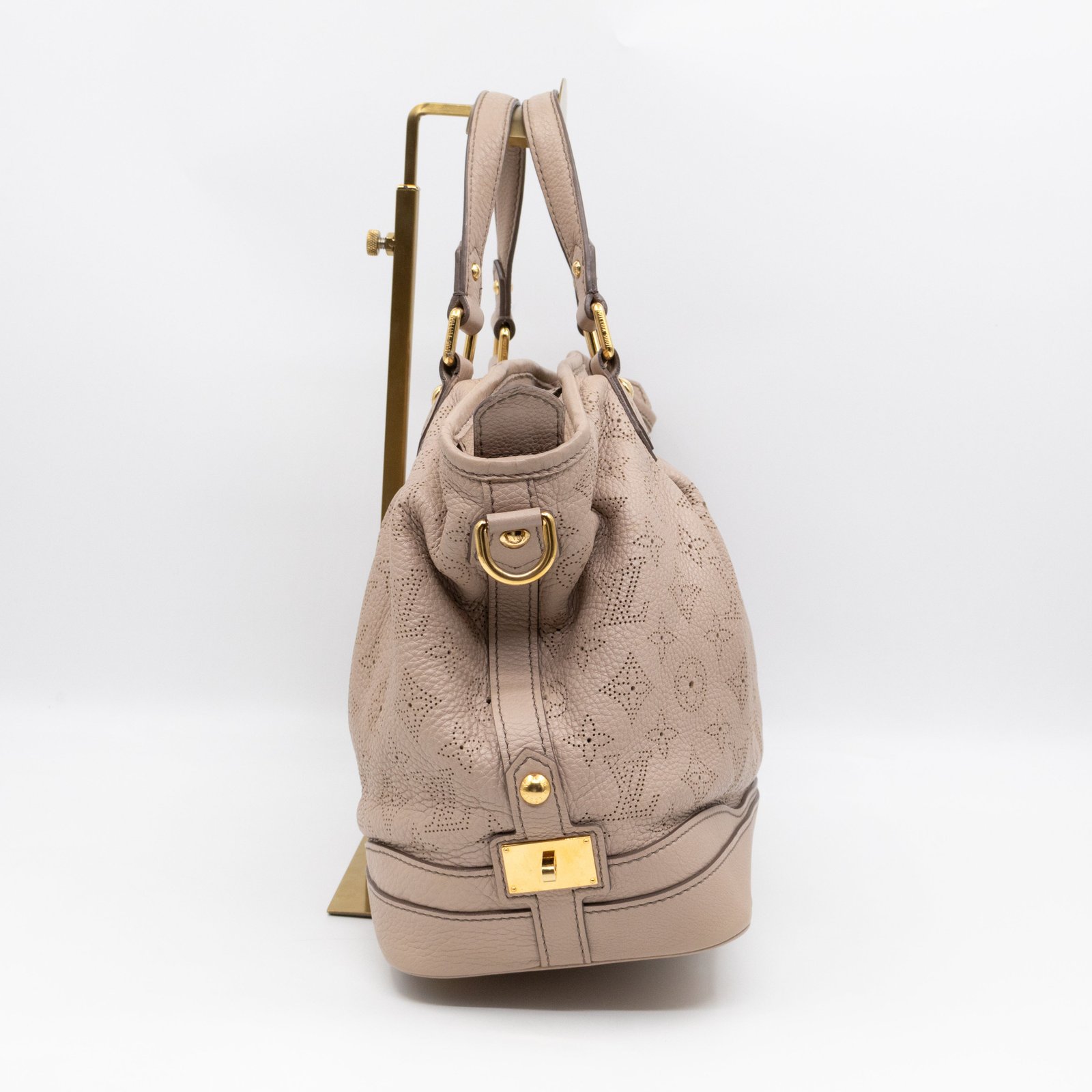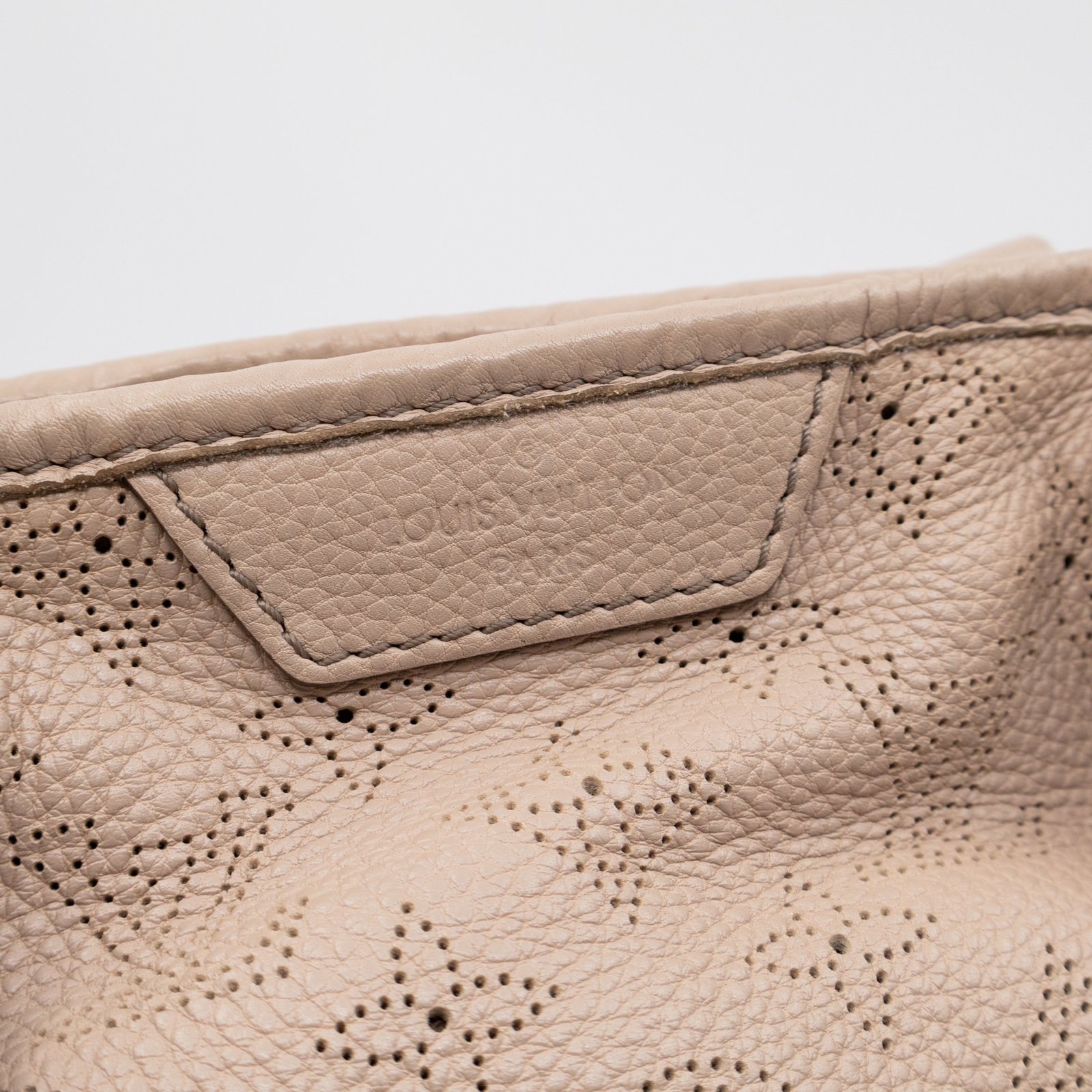 This is the Stellar PM Mahina from Louis Vuitton. Stylish combination of beige colored perforated mahina leather, with gold-tone hardware. Useful shoulder bag with removable shoulder strap for crossbody use and flat handles for comfortable carrying. It’s soft shape has plenty of space for everyday items. This opens to a grey microfiber interior with zipper and patch pockets.