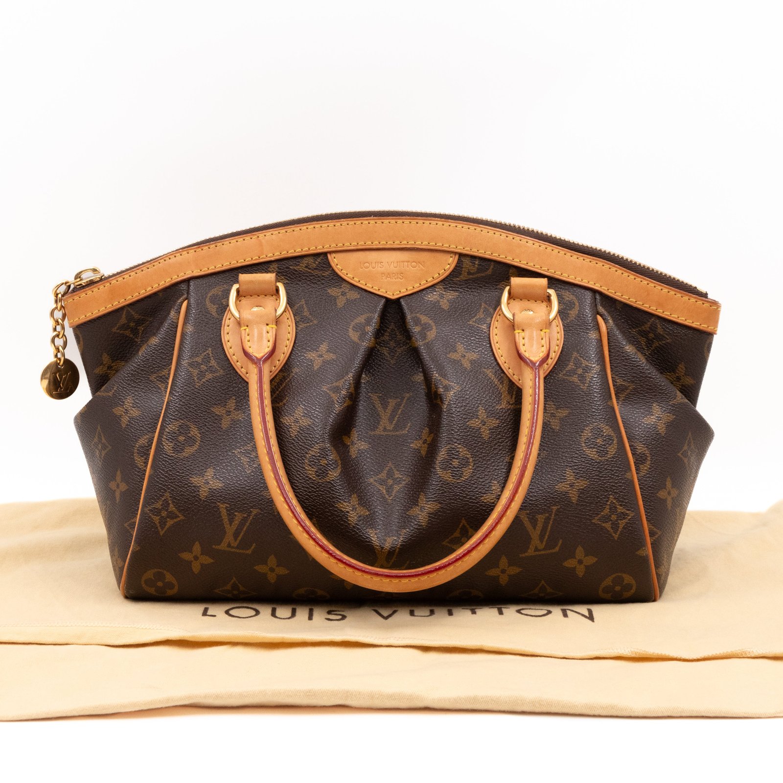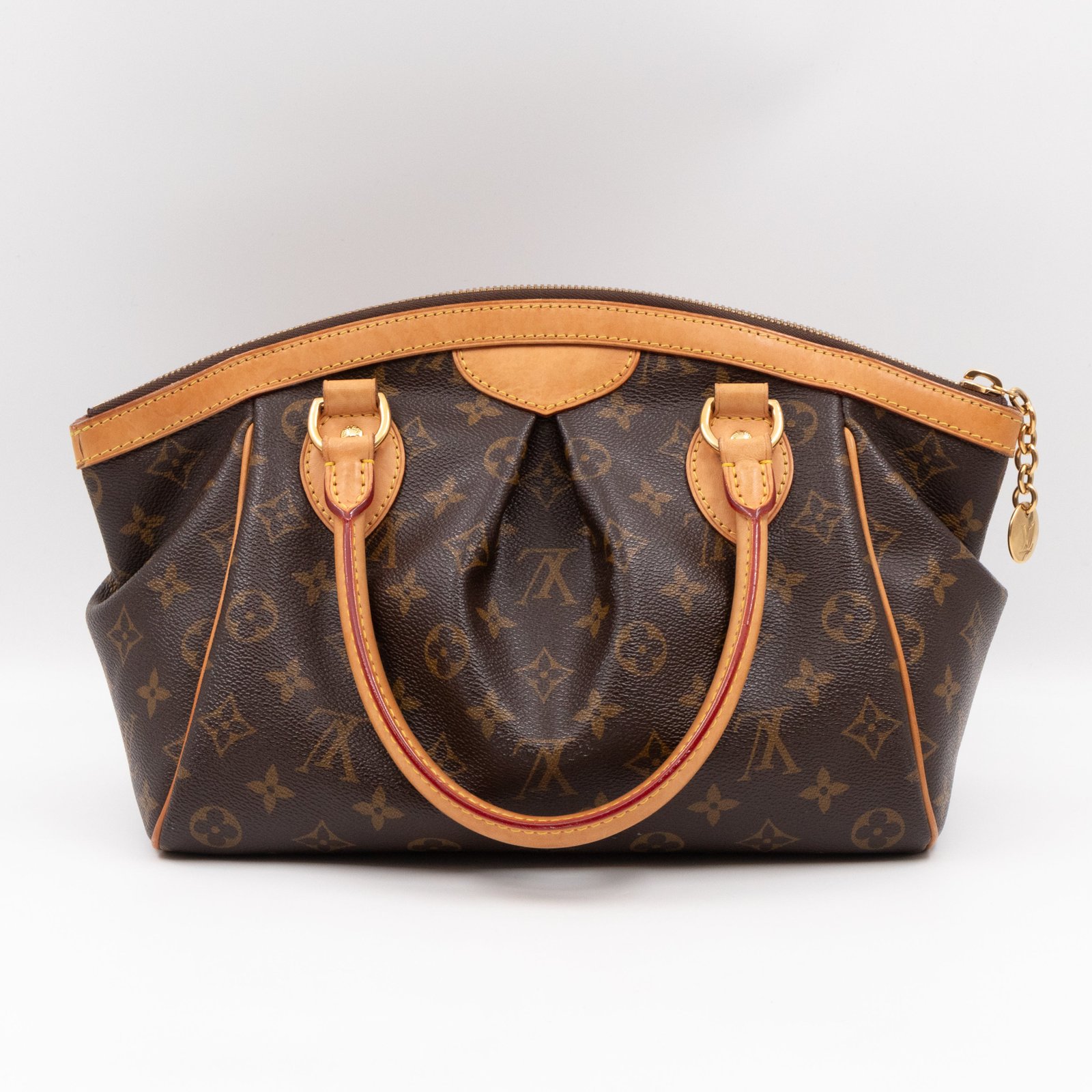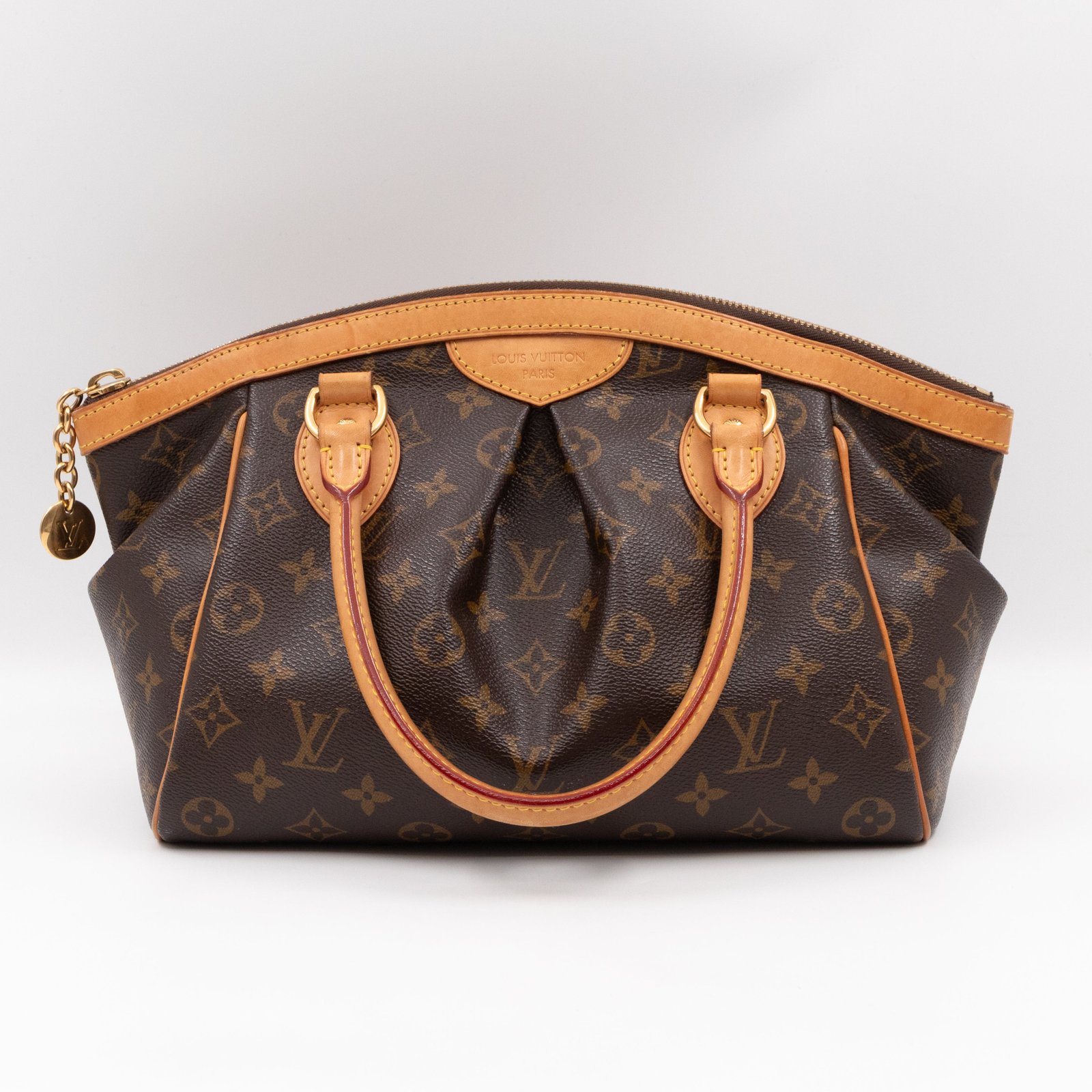 This is the Louis Vuitton Tivoli PM. Handy and classic style with dual handles, in a smaller version. Made with monogram canvas with vachetta leather accents and gold-tone hardware. Good size to carry all everyday items, with zipper on top to keep things safe.