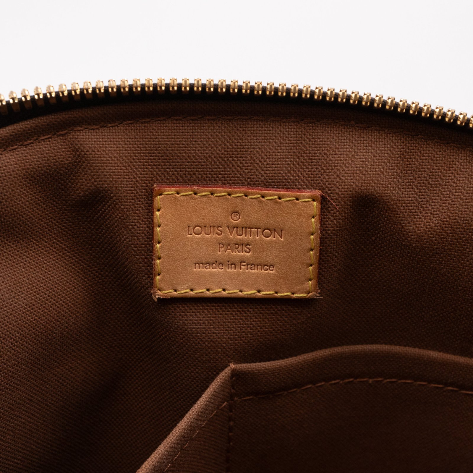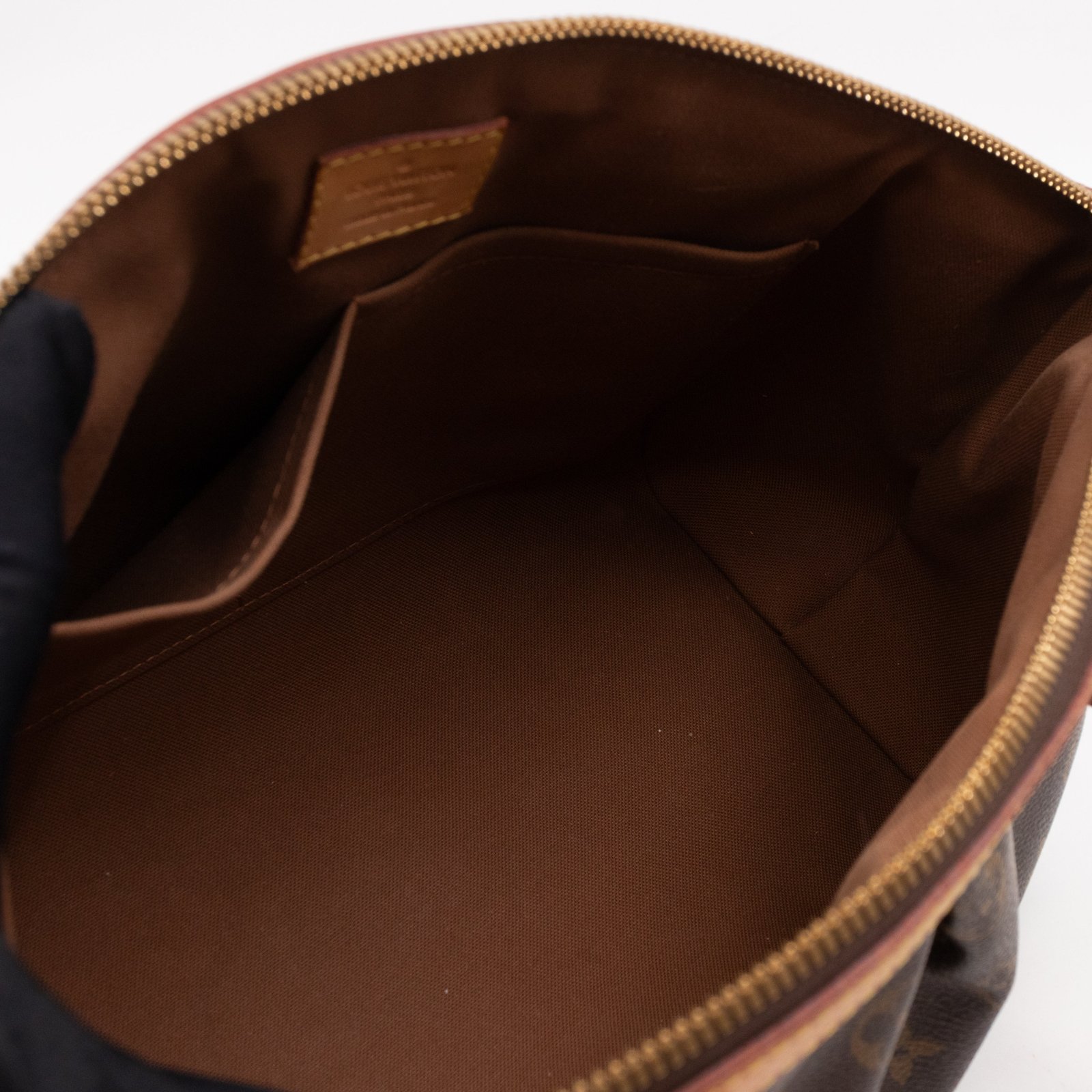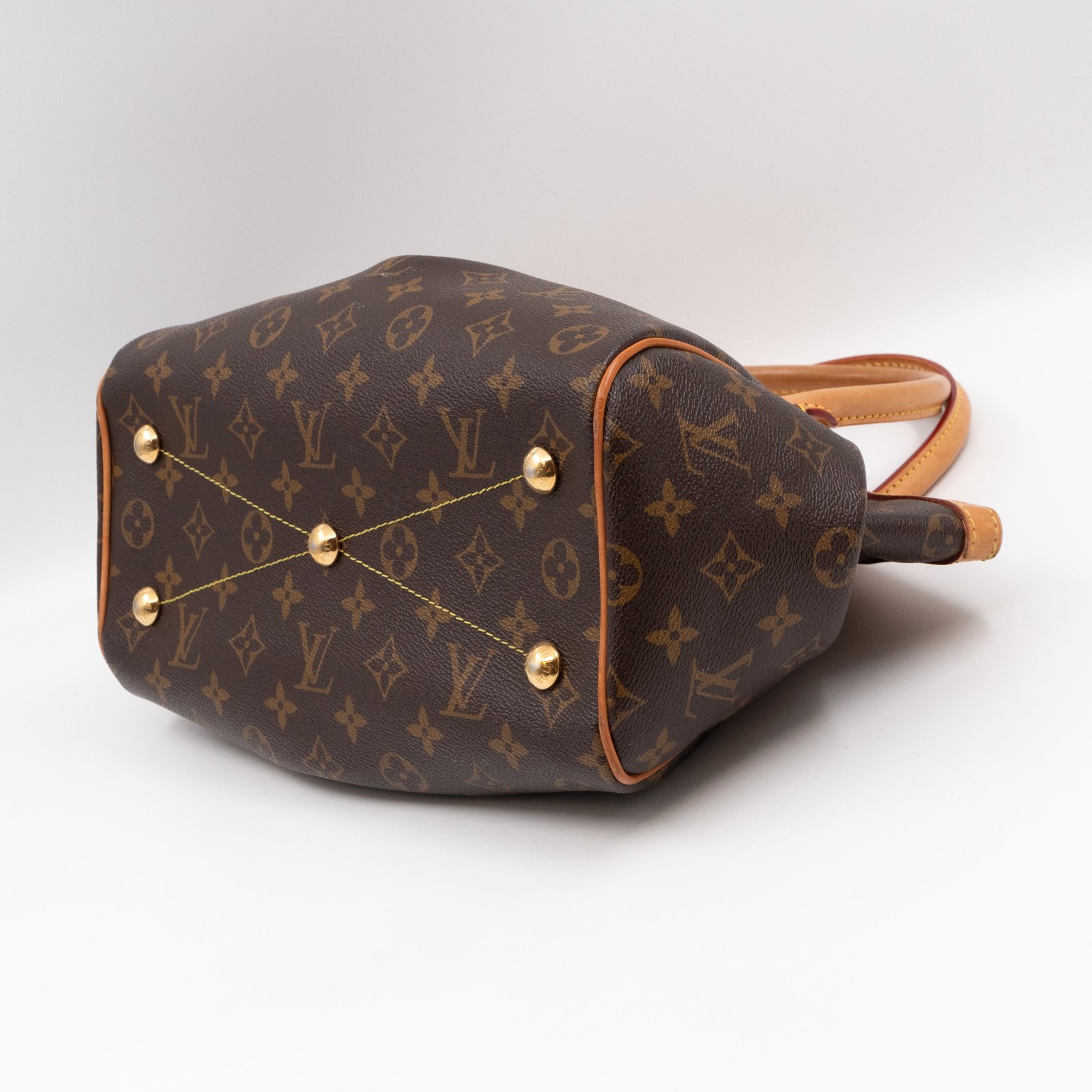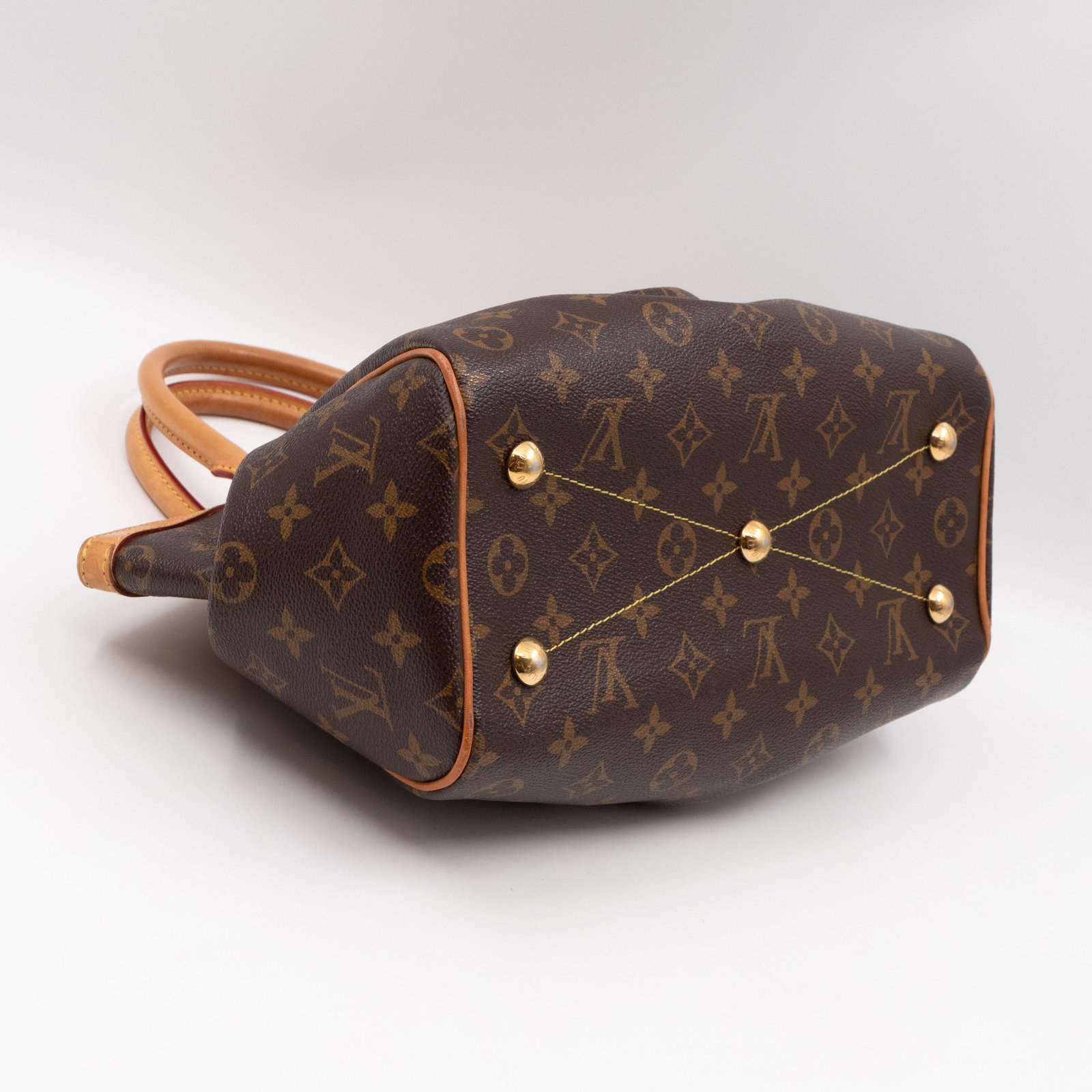 This is the Louis Vuitton Tivoli PM. Handy and classic style with dual handles, in a smaller version. Made with monogram canvas with vachetta leather accents and gold-tone hardware. Good size to carry all everyday items, with zipper on top to keep things safe.
